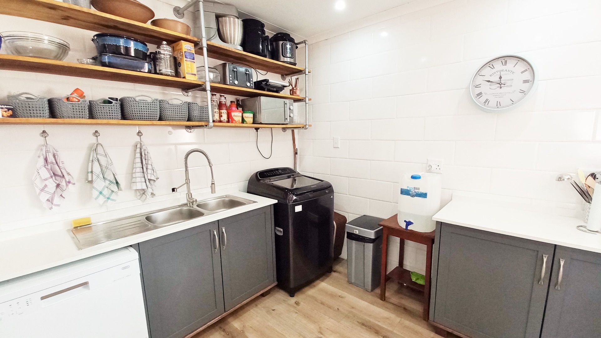 The heart of this home is its spacious kitchen, designed for both functionality and style. It boasts modern grey base cabinets, white countertops, and a sleek white subway tile backsplash. Equipped with a new stainless steel gas range and oven, along with a dishwasher and integrated laundry machine, this kitchen is a culinary delight. A large, mobile wooden island offers additional workspace and casual dining options, complemented by open shelving for accessible storage.
