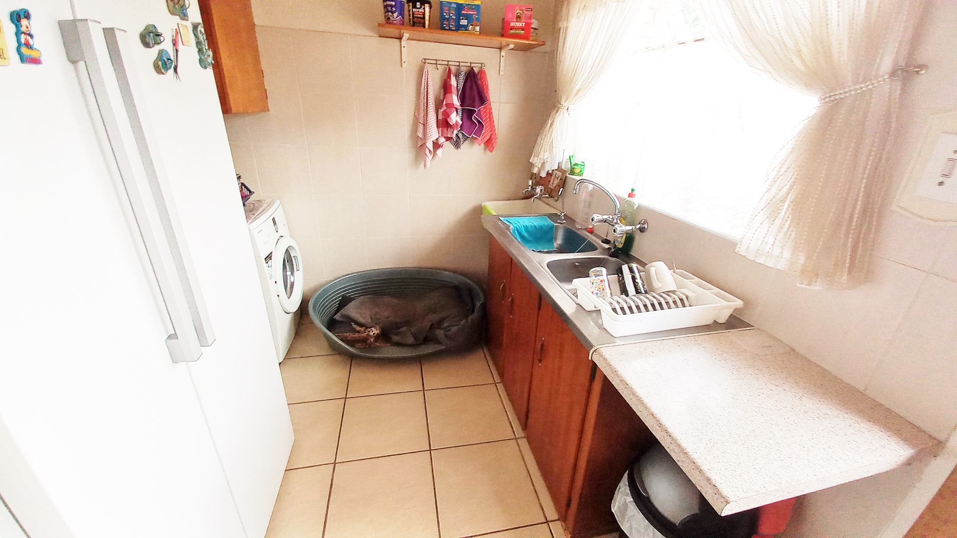 The functional kitchen boasts L-shaped wood-toned cabinetry, light countertops, and an integrated breakfast counter. There is generous storage and workspace. A dedicated isolated laundry area adds to the home's convenience.