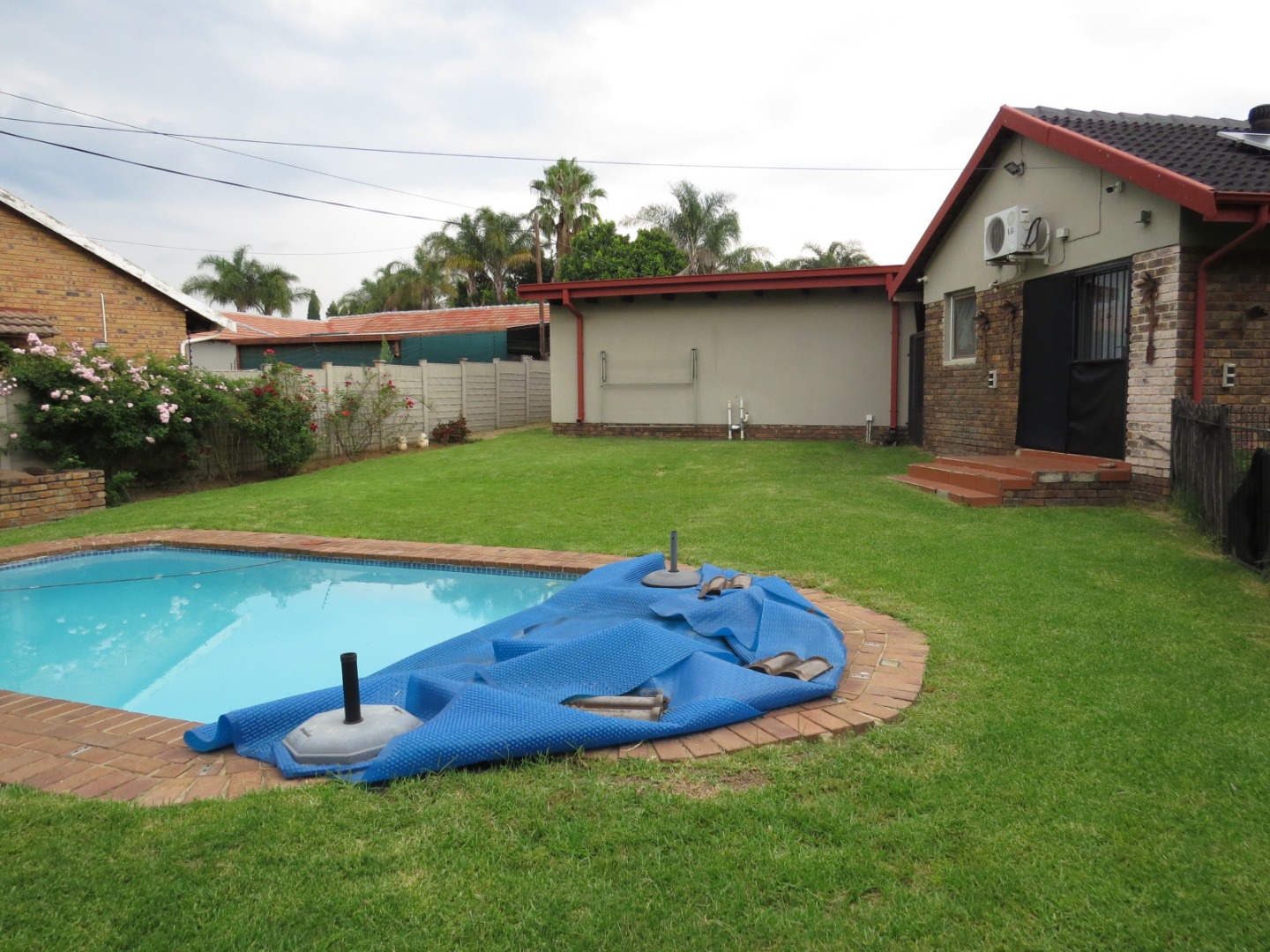 Outside, the generous 1000 sqm erf provides a private oasis, complete with a refreshing swimming pool and a well-maintained garden. An enclosed patio offers versatile space for relaxation or entertaining. The property also includes a double garage and additional parking for three vehicles, ensuring ample space for residents and guests.