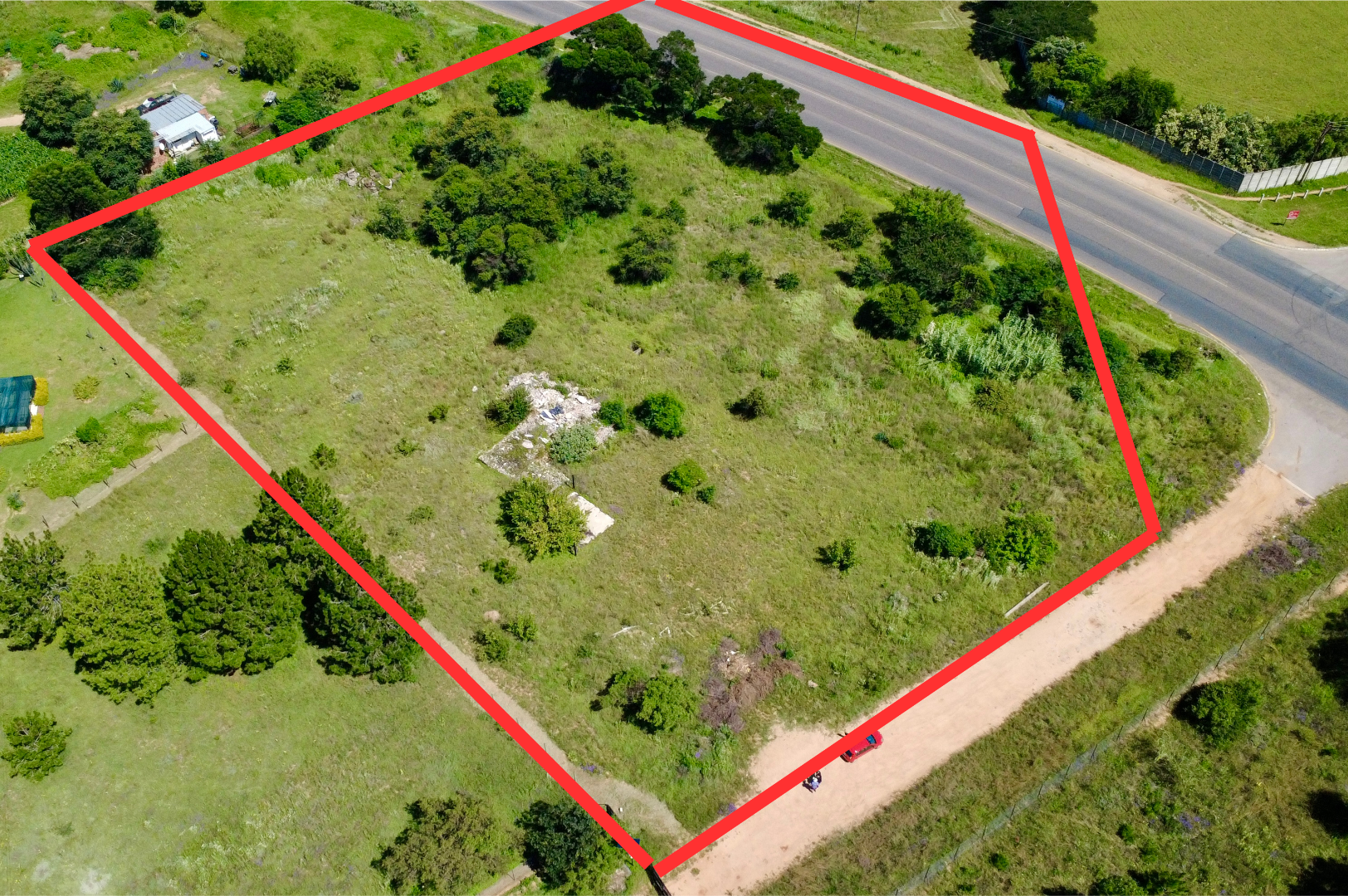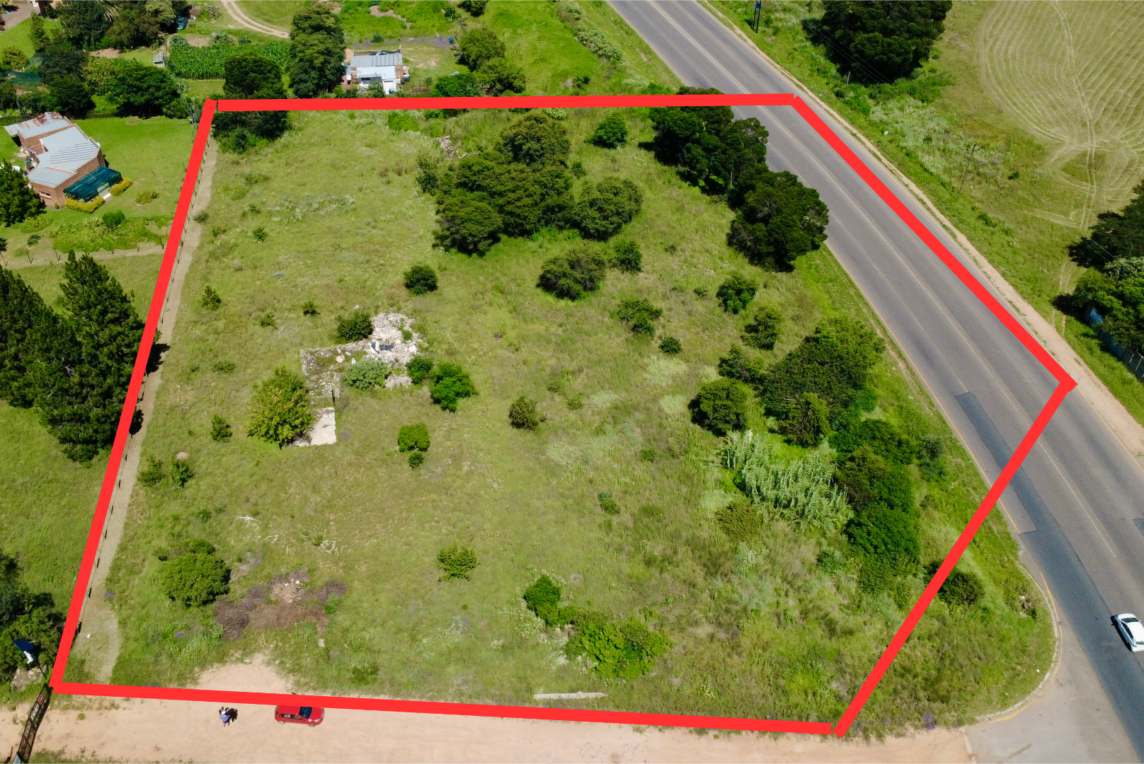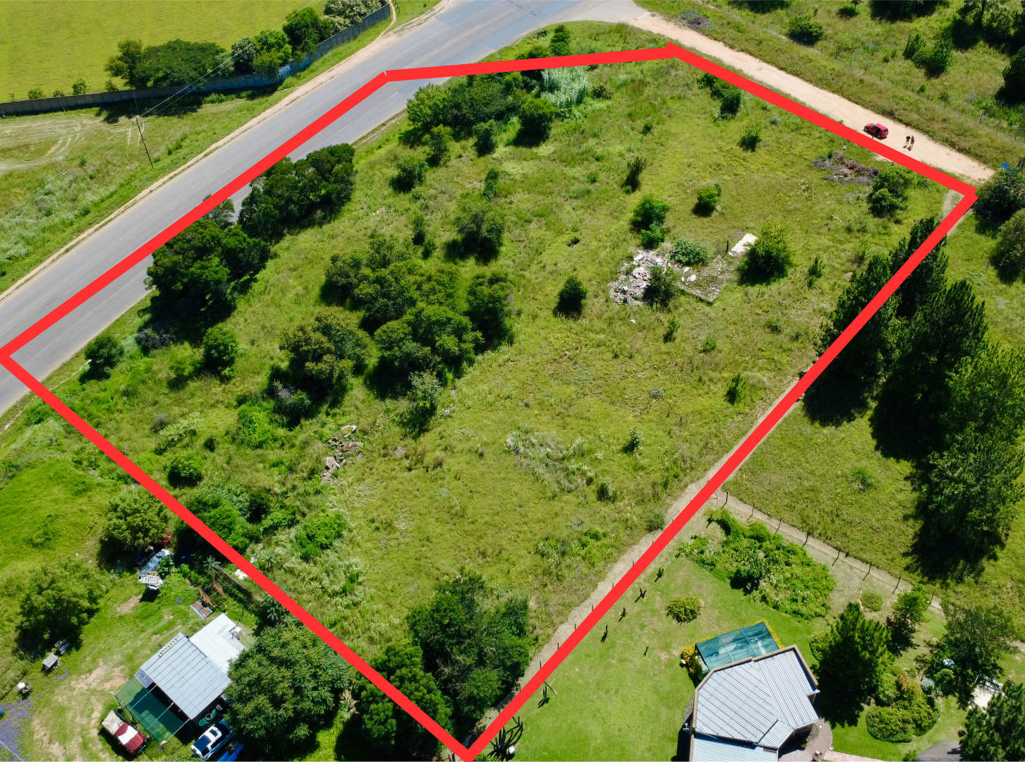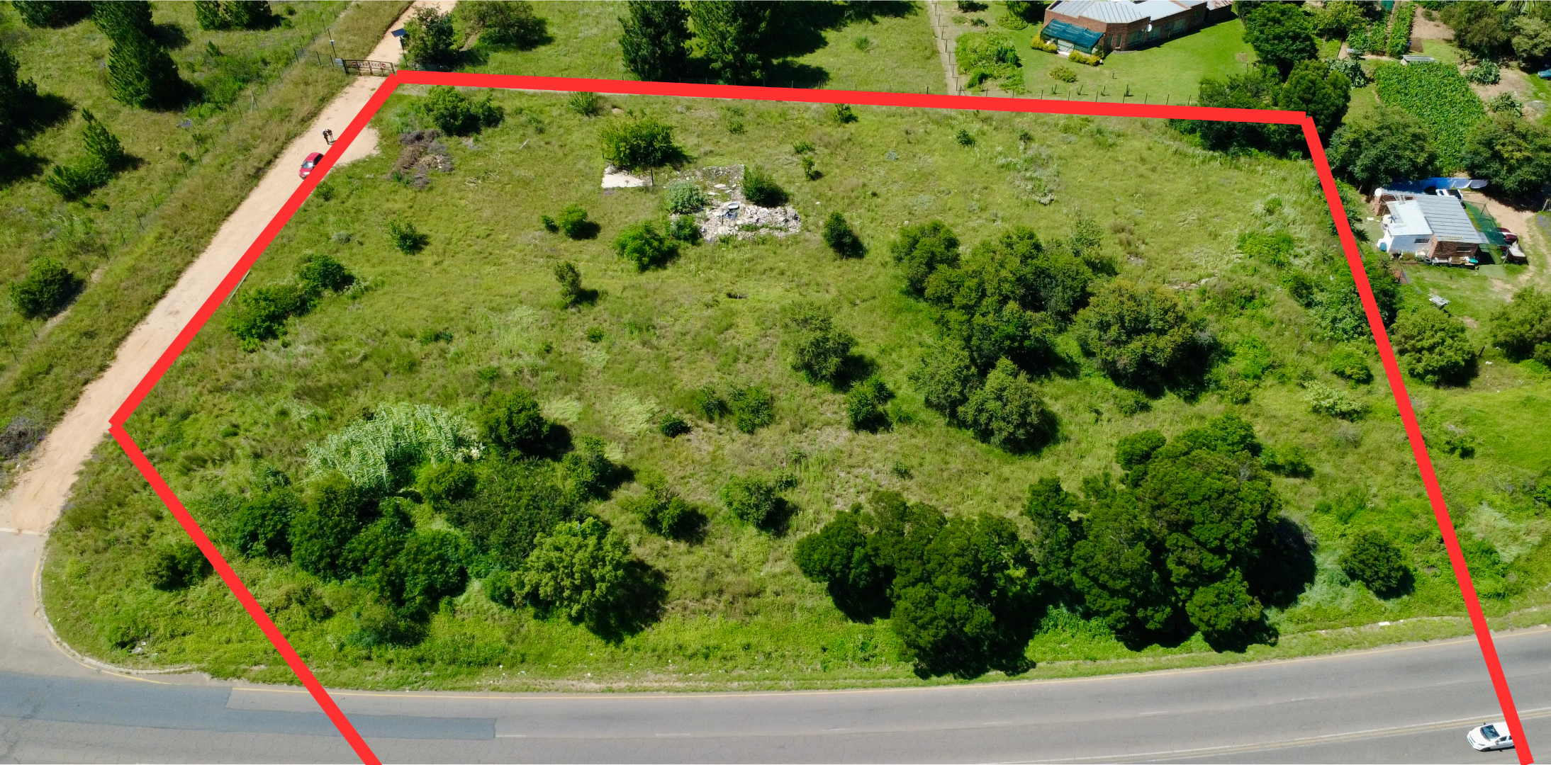 Currently presenting as a natural canvas, the property is characterized by its abundant greenery and a generally flat terrain.