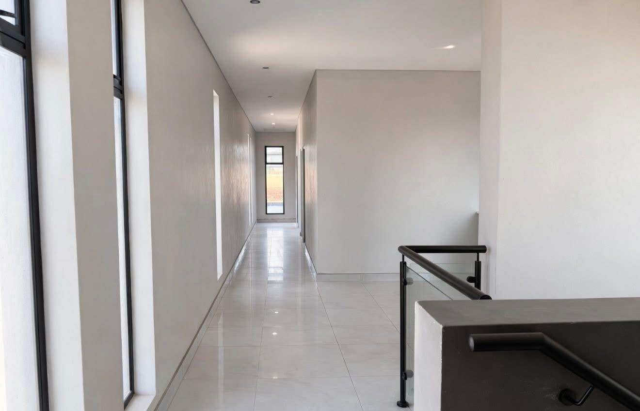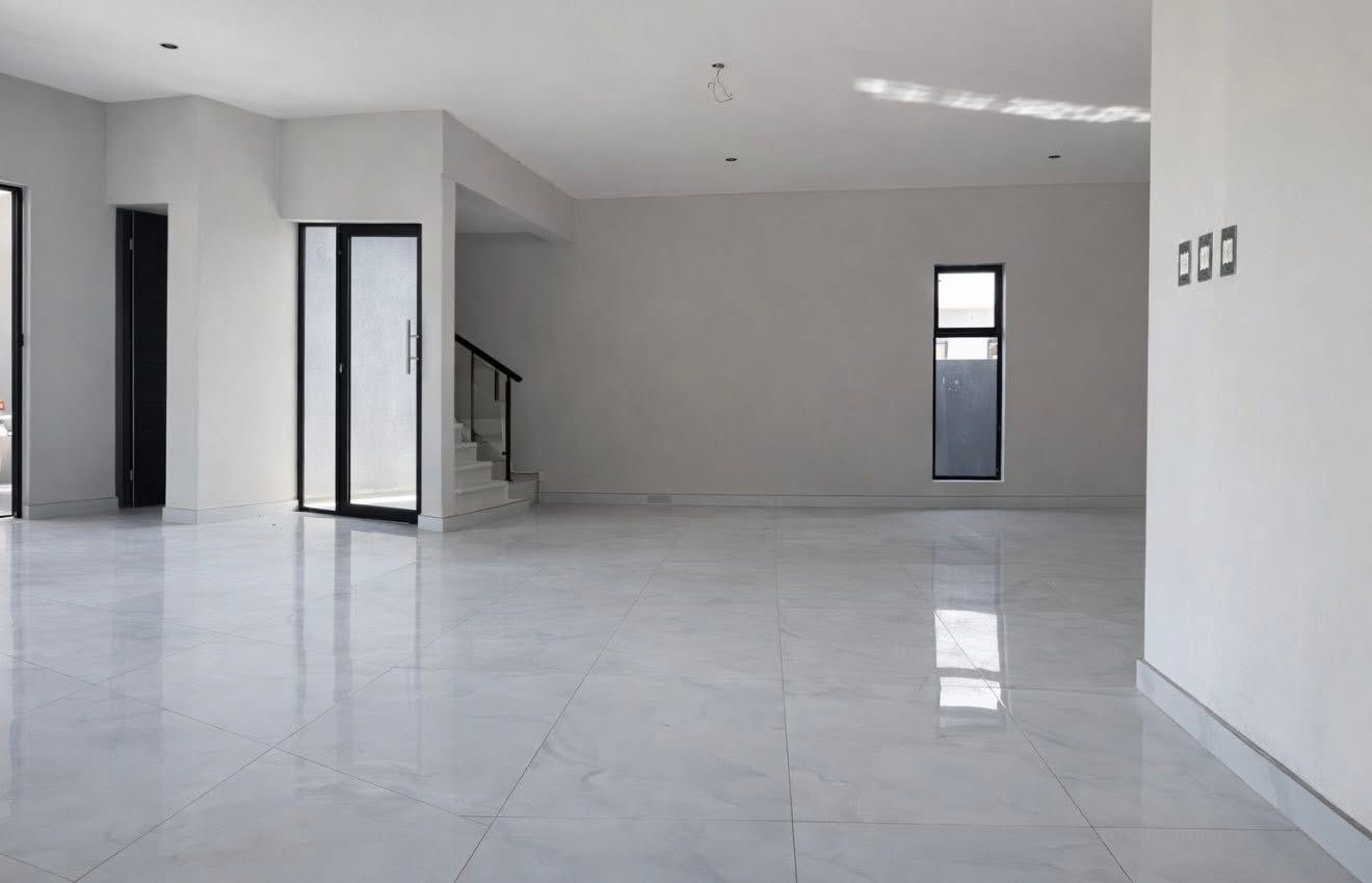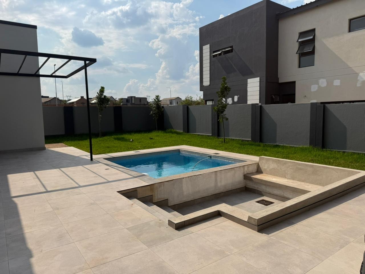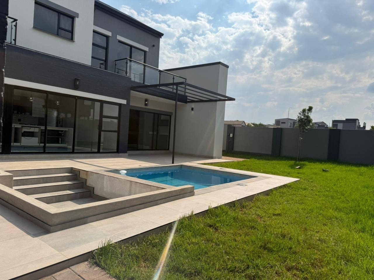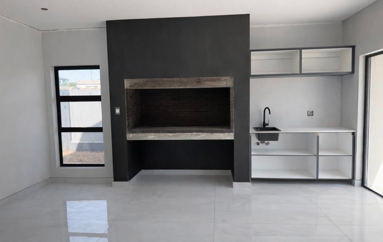 This contemporary residence, nestled within a secure estate, offers a sophisticated lifestyle with its striking modern architectural design. The property boasts a sleek grey and white facade, complemented by dark stone cladding, creating impressive kerb appeal. Step inside to discover an open-concept layout featuring a spacious lounge and dining area, perfect for both relaxation and entertaining. The heart of the home is a state-of-the-art kitchen, equipped with sleek dark grey cabinetry, light quartz countertops, and a large island with a gas cooktop, all set against glossy light grey floor tiles. High ceilings and abundant natural light, enhanced by large windows and a skylight, create an airy and inviting atmosphere throughout. Modern light fixtures add a touch of elegance. The home offers four well-appointed bedrooms and three and a half bathrooms, including two en-suite bathrooms for ultimate comfort and privacy. A convenient guest toilet is also available. Each space is designed with clean lines and neutral palettes, providing a versatile backdrop for personal style. Outdoor living is a highlight, with a private plunge pool and a spacious tiled patio, ideal for al fresco dining and relaxation. A built-in braai area with an integrated sink extends entertaining possibilities. The well-maintained garden and lawn provide a tranquil green space, while a large paved driveway and double garage offer ample parking. Located within an estate, residents benefit from enhanced security, including access control. This modern home combines luxury, comfort, and practicality, making it an ideal choice for discerning buyers seeking a contemporary South African lifestyle. Key Features: * 4 Bedrooms, 3.5 Bathrooms (2 En-suite) * Modern Architectural Design * Sleek Kitchen with Gas Cooktop * Private Plunge Pool & Tiled Patio * Built-in Braai Area * Double Garage & Paved Driveway * High Ceilings & Ample Natural Light * Secure Estate Living * Erf Size: 585 sqm