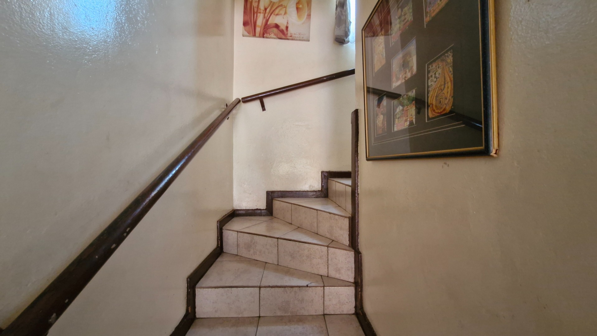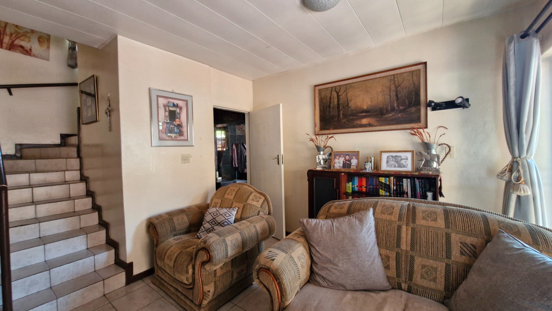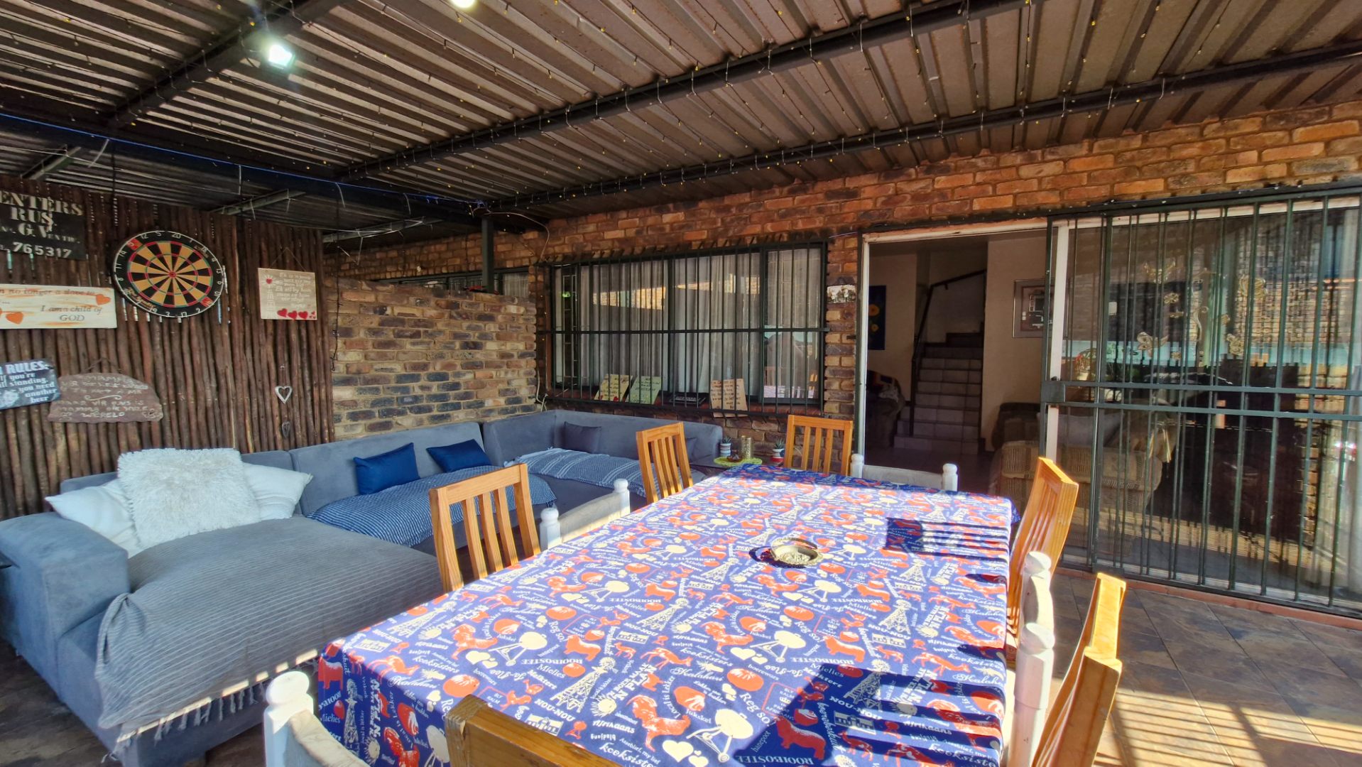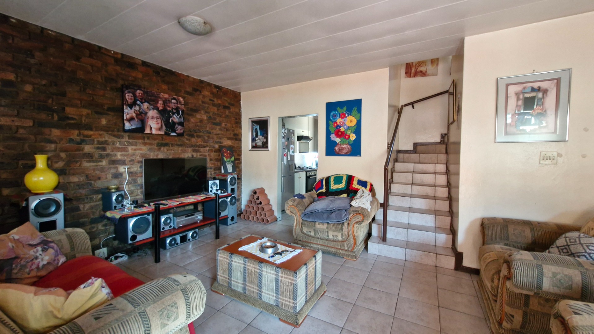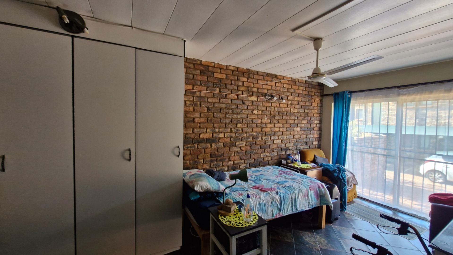 The accommodation comprises four generously proportioned bedrooms (one bedroom downstairs with en-suite bathroom), with two benefiting from private en-suite facilities, ensuring comfort and privacy for all occupants. The interior features include practical built-in cupboards and an exposed brick accent wall, adding a touch of character to the living spaces. Large windows, fitted with security bars, invite ample natural light while maintaining a secure environment.