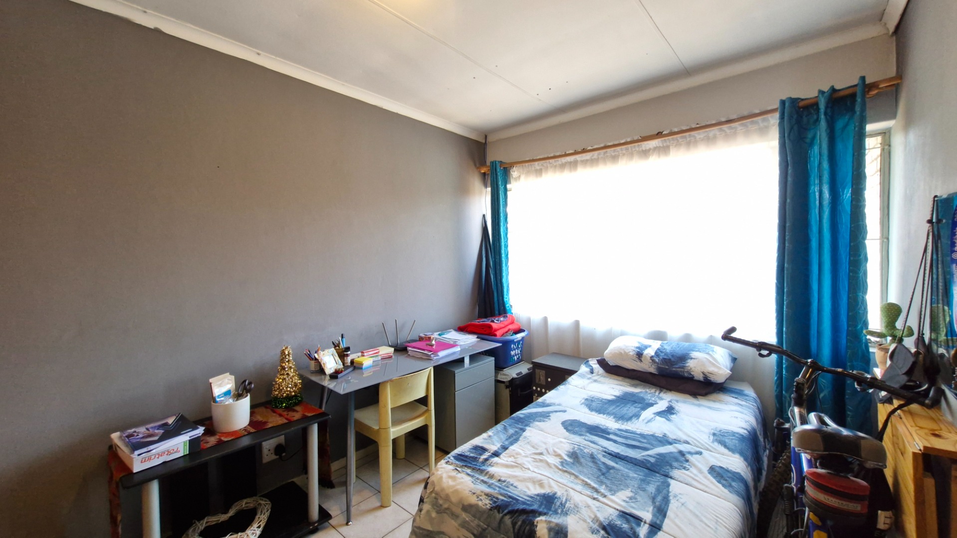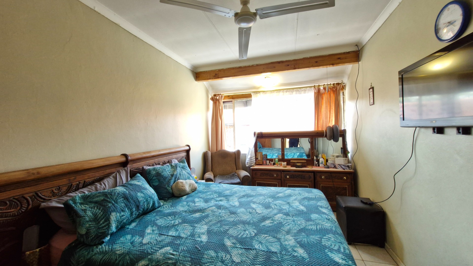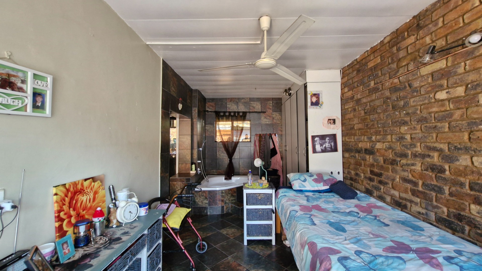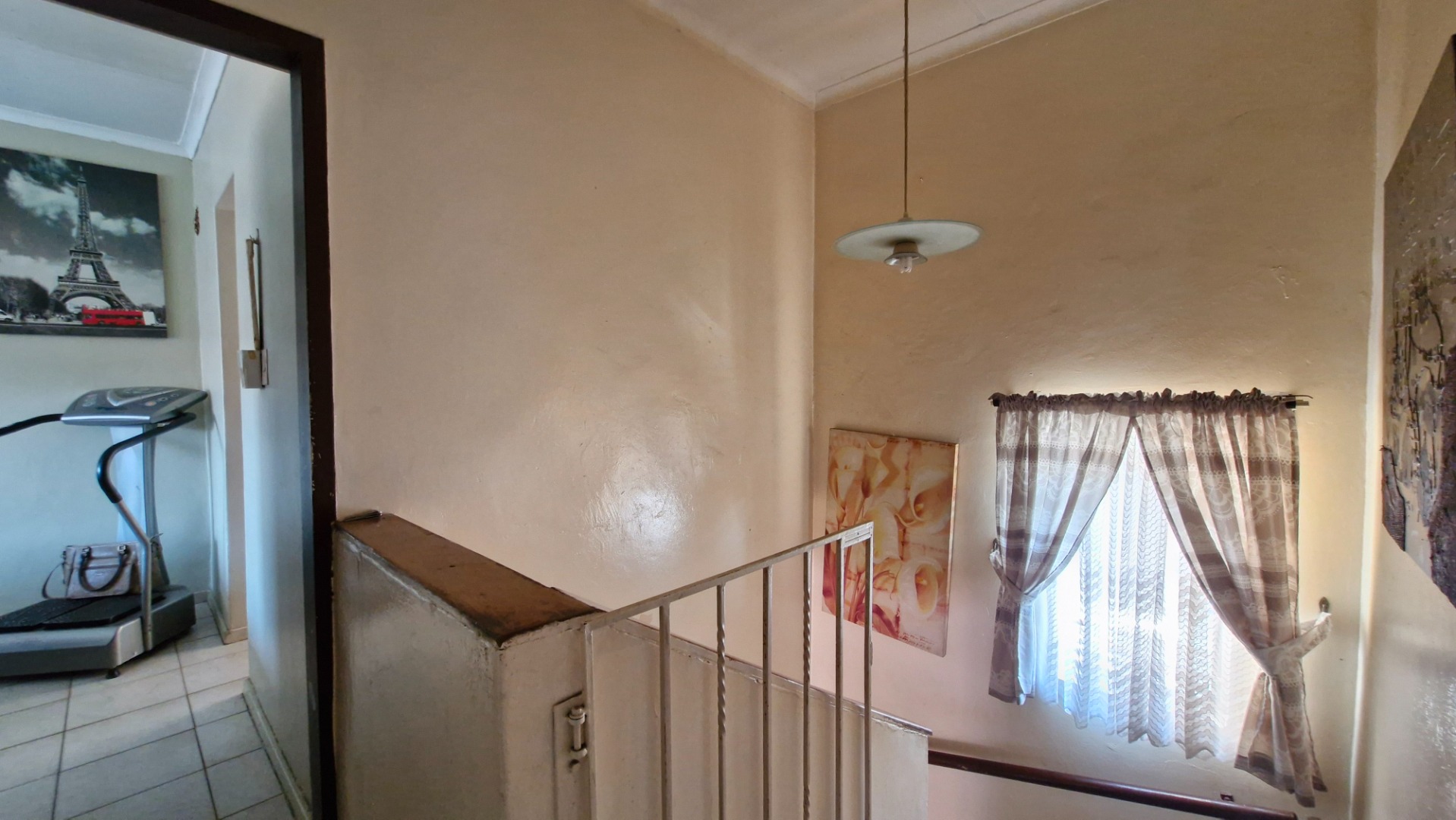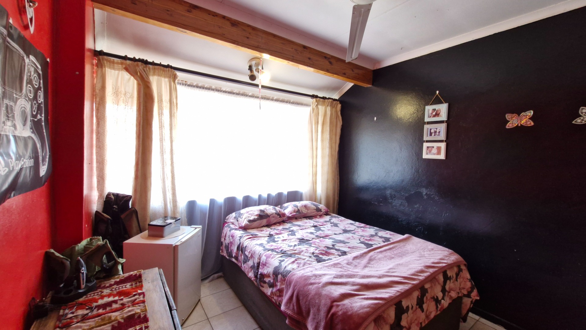 The accommodation comprises four generously proportioned bedrooms (one bedroom downstairs with en-suite bathroom), with two benefiting from private en-suite facilities, ensuring comfort and privacy for all occupants. The interior features include practical built-in cupboards and an exposed brick accent wall, adding a touch of character to the living spaces. Large windows, fitted with security bars, invite ample natural light while maintaining a secure environment.