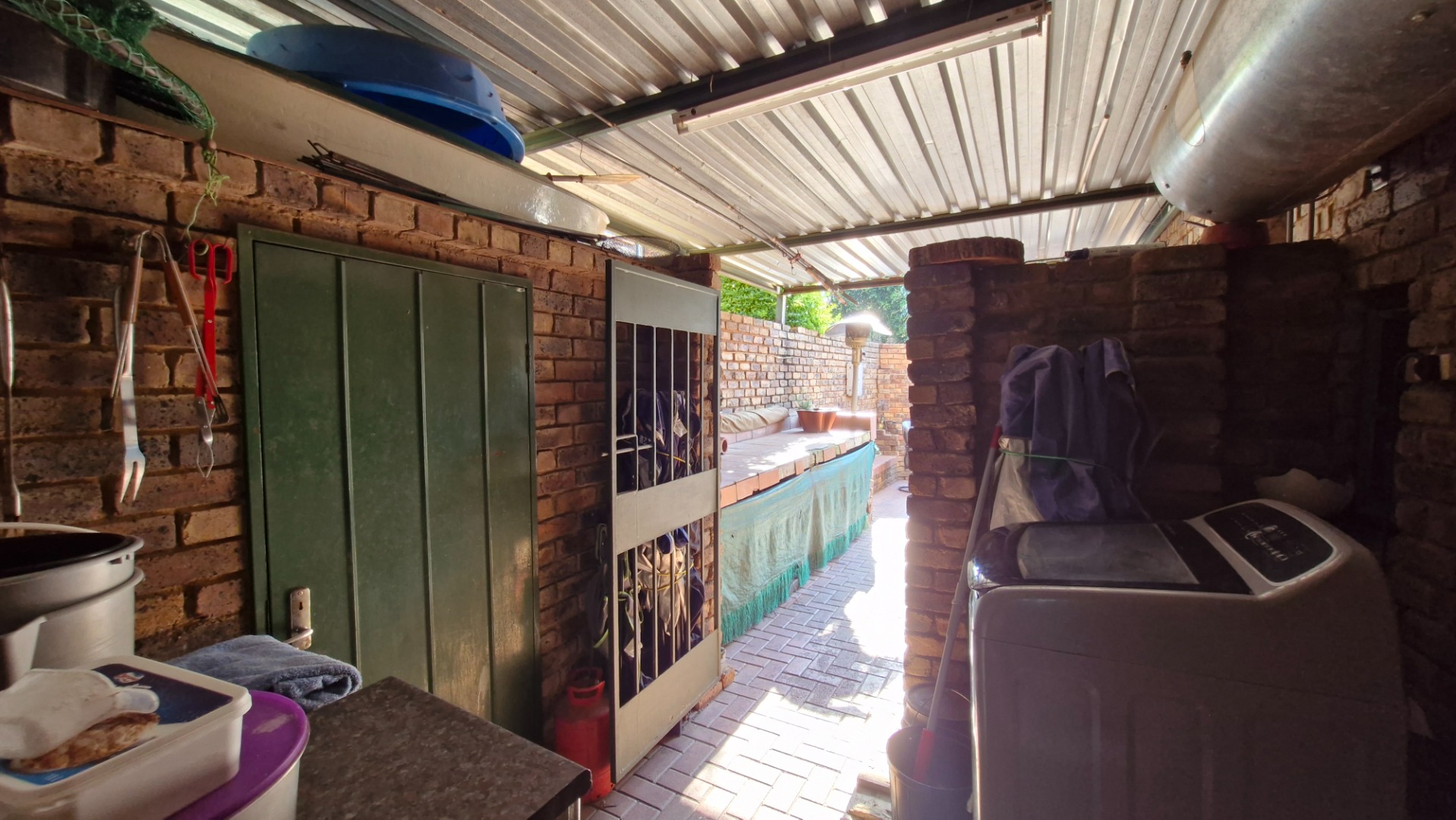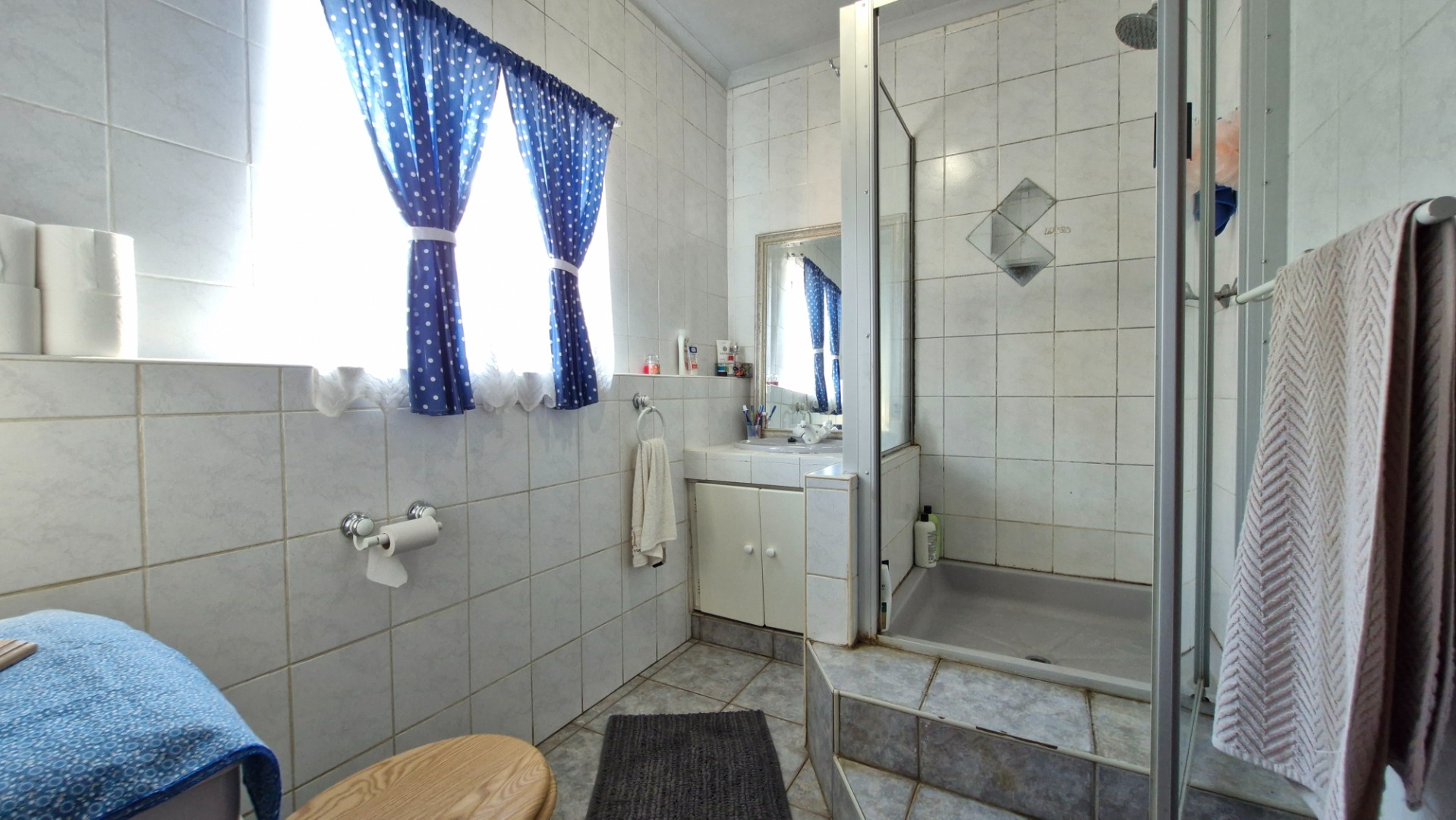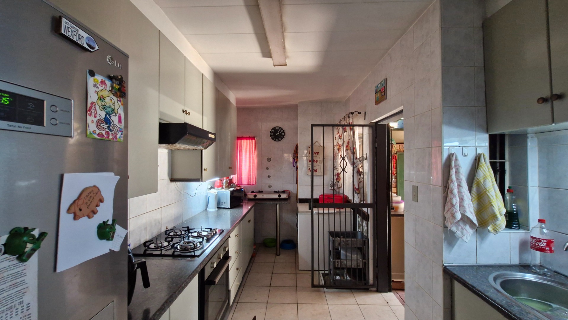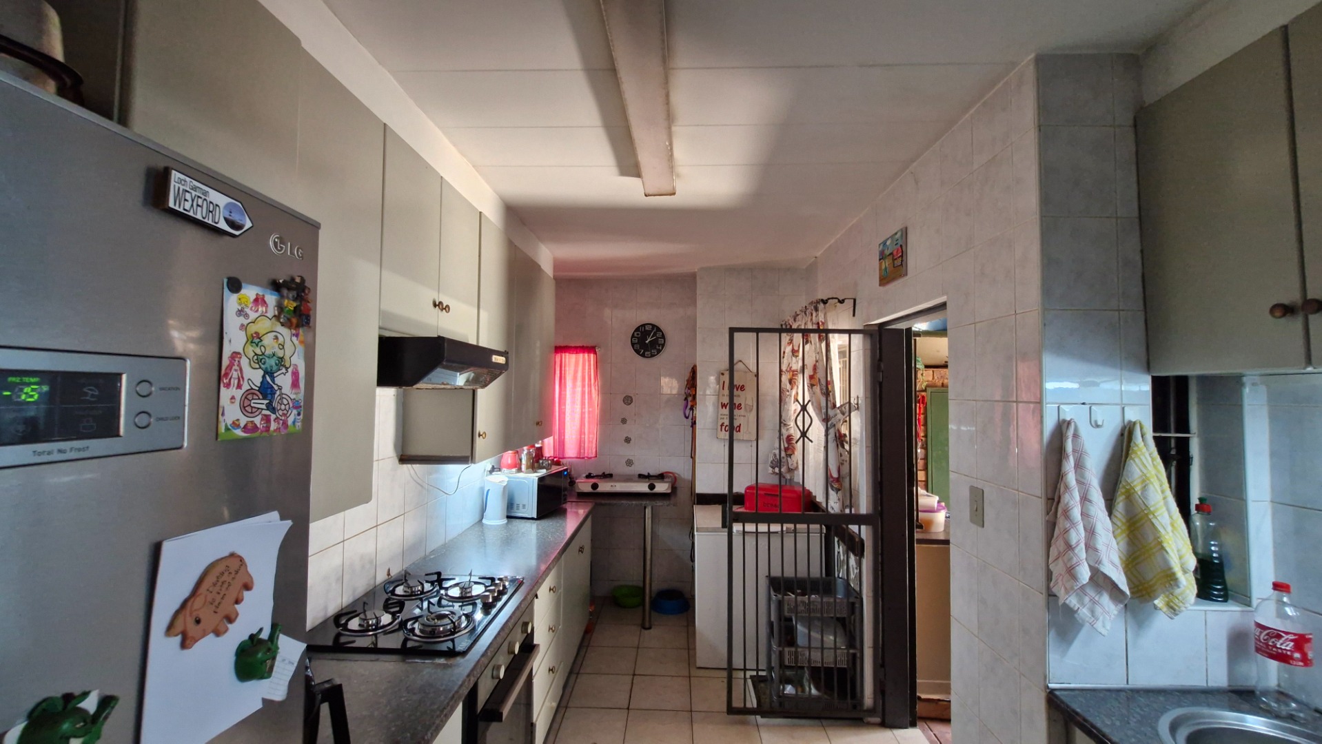 The accommodation comprises four generously proportioned bedrooms (one bedroom downstairs with en-suite bathroom), with two benefiting from private en-suite facilities, ensuring comfort and privacy for all occupants. The interior features include practical built-in cupboards and an exposed brick accent wall, adding a touch of character to the living spaces. Large windows, fitted with security bars, invite ample natural light while maintaining a secure environment.