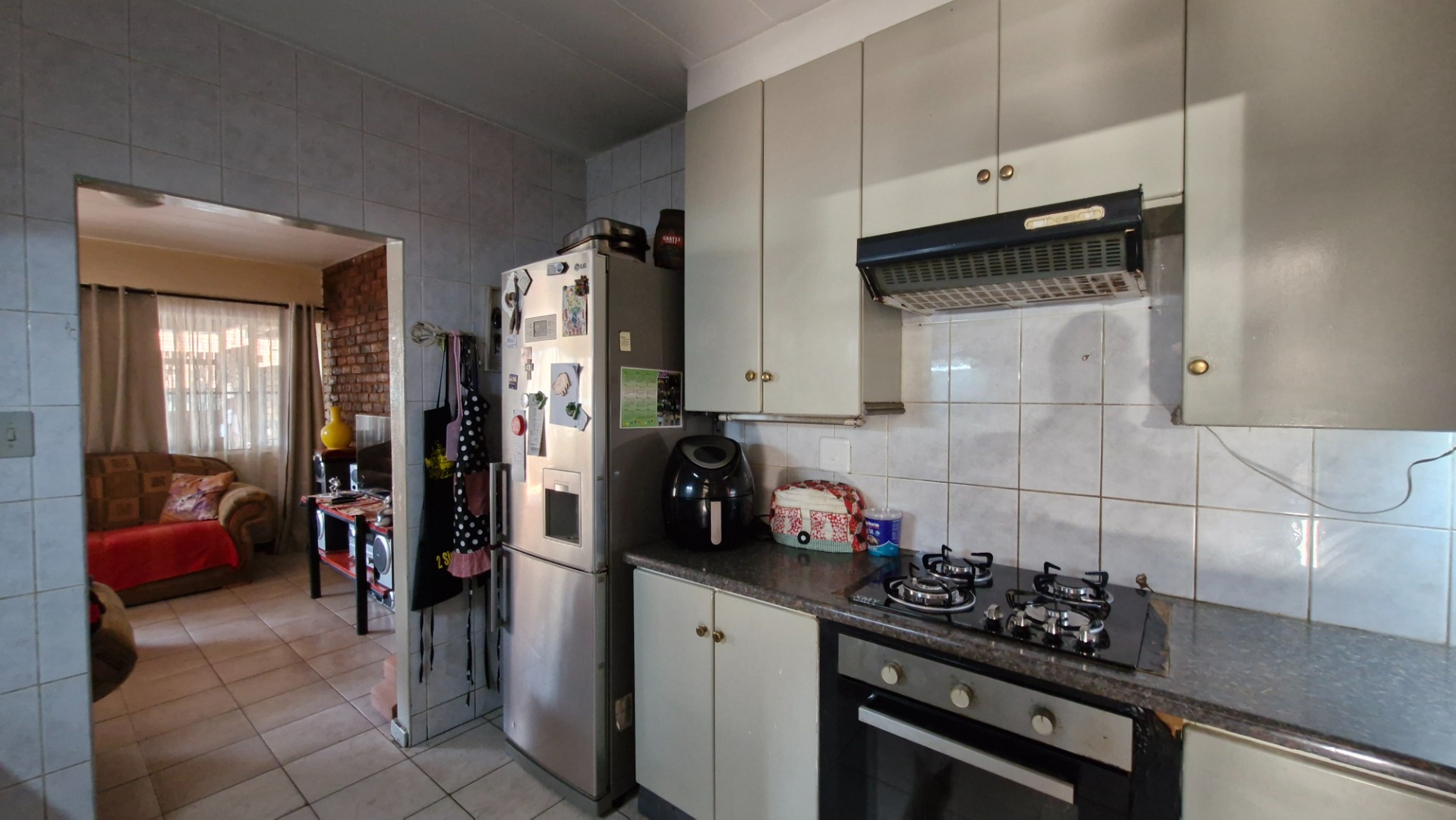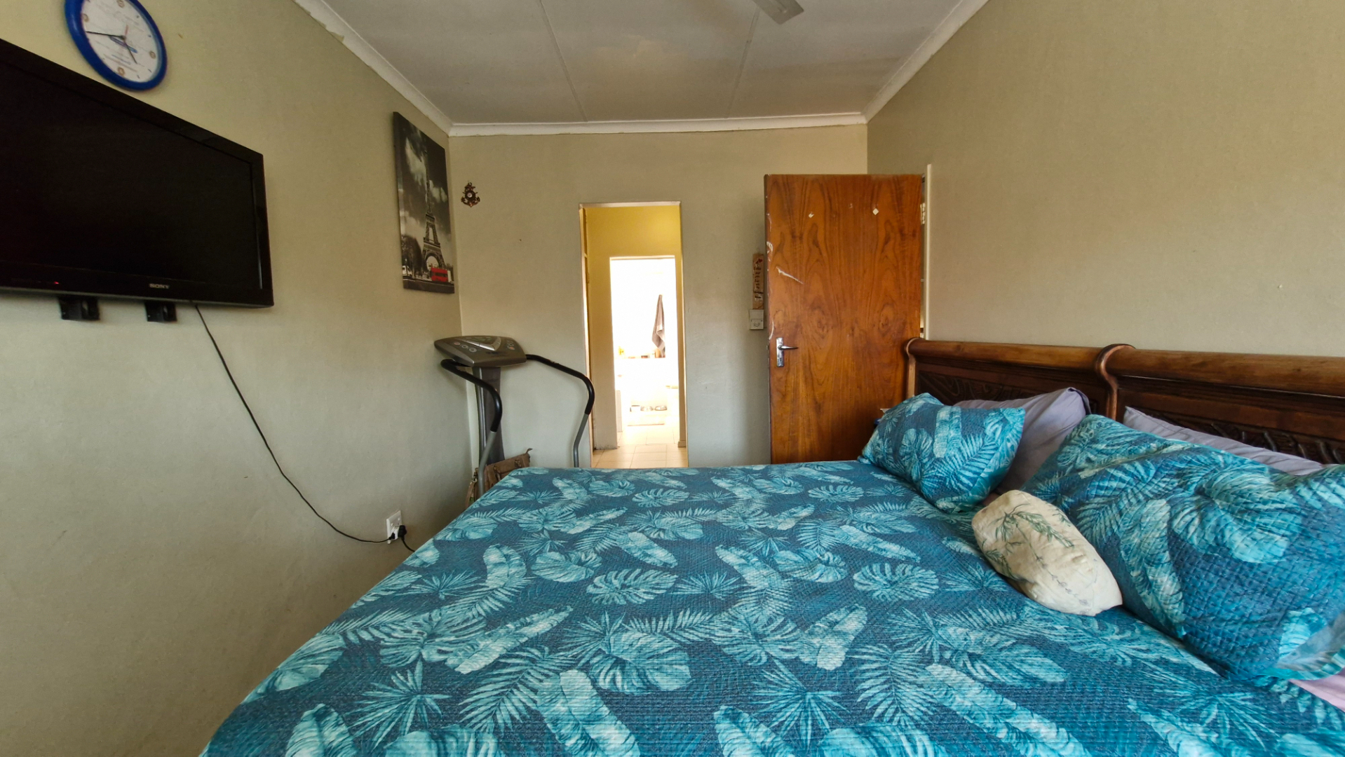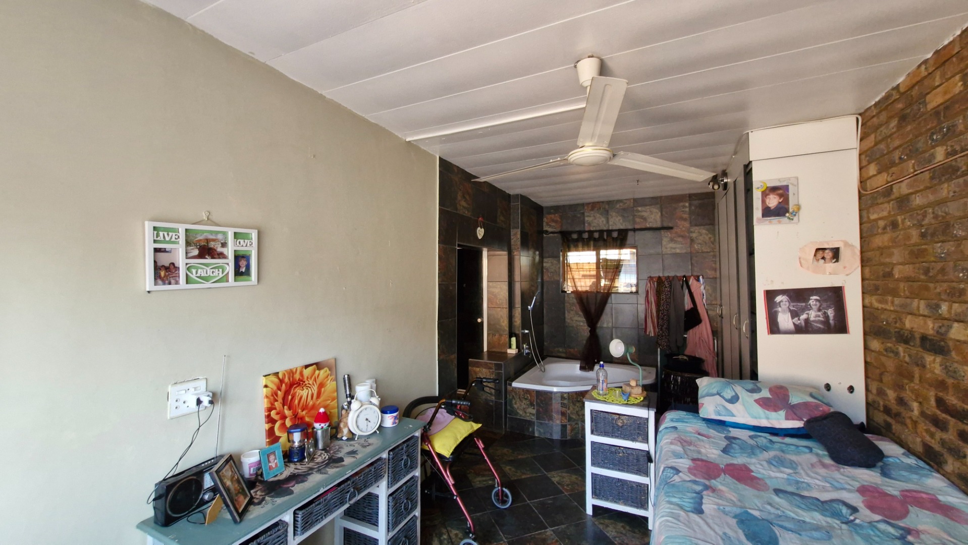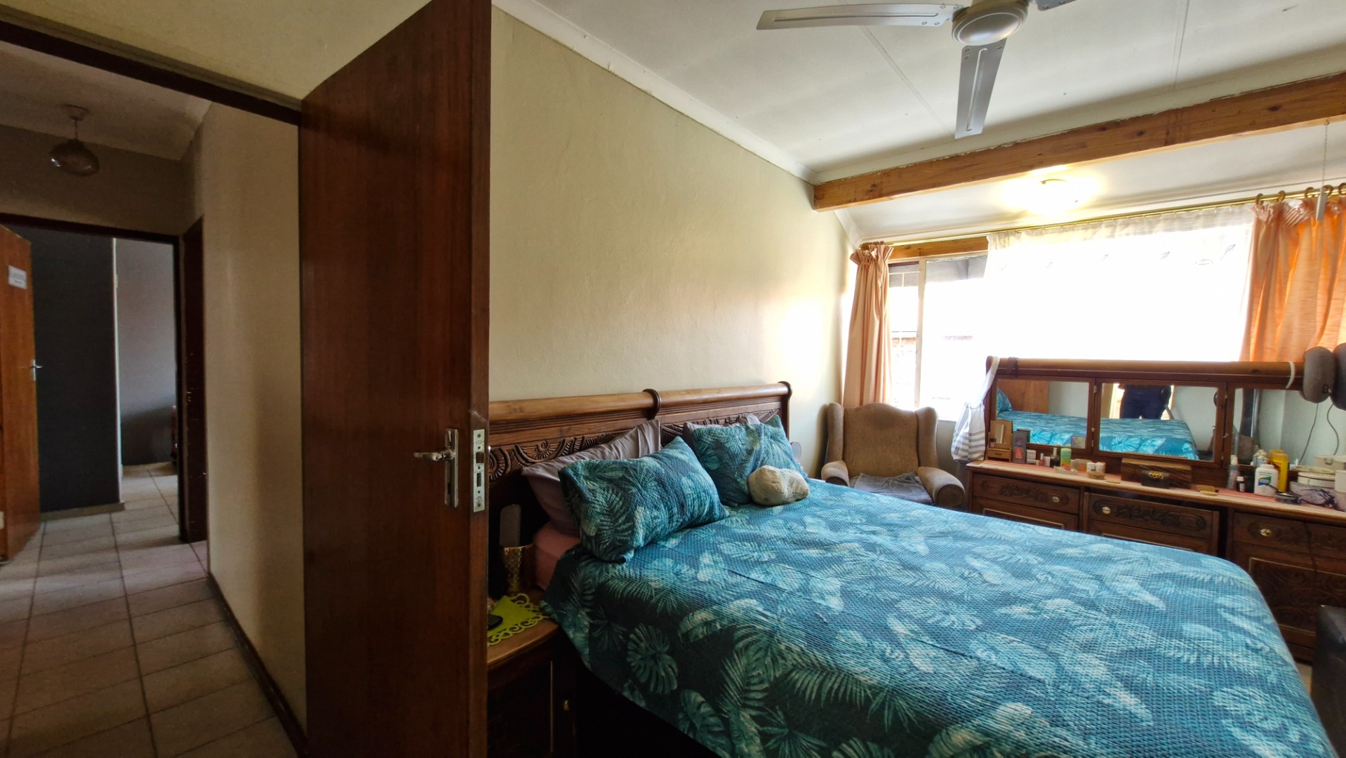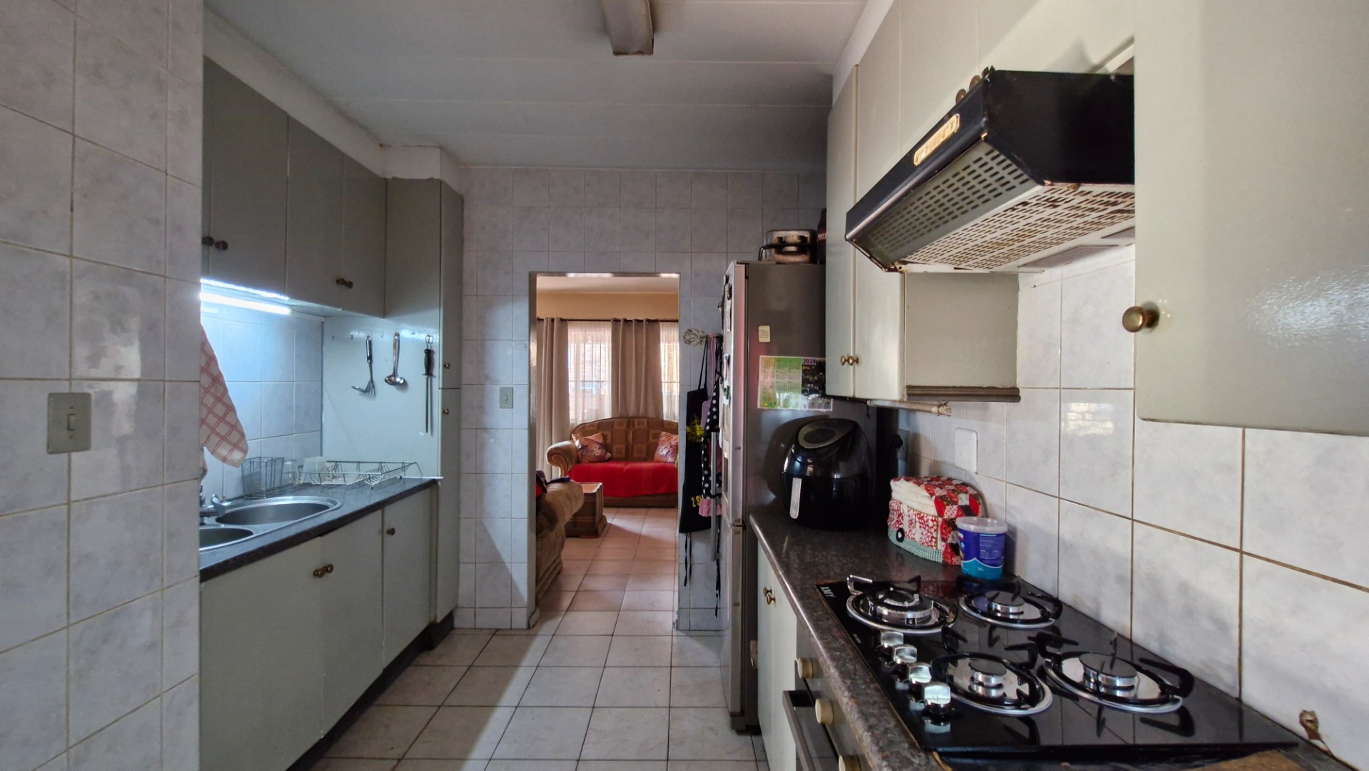 The accommodation comprises four generously proportioned bedrooms (one bedroom downstairs with en-suite bathroom), with two benefiting from private en-suite facilities, ensuring comfort and privacy for all occupants. The interior features include practical built-in cupboards and an exposed brick accent wall, adding a touch of character to the living spaces. Large windows, fitted with security bars, invite ample natural light while maintaining a secure environment.