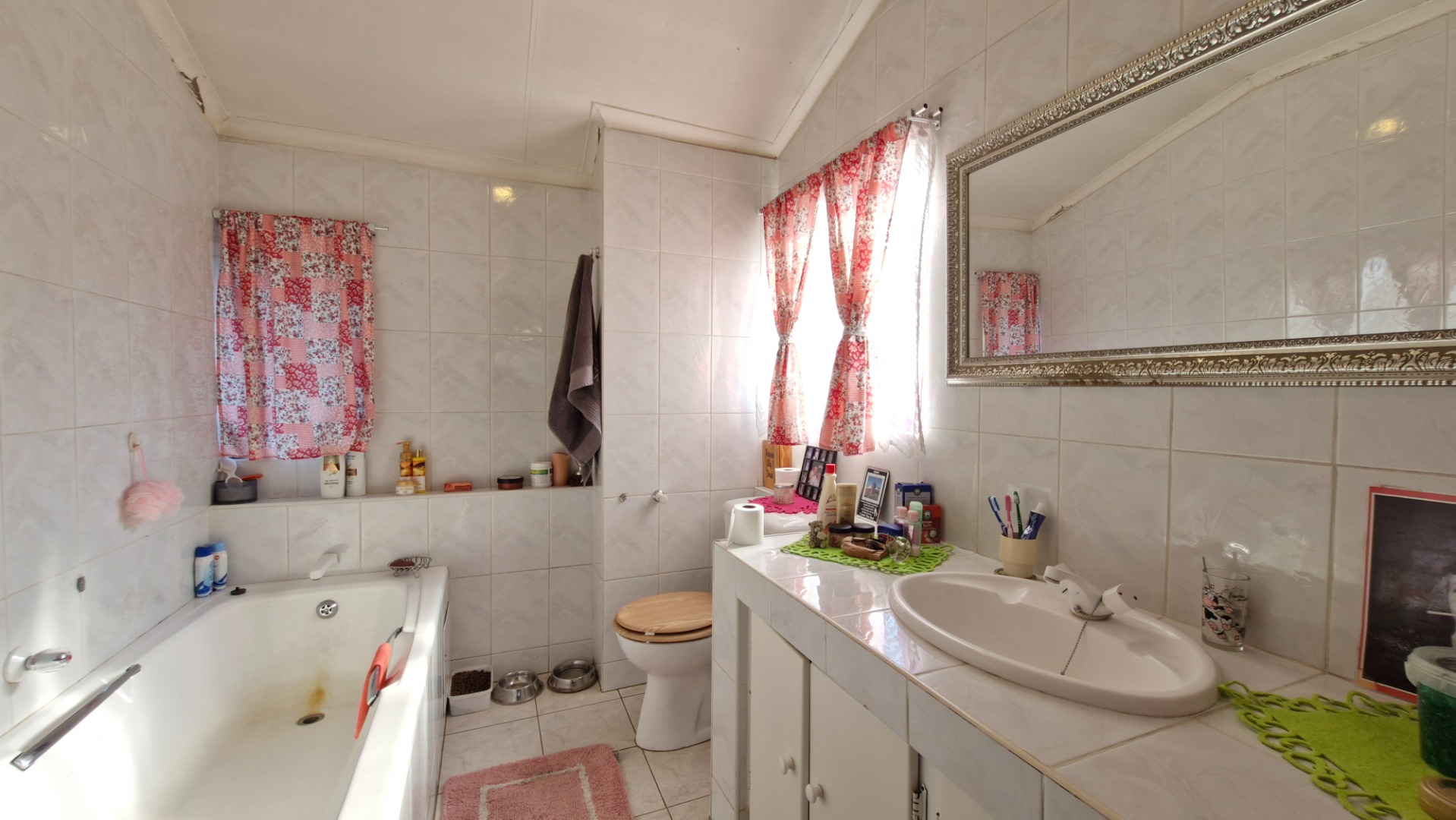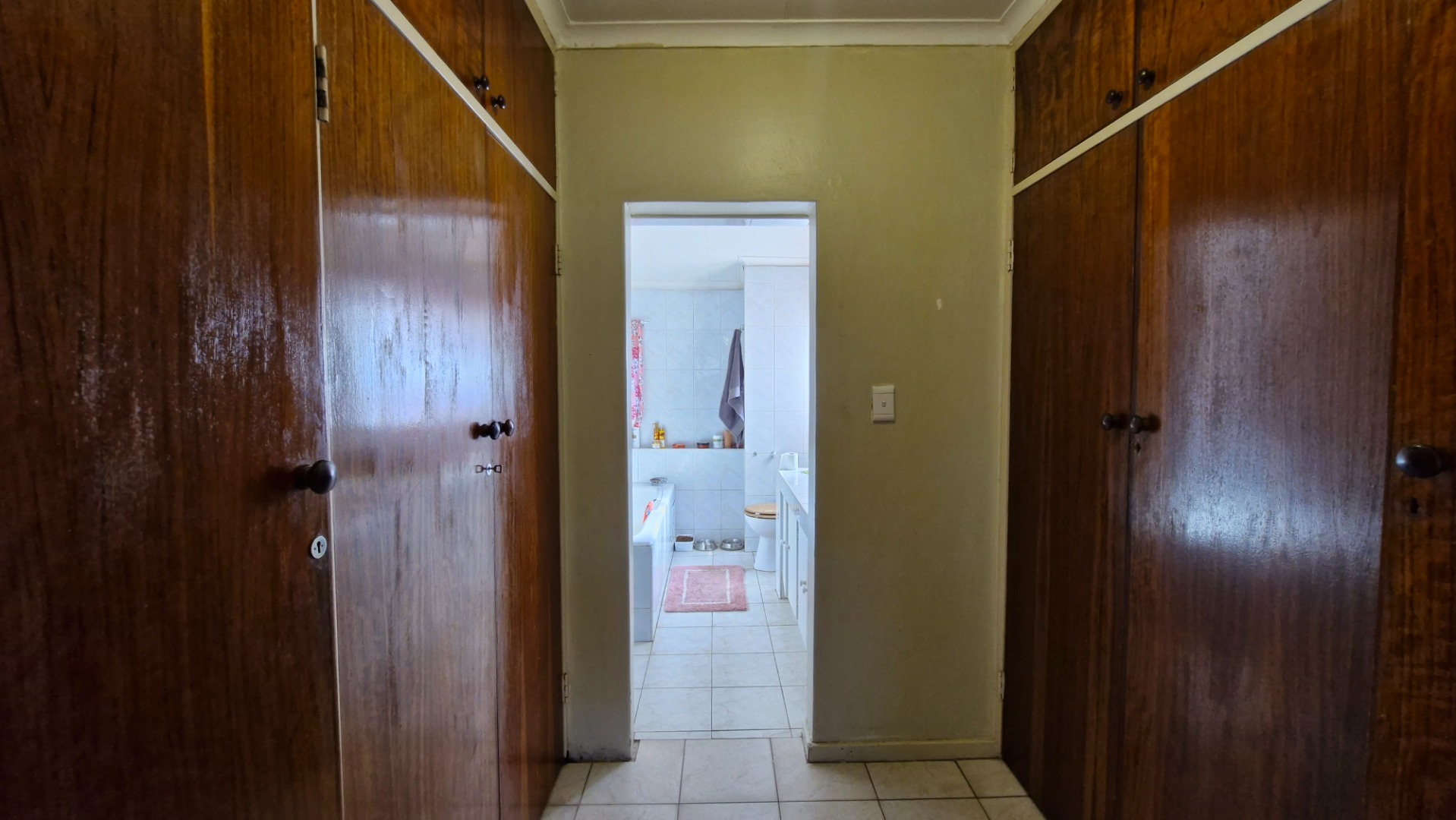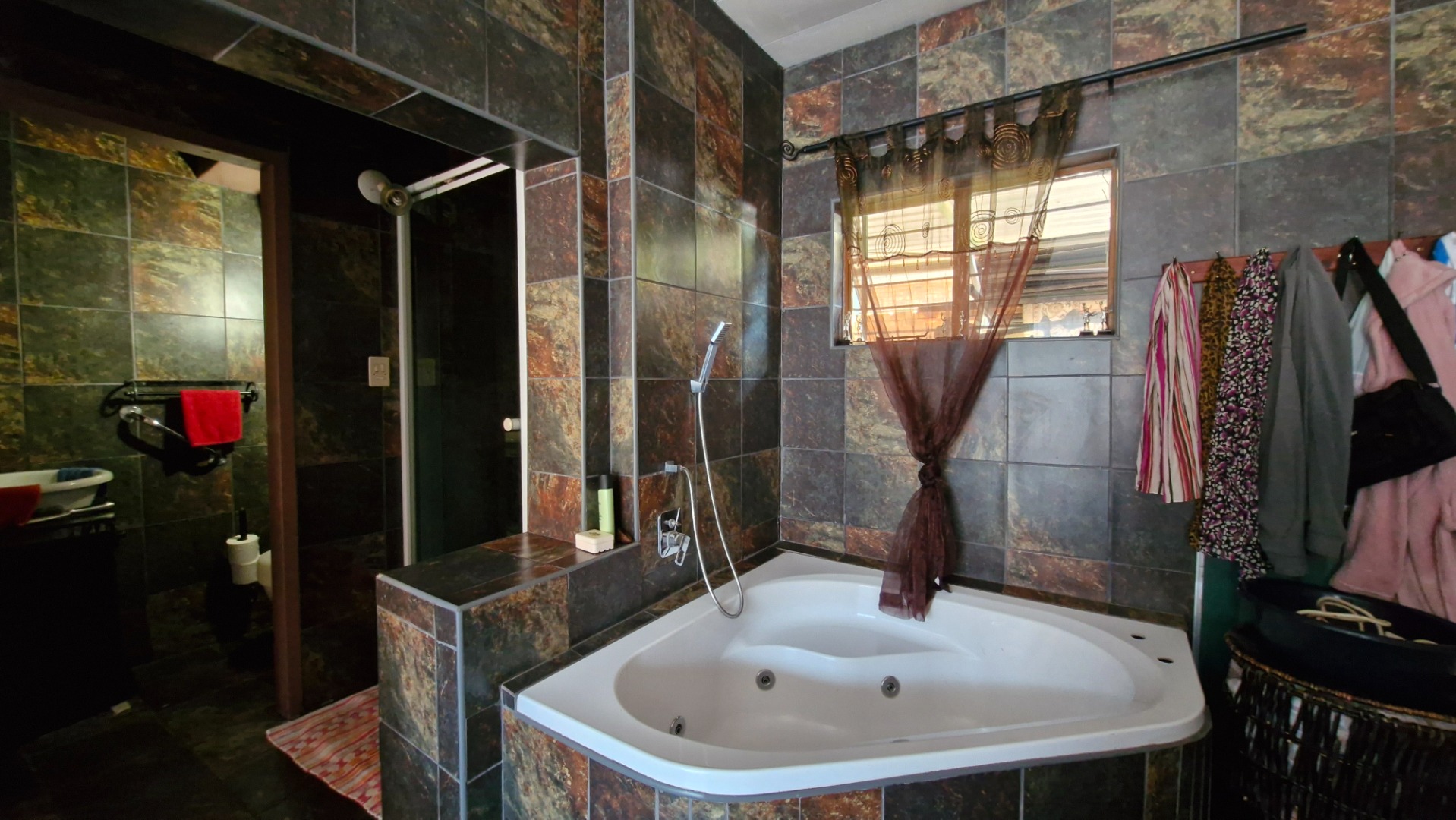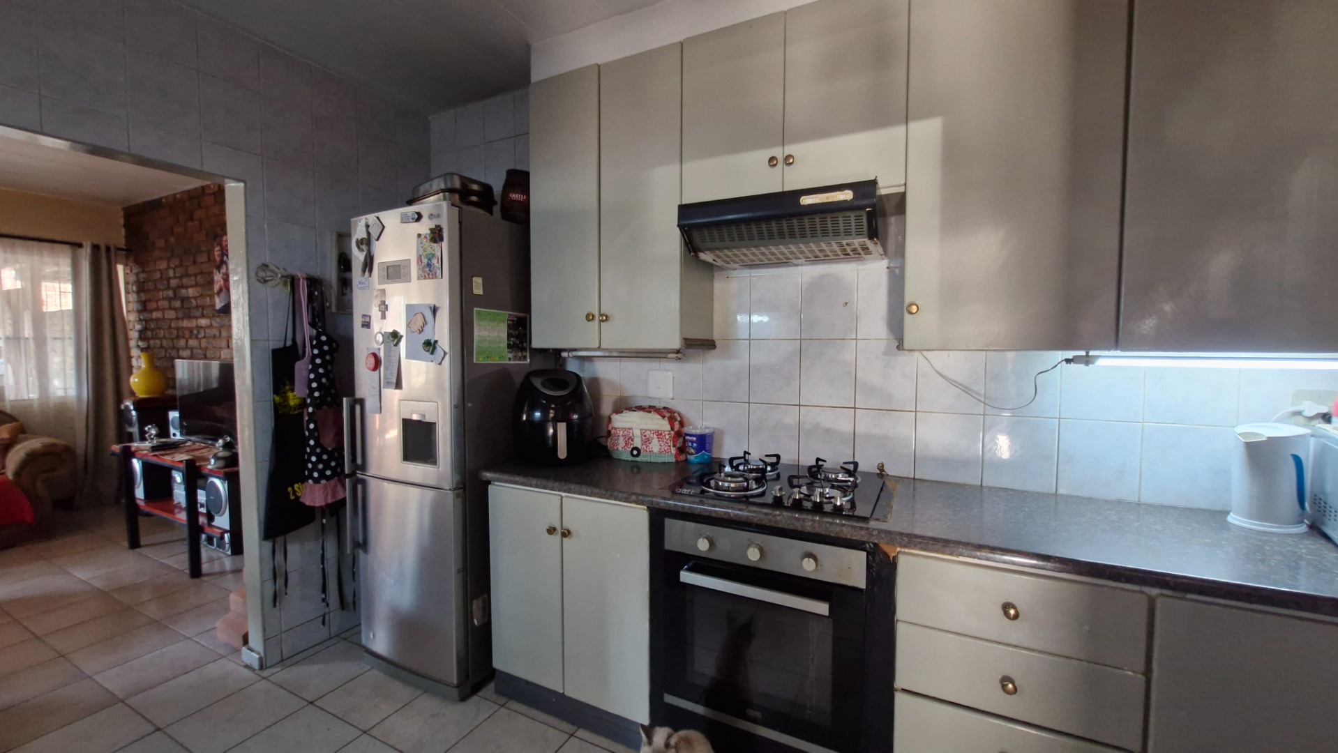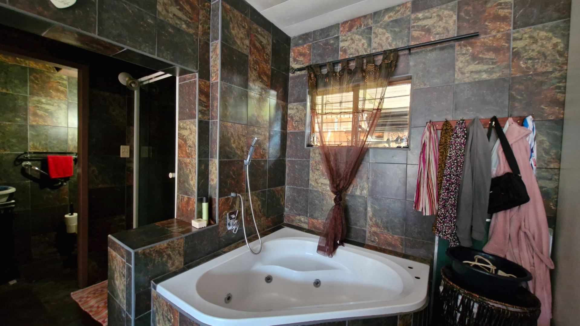 The accommodation comprises four generously proportioned bedrooms (one bedroom downstairs with en-suite bathroom), with two benefiting from private en-suite facilities, ensuring comfort and privacy for all occupants. The interior features include practical built-in cupboards and an exposed brick accent wall, adding a touch of character to the living spaces. Large windows, fitted with security bars, invite ample natural light while maintaining a secure environment.