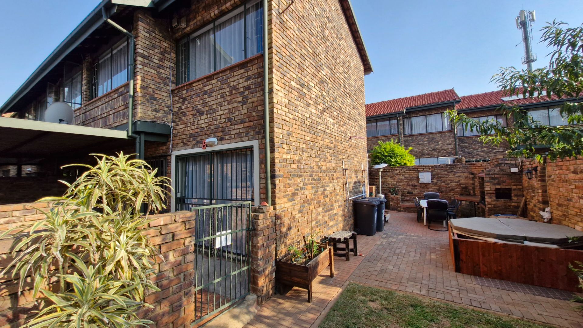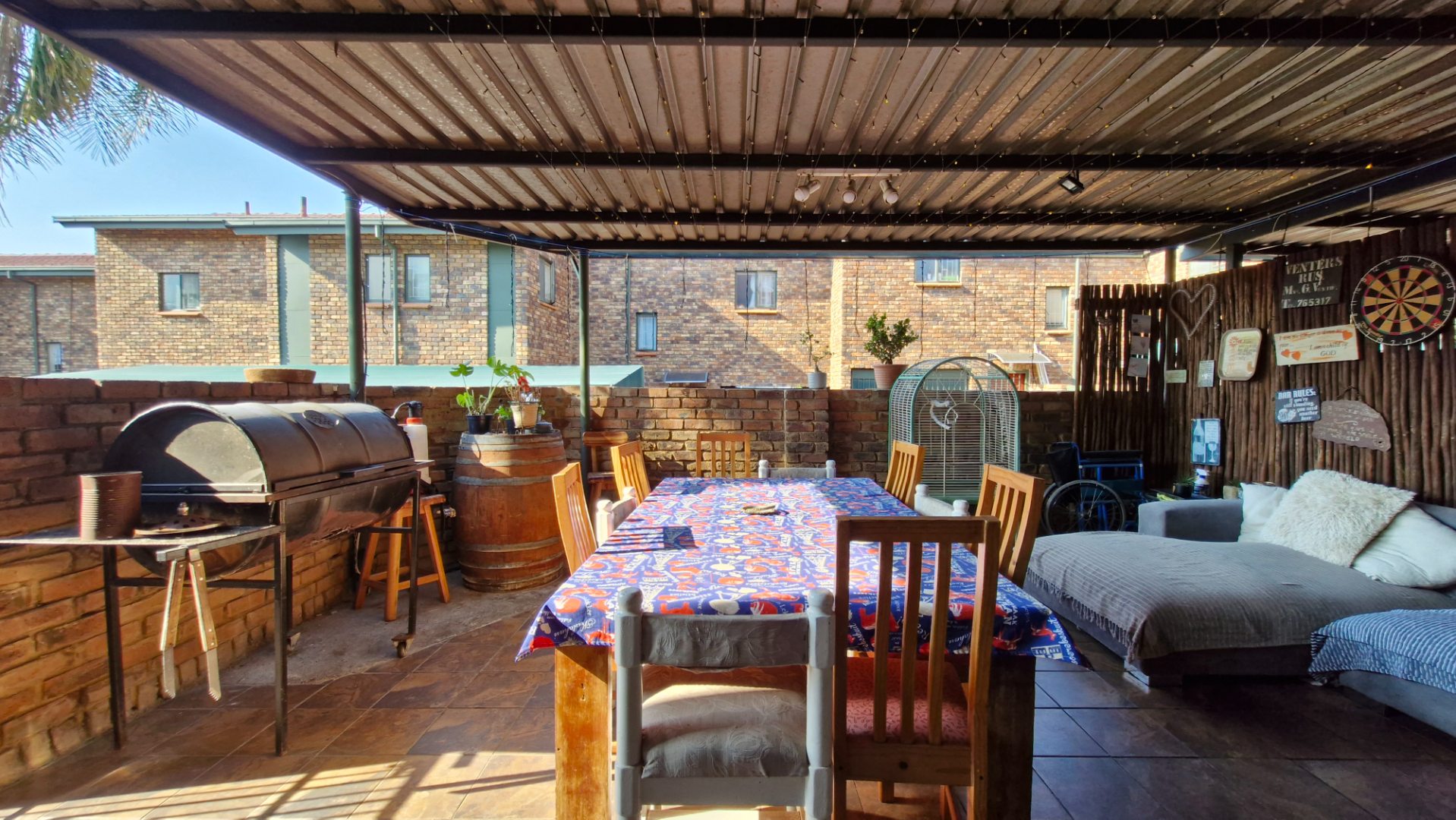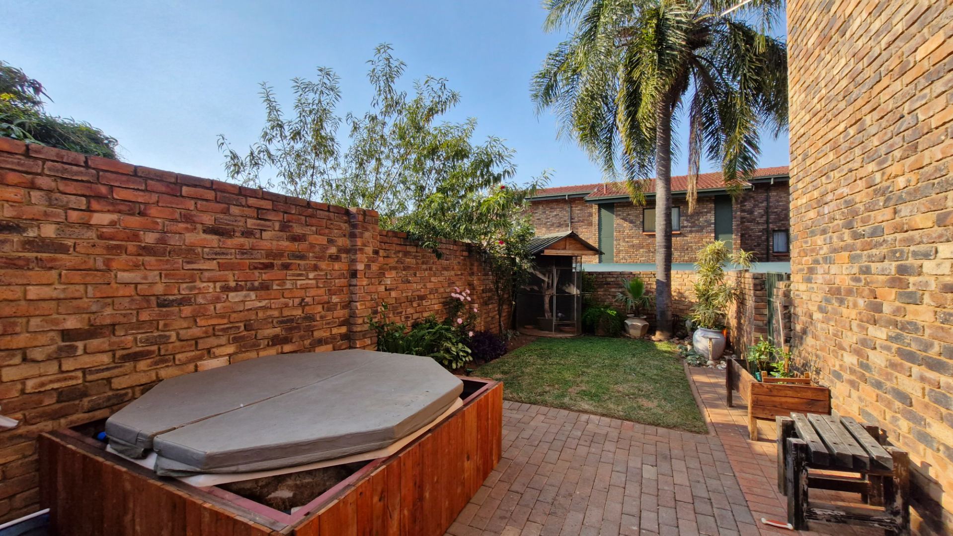 Outdoor living is exceptionally catered for with an expansive, covered patio area. This versatile space is ideal for year-round entertainment, featuring distinct zones for dining and lounging, complemented by a built-in braai. The private, paved courtyard hosts a luxurious jacuzzi, offering a secluded retreat for relaxation. The property further benefits from two dedicated covered parking spaces right in front of the unit as well as an open parking space and a low-maintenance garden area.