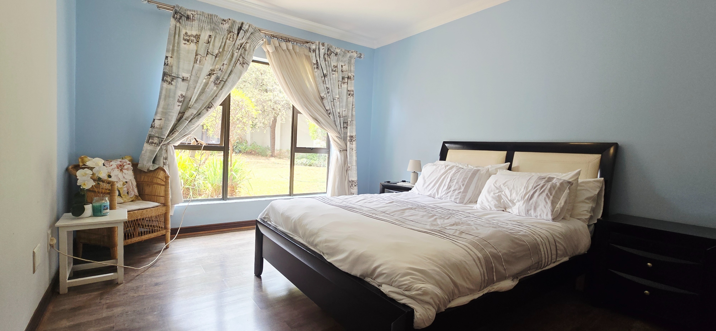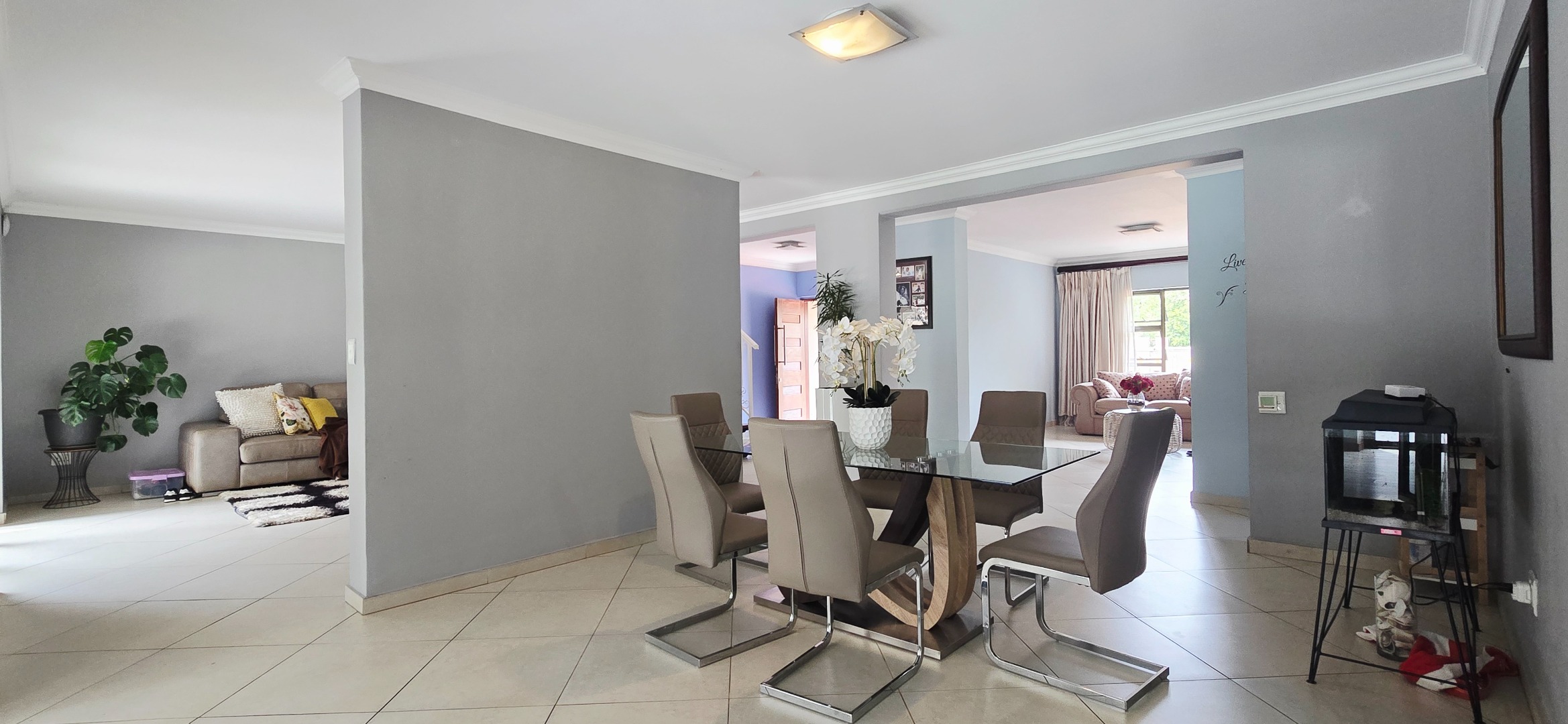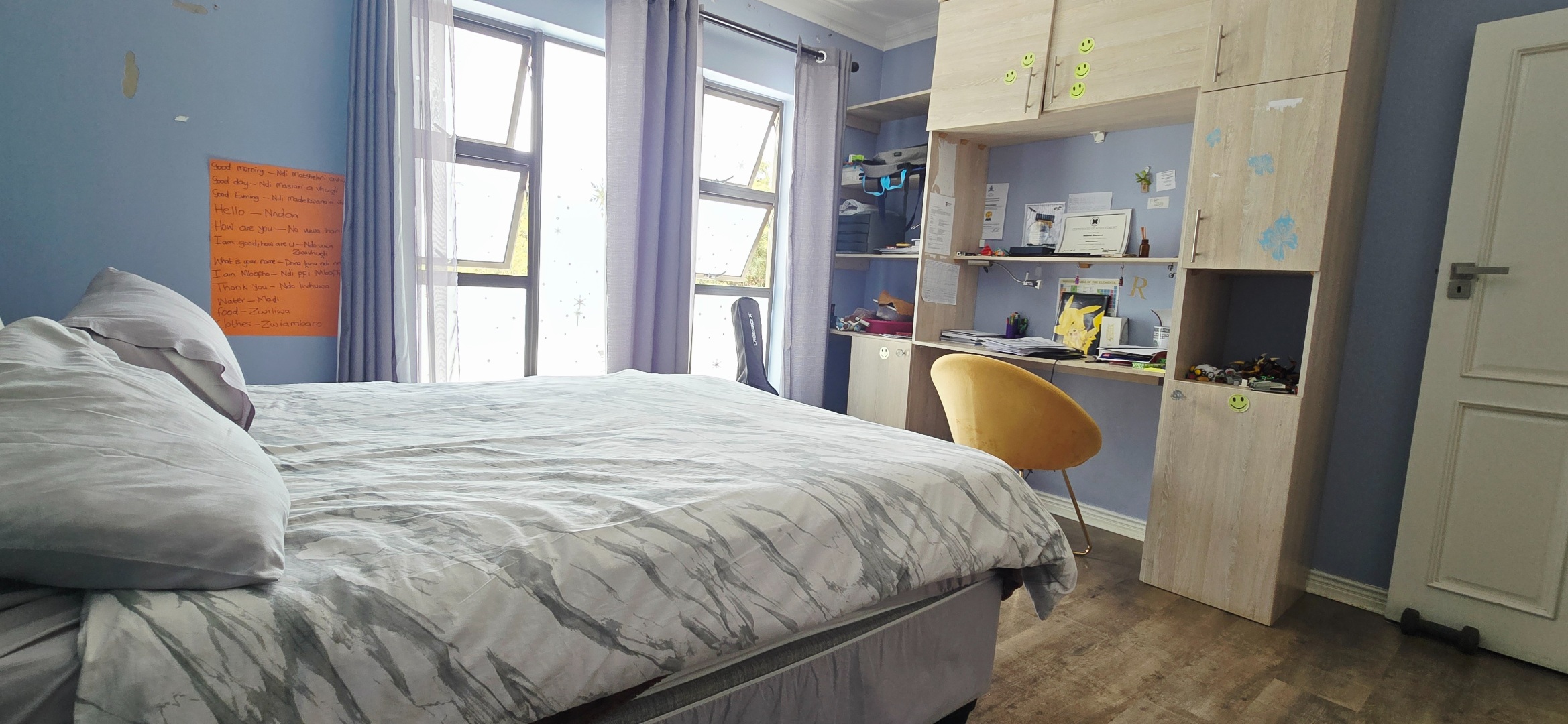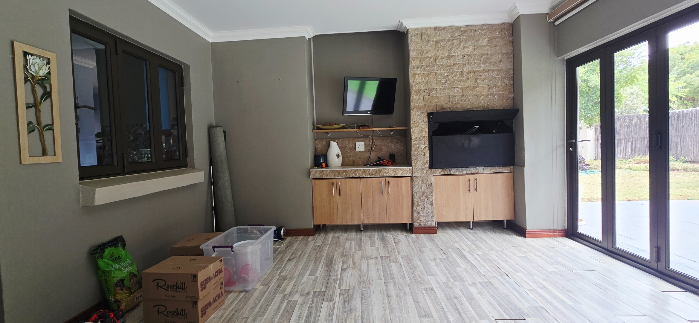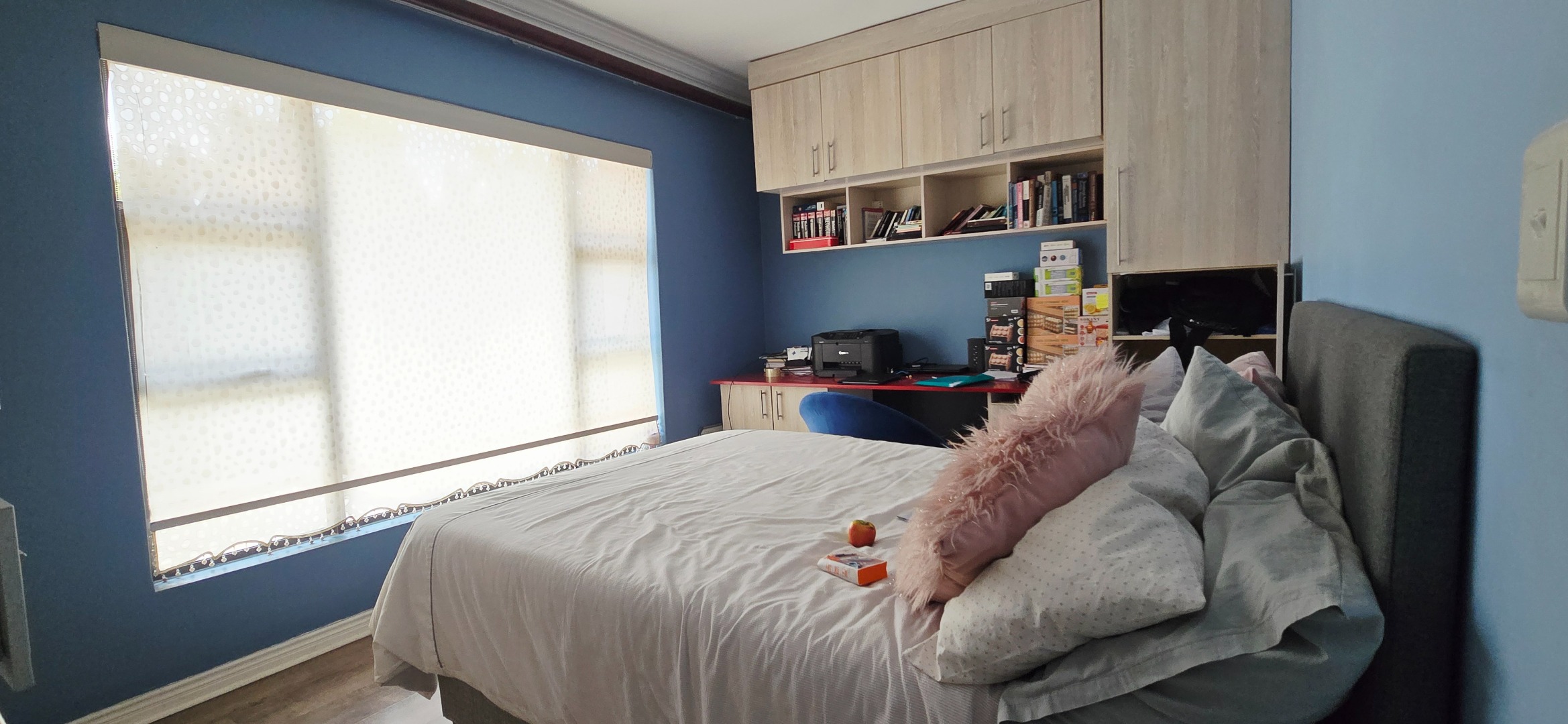 The front door leads you to an open plan home with reception area, living room and dining room flowing out to the enclosed braai room and open patio which overlooks the large garden and sparkling swimming pool. The braai room is enclosed, but can be opened up to join in with the larger patio when you entertain larger groups. The garden space is wonderfully spacious for ball play or furry friends.