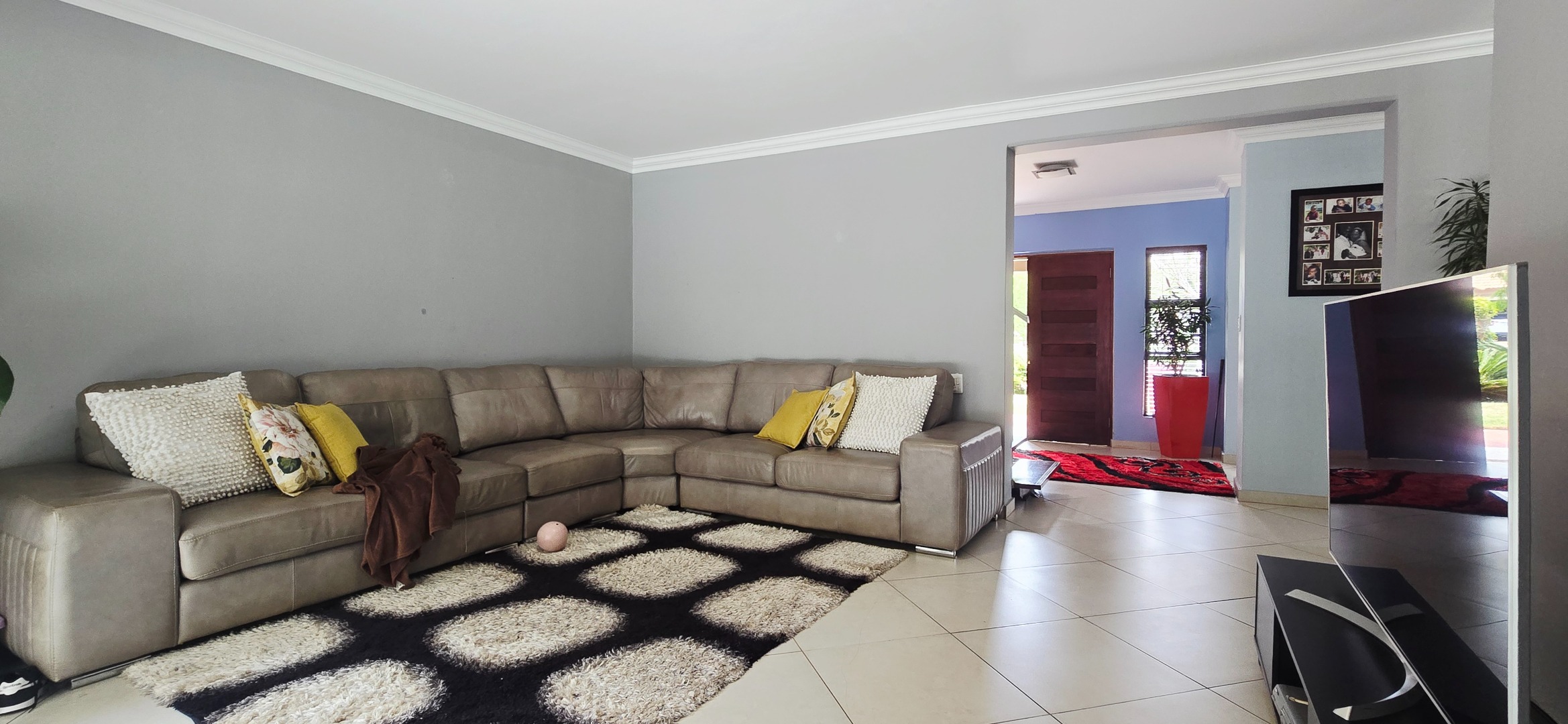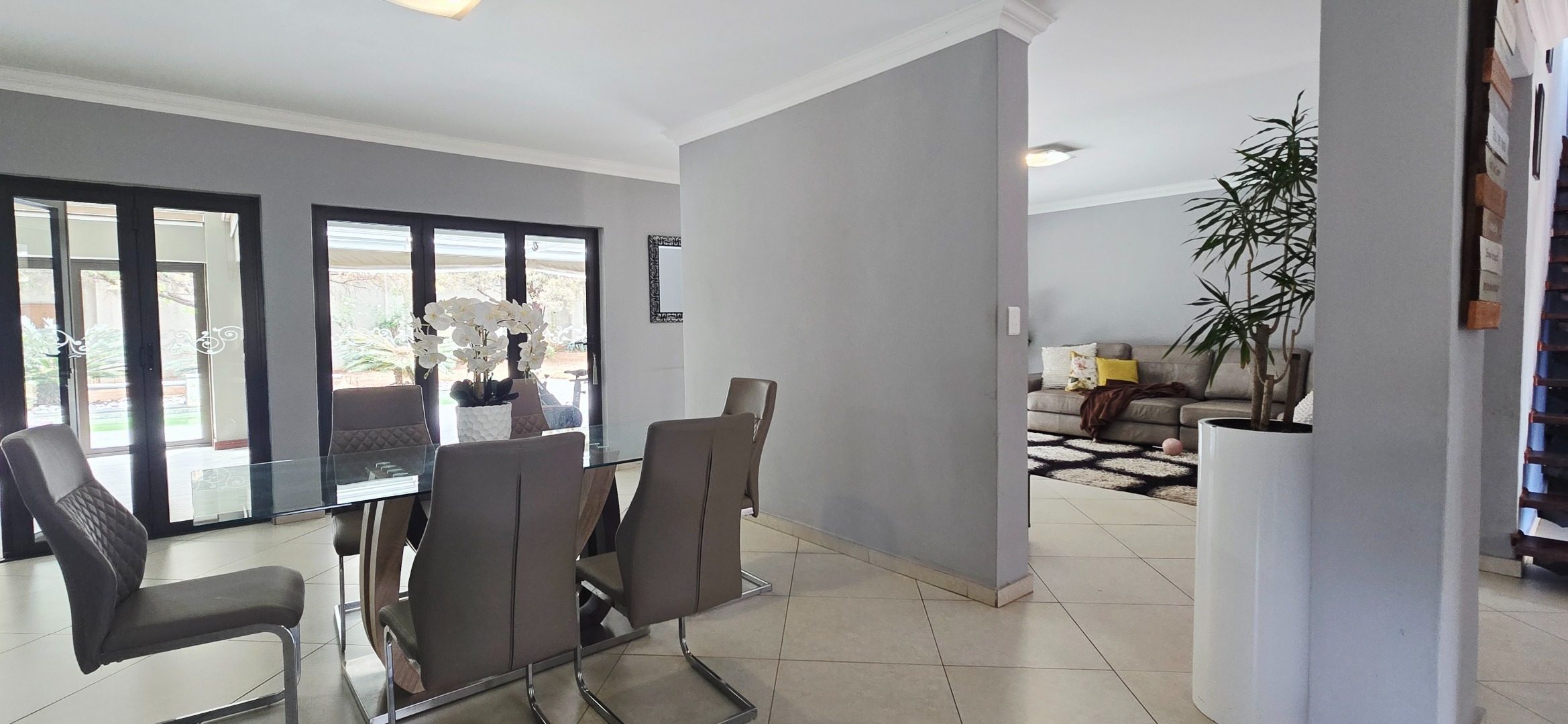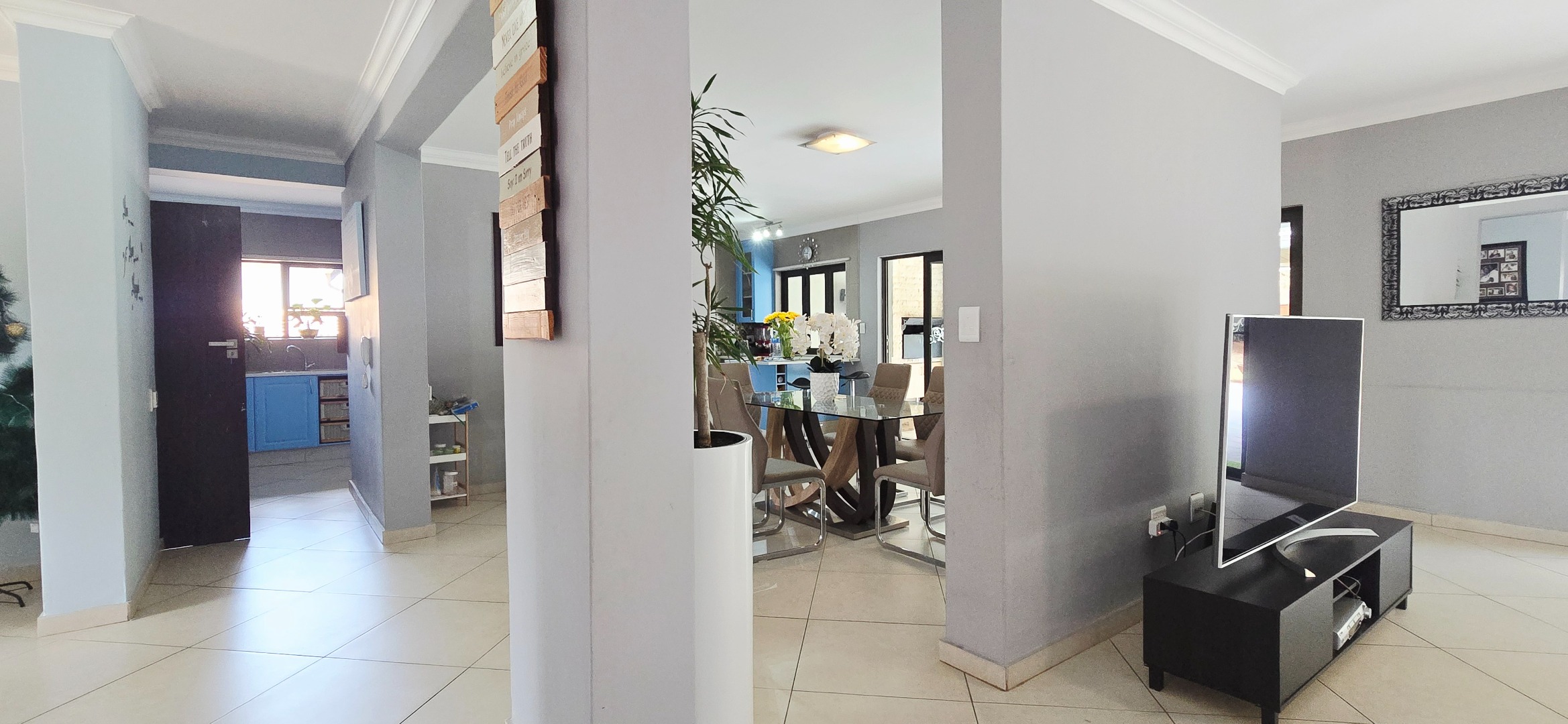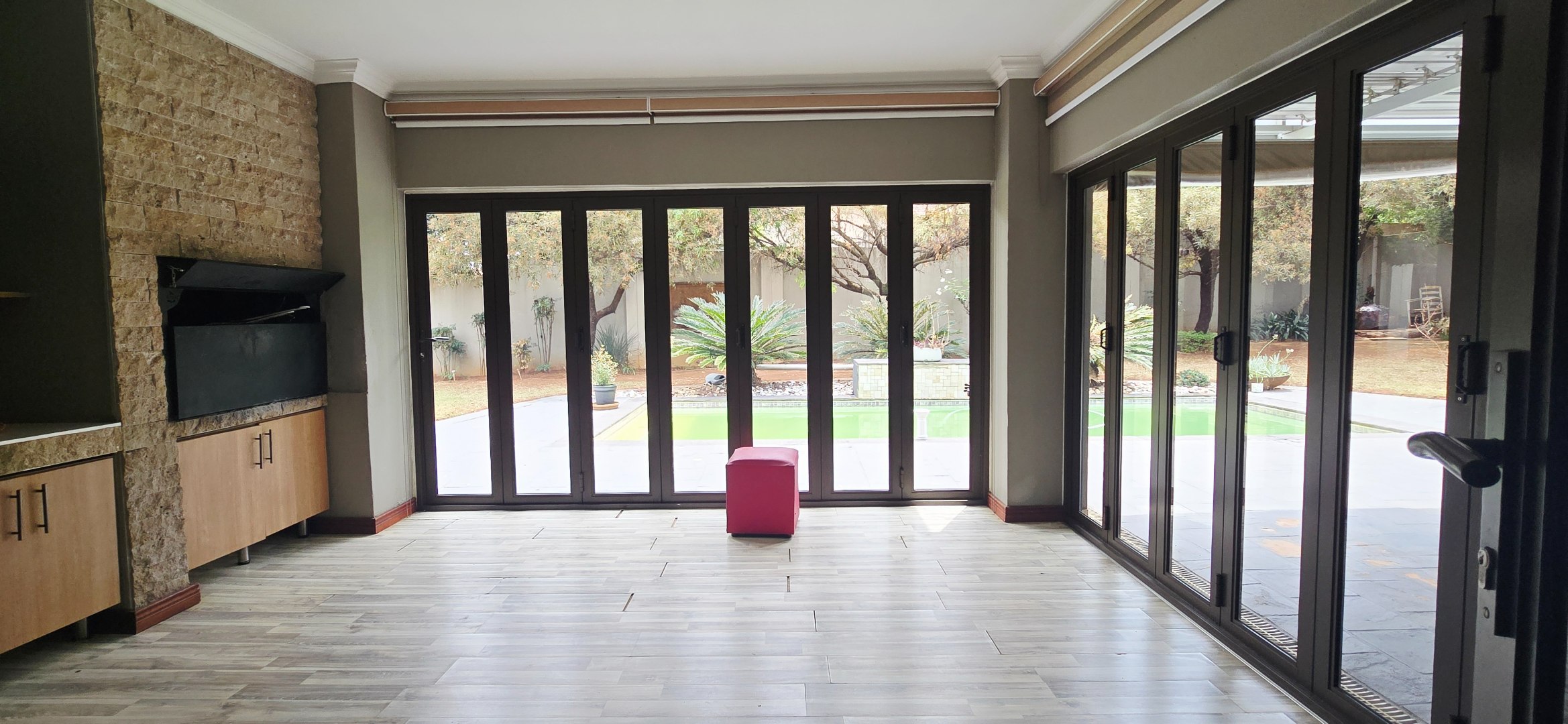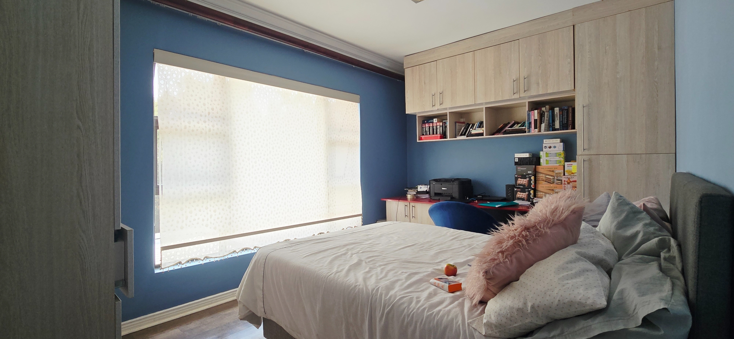 The front door leads you to an open plan home with reception area, living room and dining room flowing out to the enclosed braai room and open patio which overlooks the large garden and sparkling swimming pool. The braai room is enclosed, but can be opened up to join in with the larger patio when you entertain larger groups. The garden space is wonderfully spacious for ball play or furry friends.