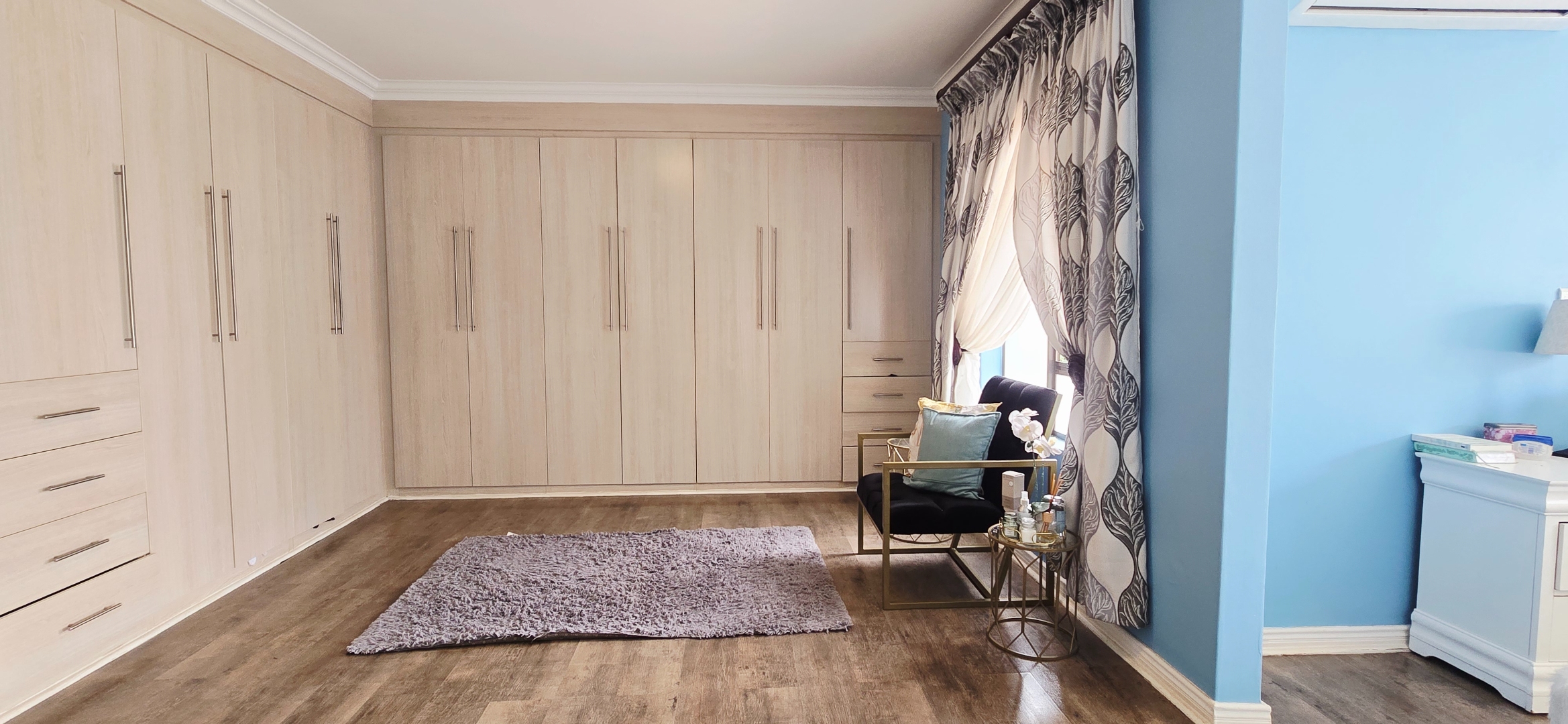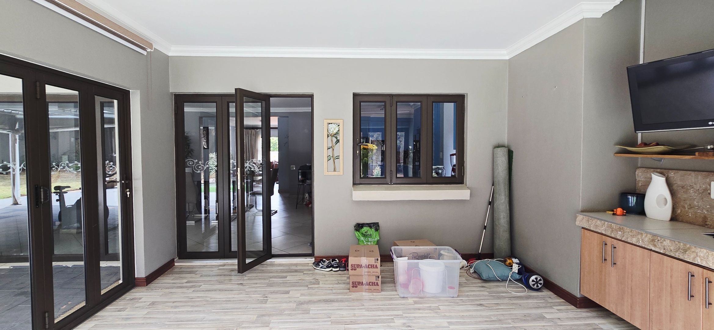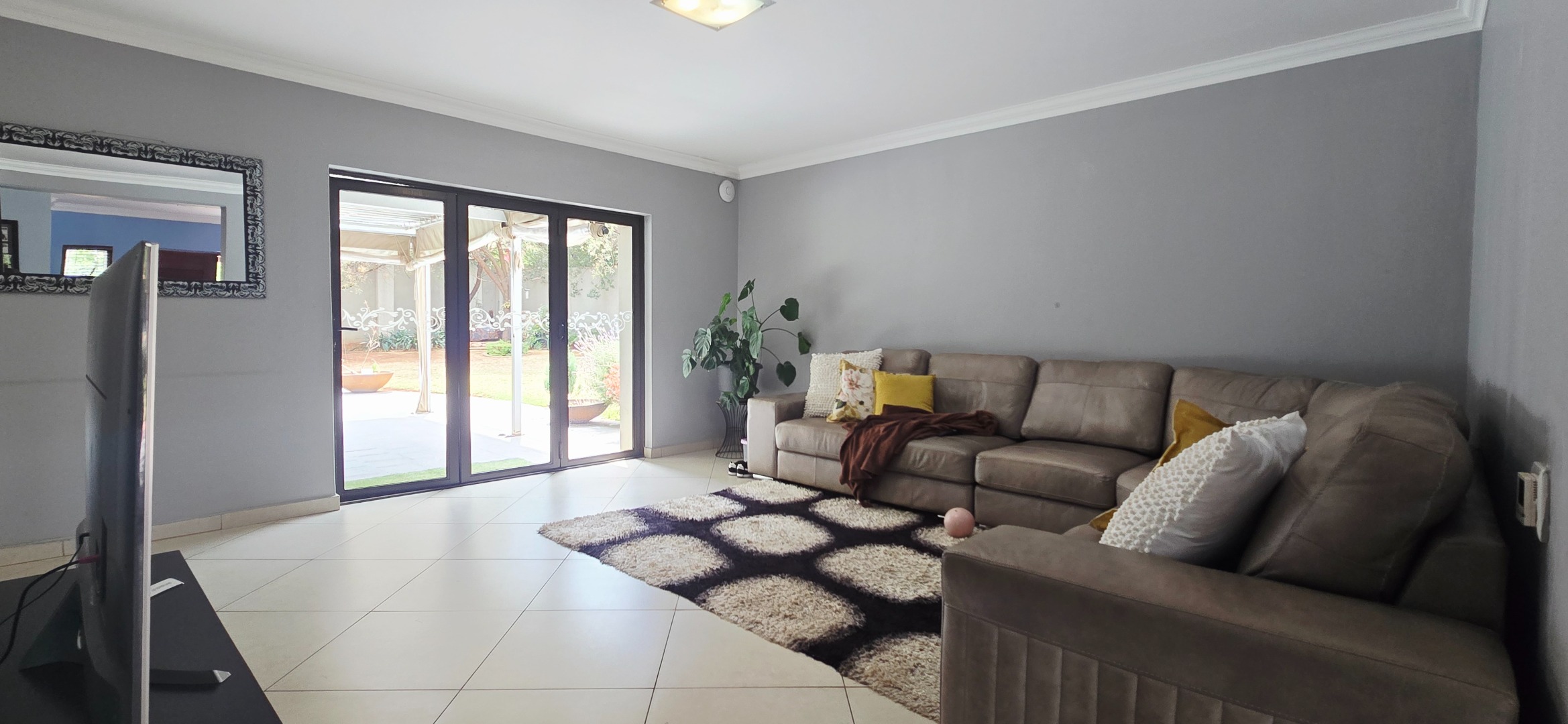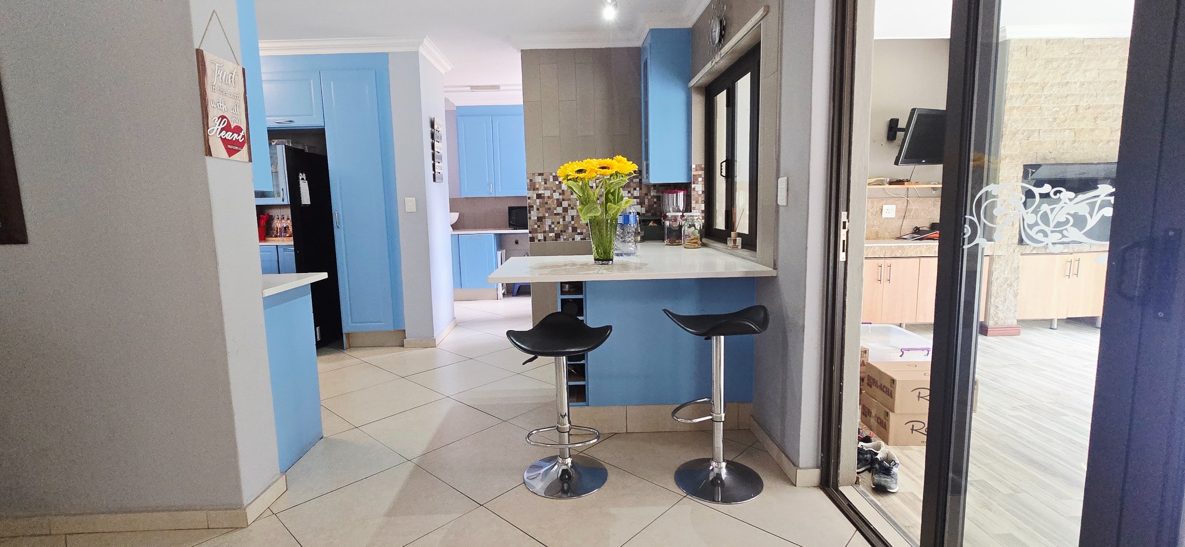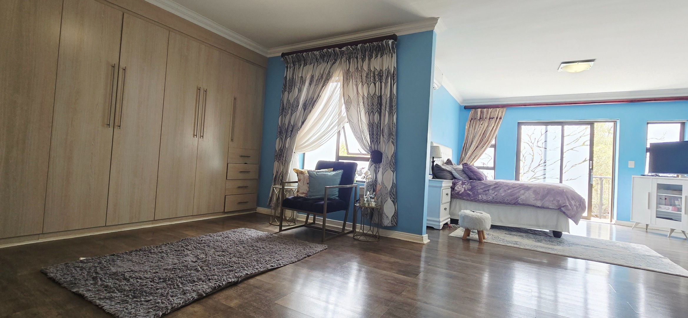 The front door leads you to an open plan home with reception area, living room and dining room flowing out to the enclosed braai room and open patio which overlooks the large garden and sparkling swimming pool. The braai room is enclosed, but can be opened up to join in with the larger patio when you entertain larger groups. The garden space is wonderfully spacious for ball play or furry friends.
