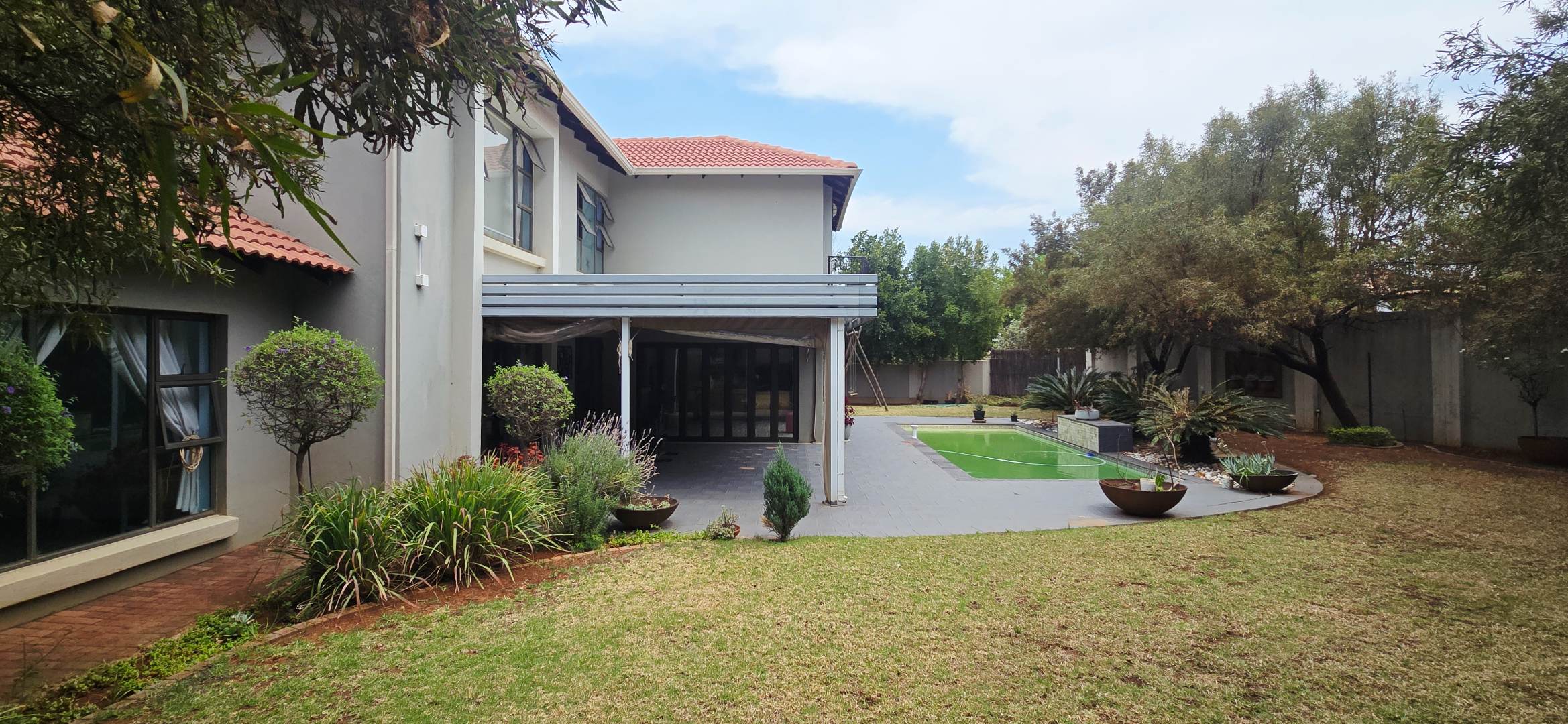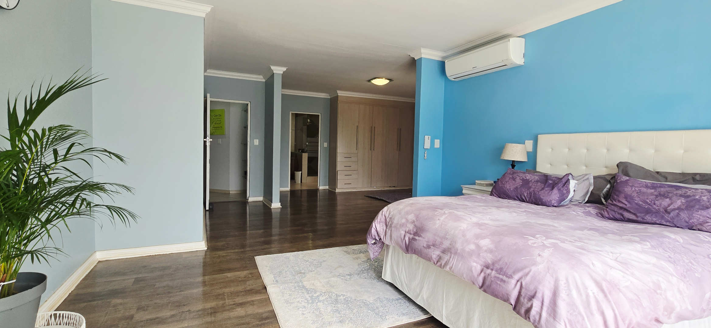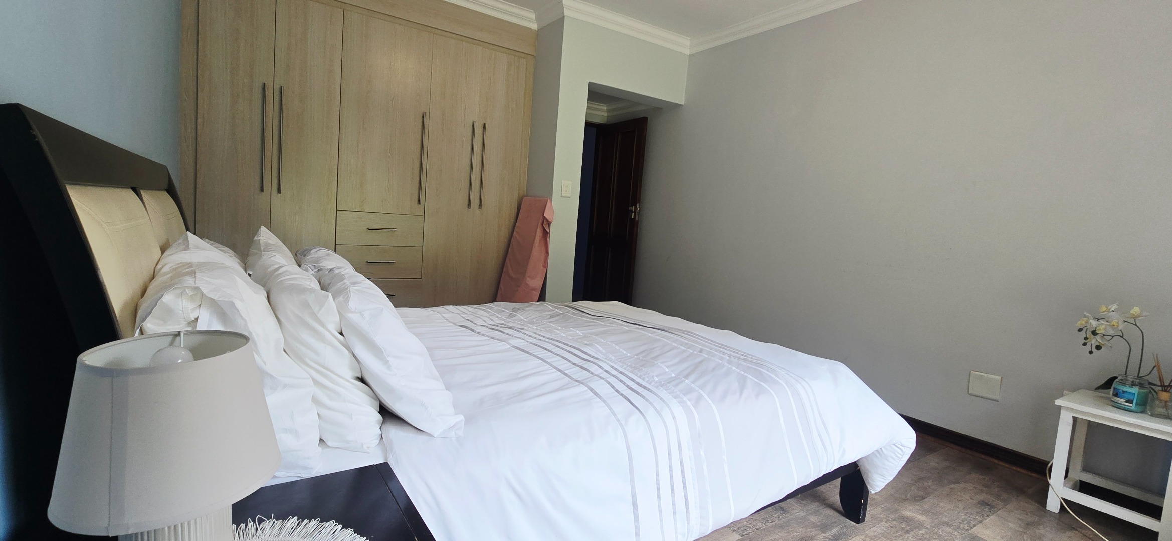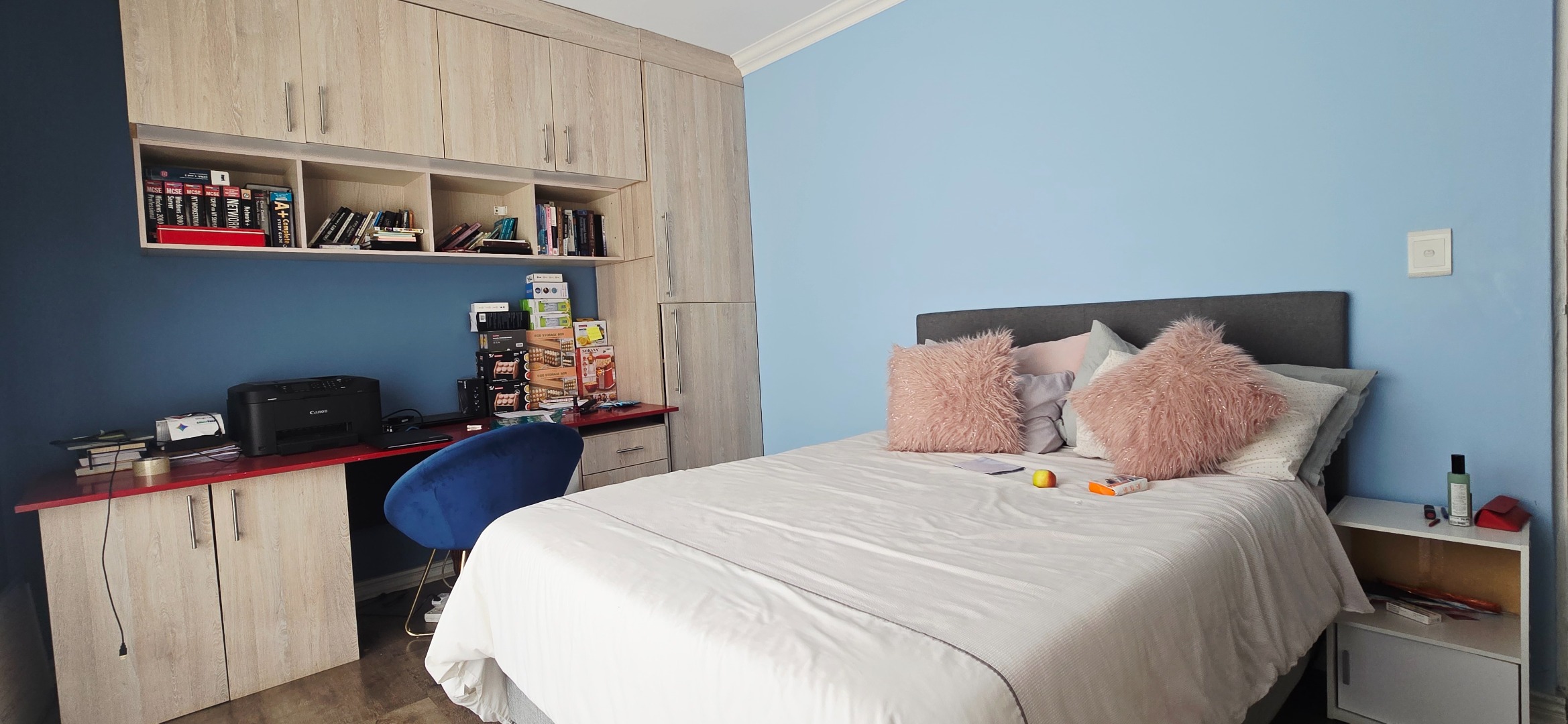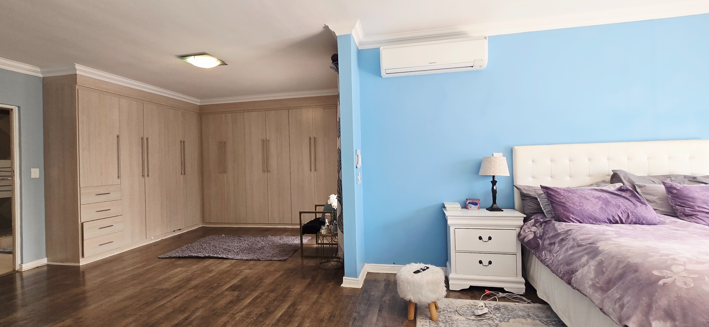 The front door leads you to an open plan home with reception area, living room and dining room flowing out to the enclosed braai room and open patio which overlooks the large garden and sparkling swimming pool. The braai room is enclosed, but can be opened up to join in with the larger patio when you entertain larger groups. The garden space is wonderfully spacious for ball play or furry friends.