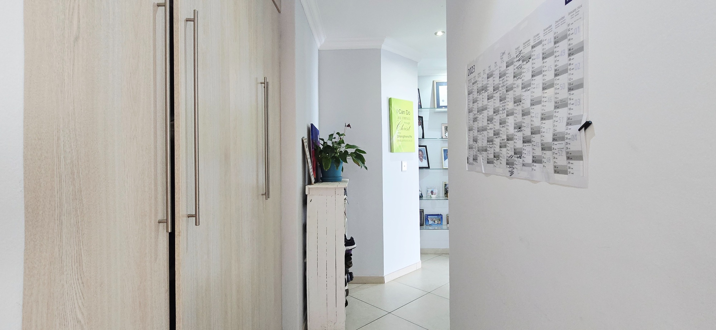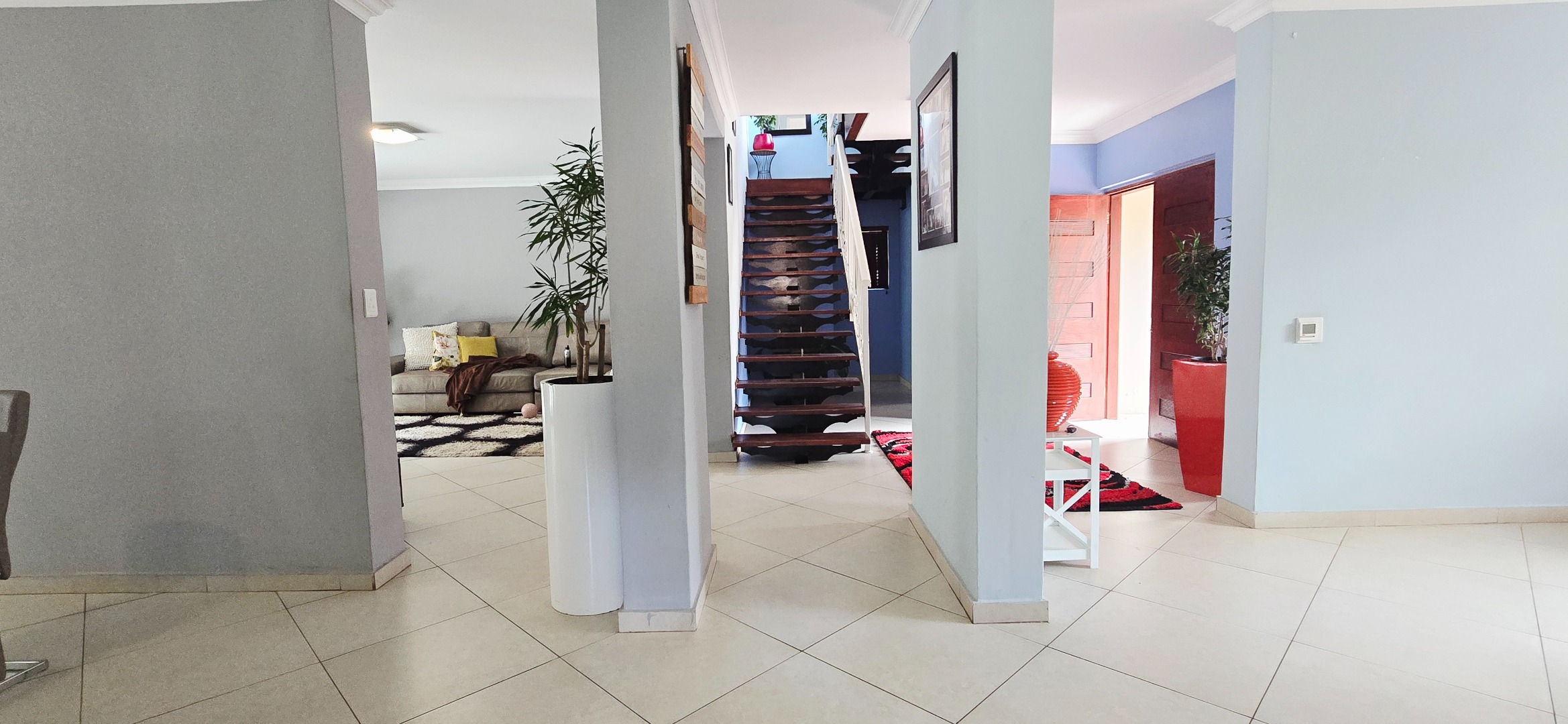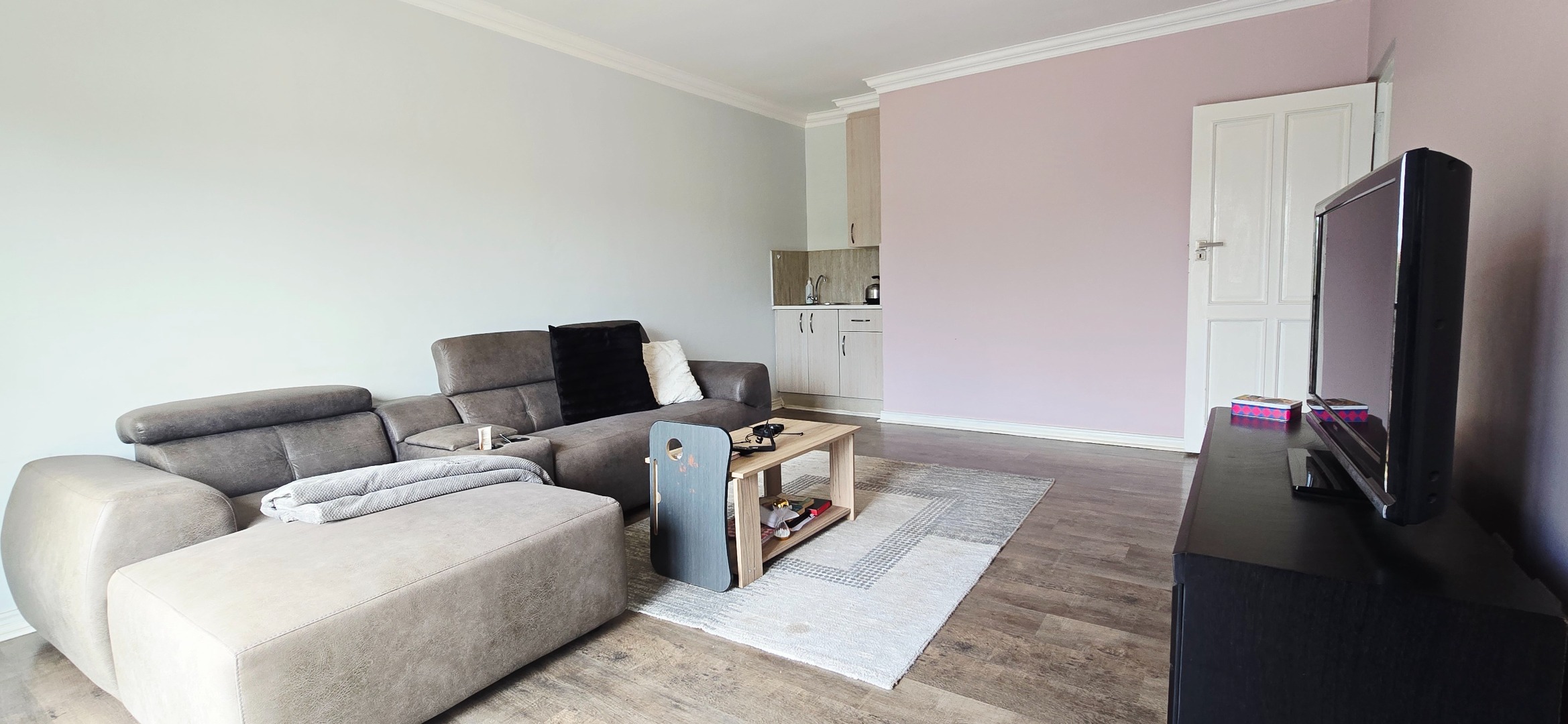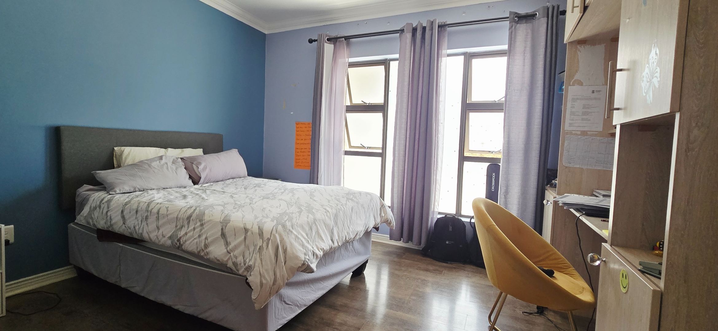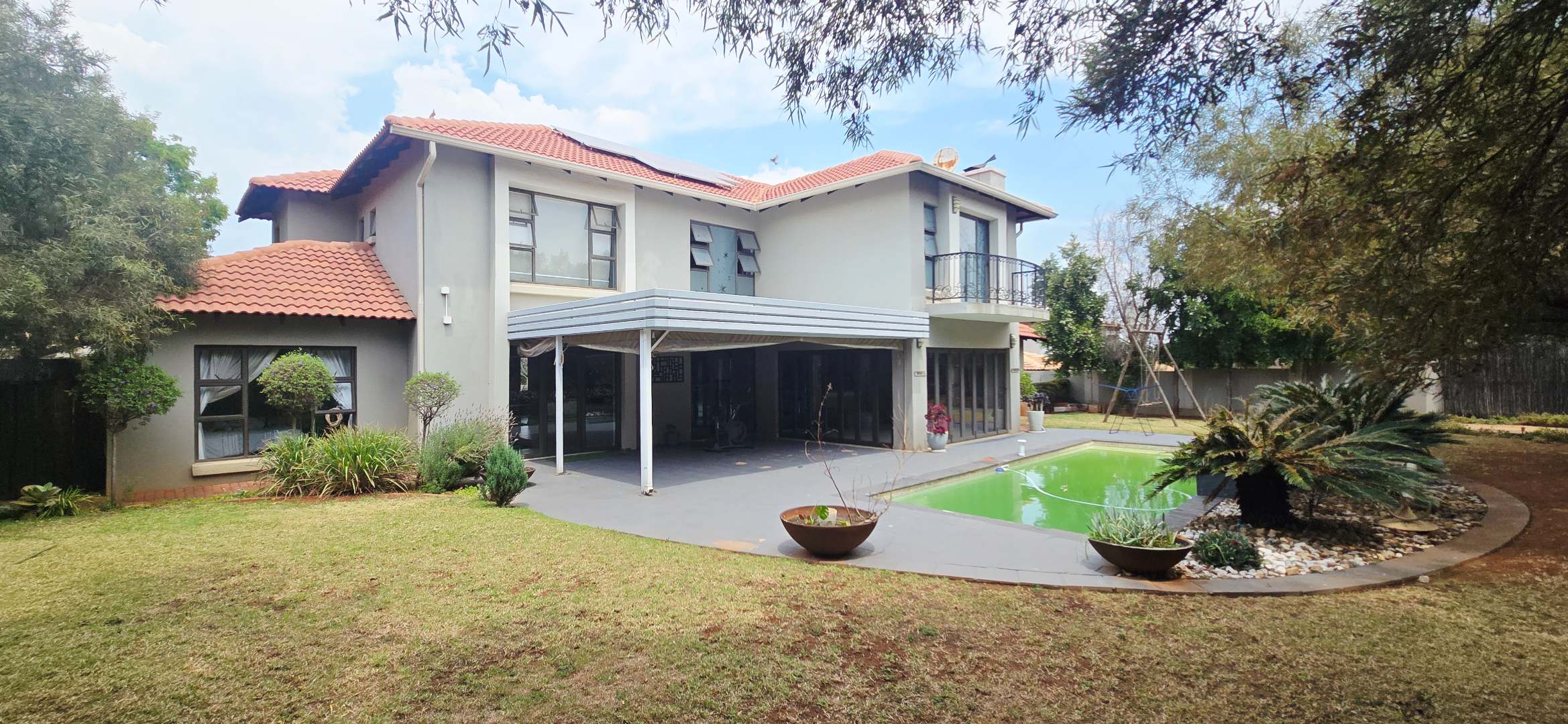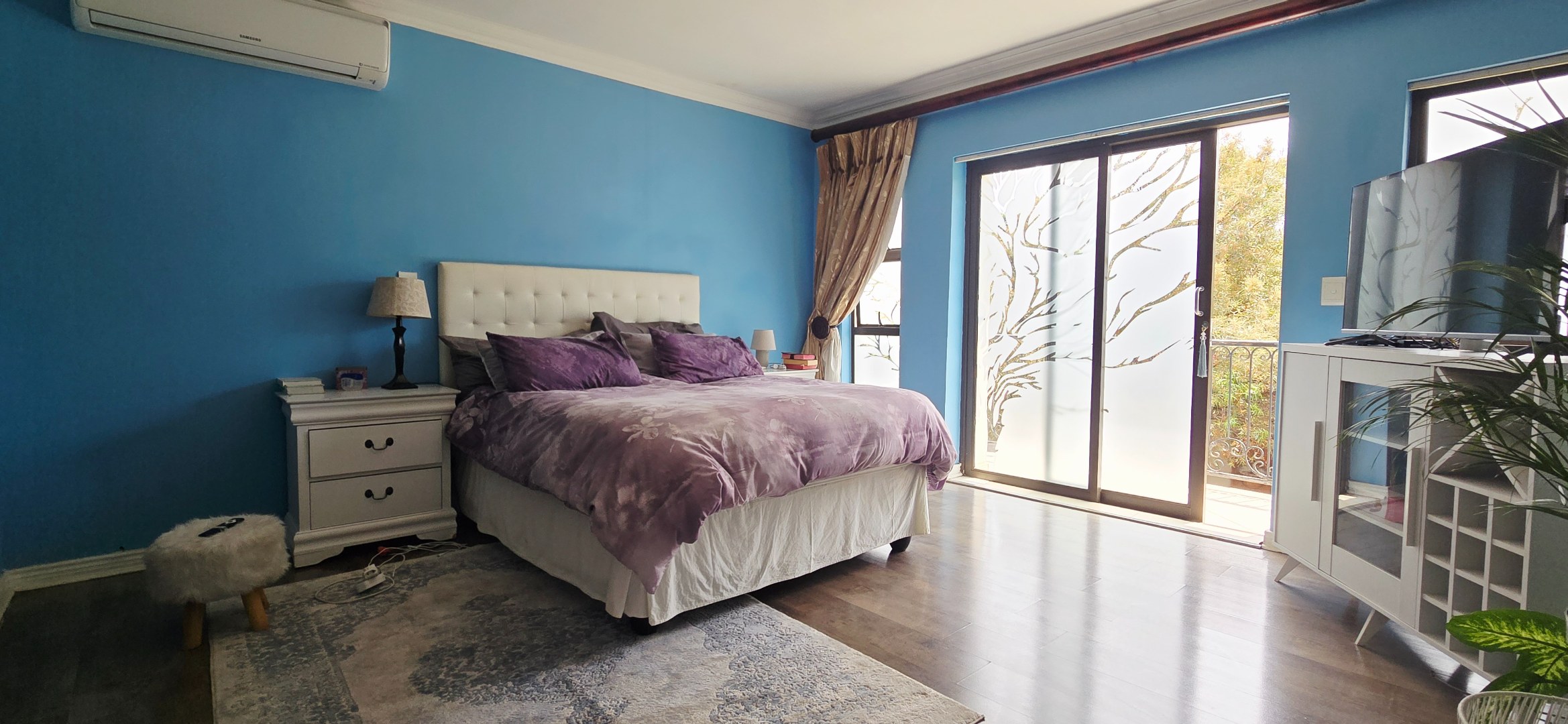 The front door leads you to an open plan home with reception area, living room and dining room flowing out to the enclosed braai room and open patio which overlooks the large garden and sparkling swimming pool. The braai room is enclosed, but can be opened up to join in with the larger patio when you entertain larger groups. The garden space is wonderfully spacious for ball play or furry friends.