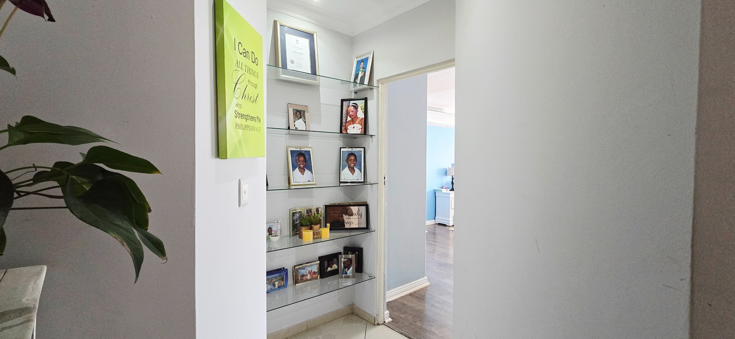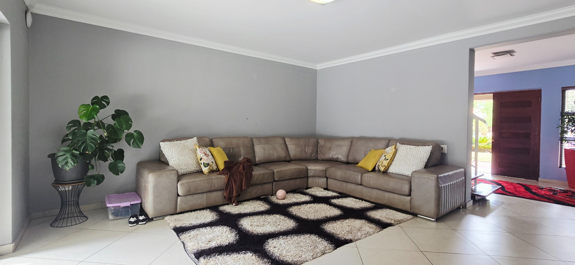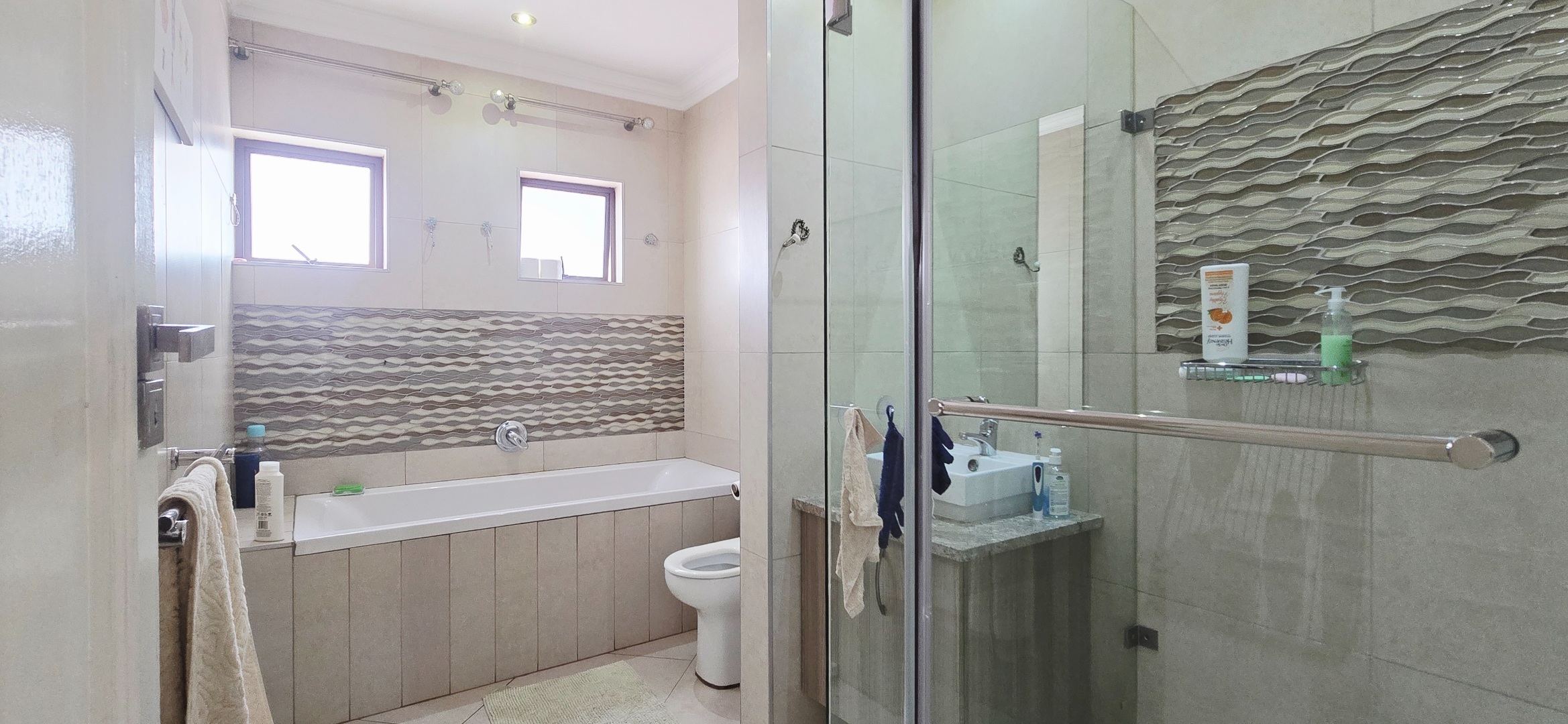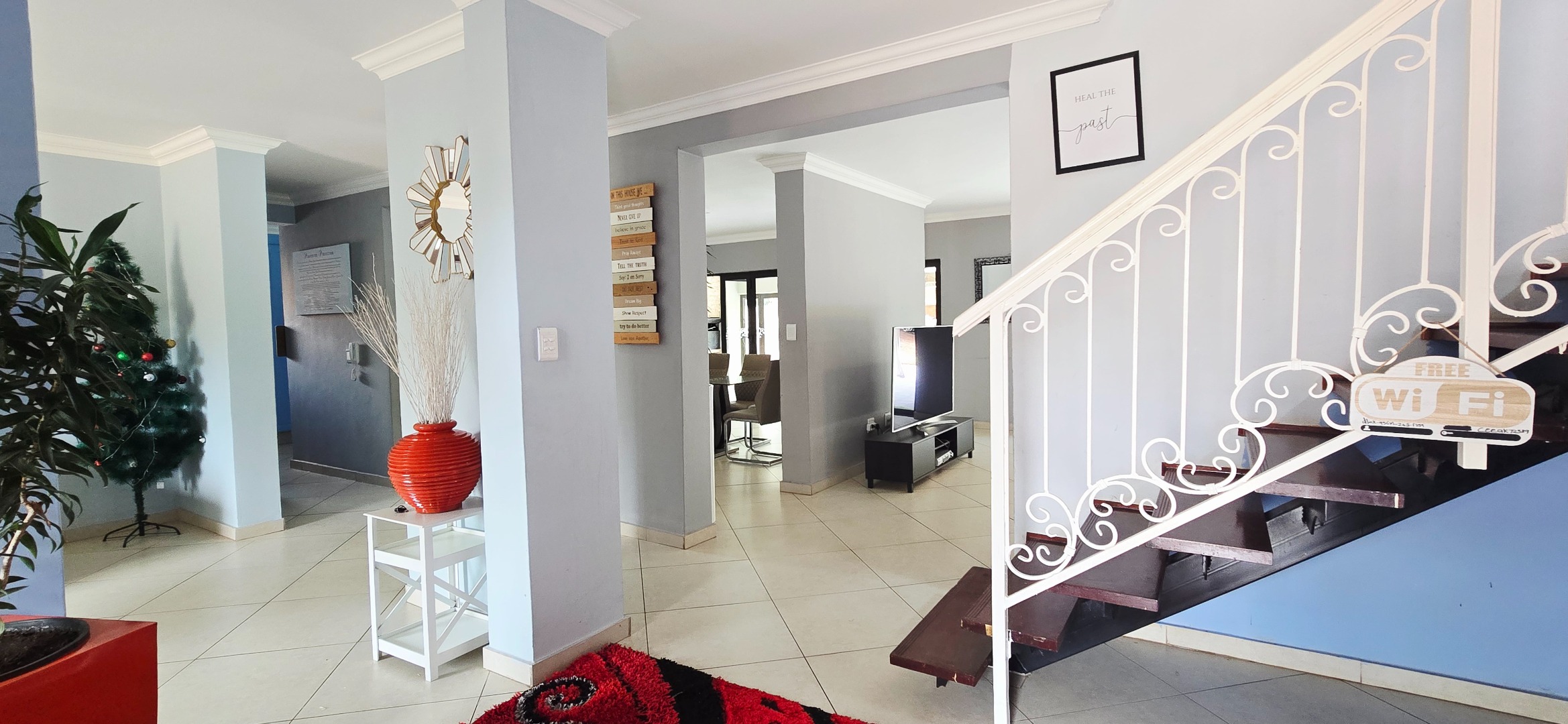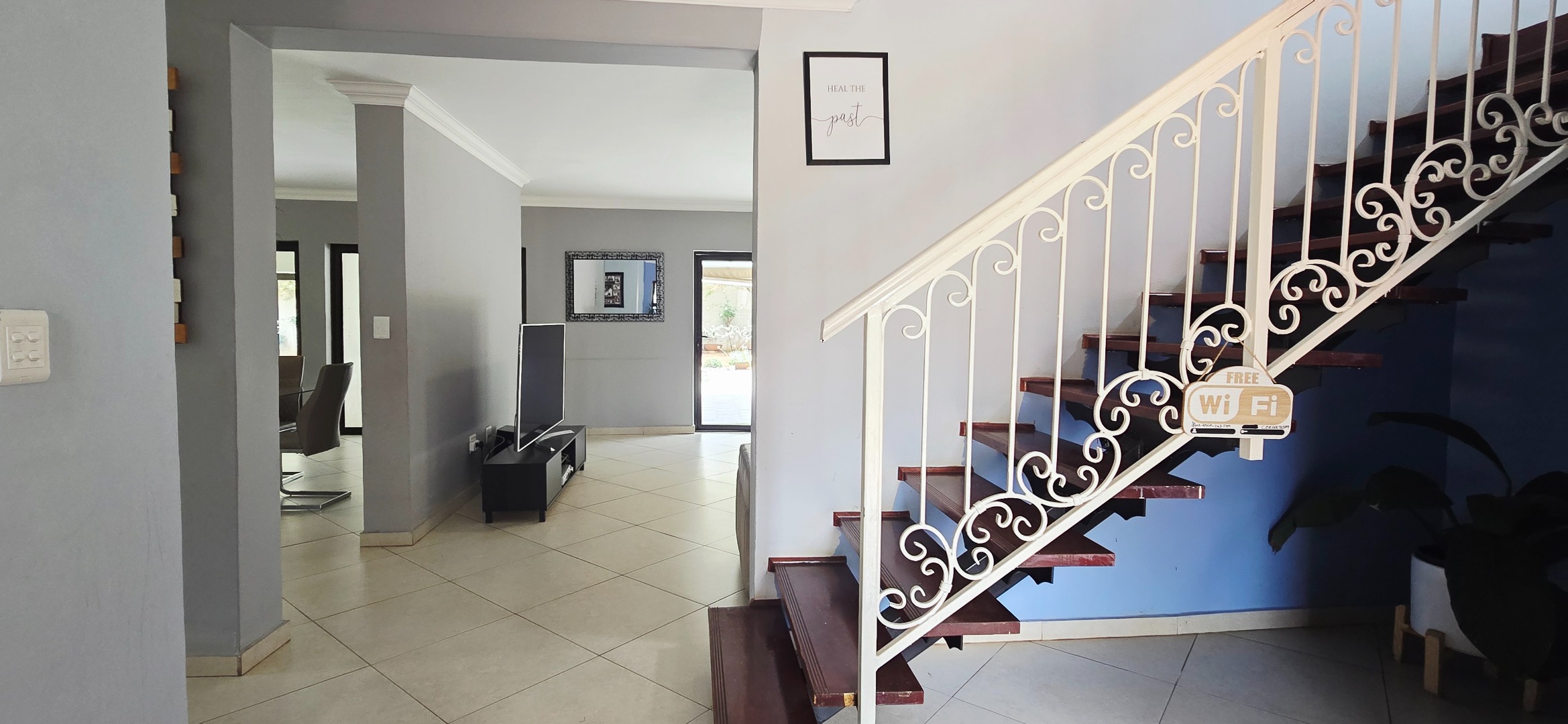 The front door leads you to an open plan home with reception area, living room and dining room flowing out to the enclosed braai room and open patio which overlooks the large garden and sparkling swimming pool. The braai room is enclosed, but can be opened up to join in with the larger patio when you entertain larger groups. The garden space is wonderfully spacious for ball play or furry friends.