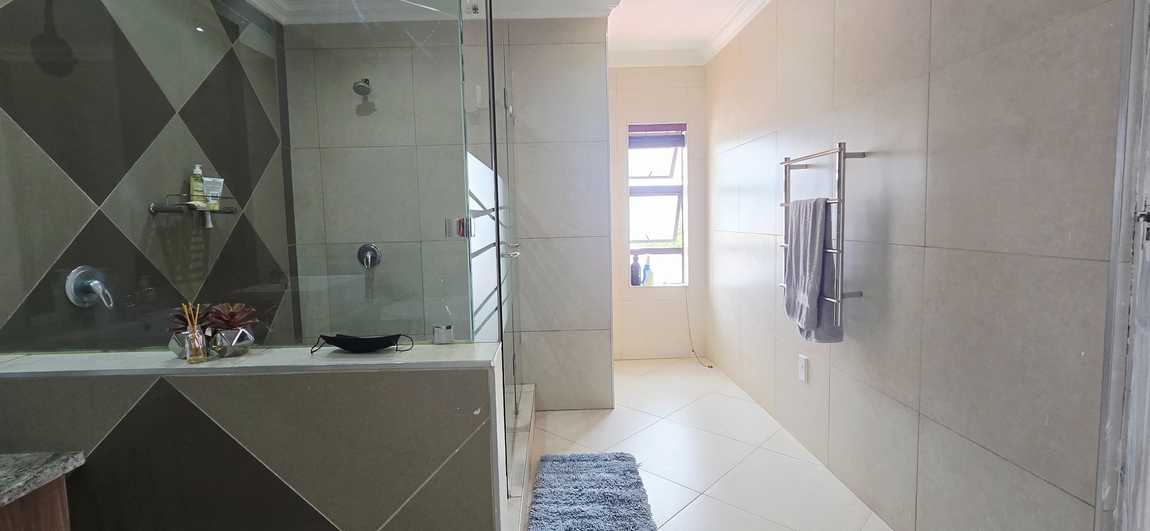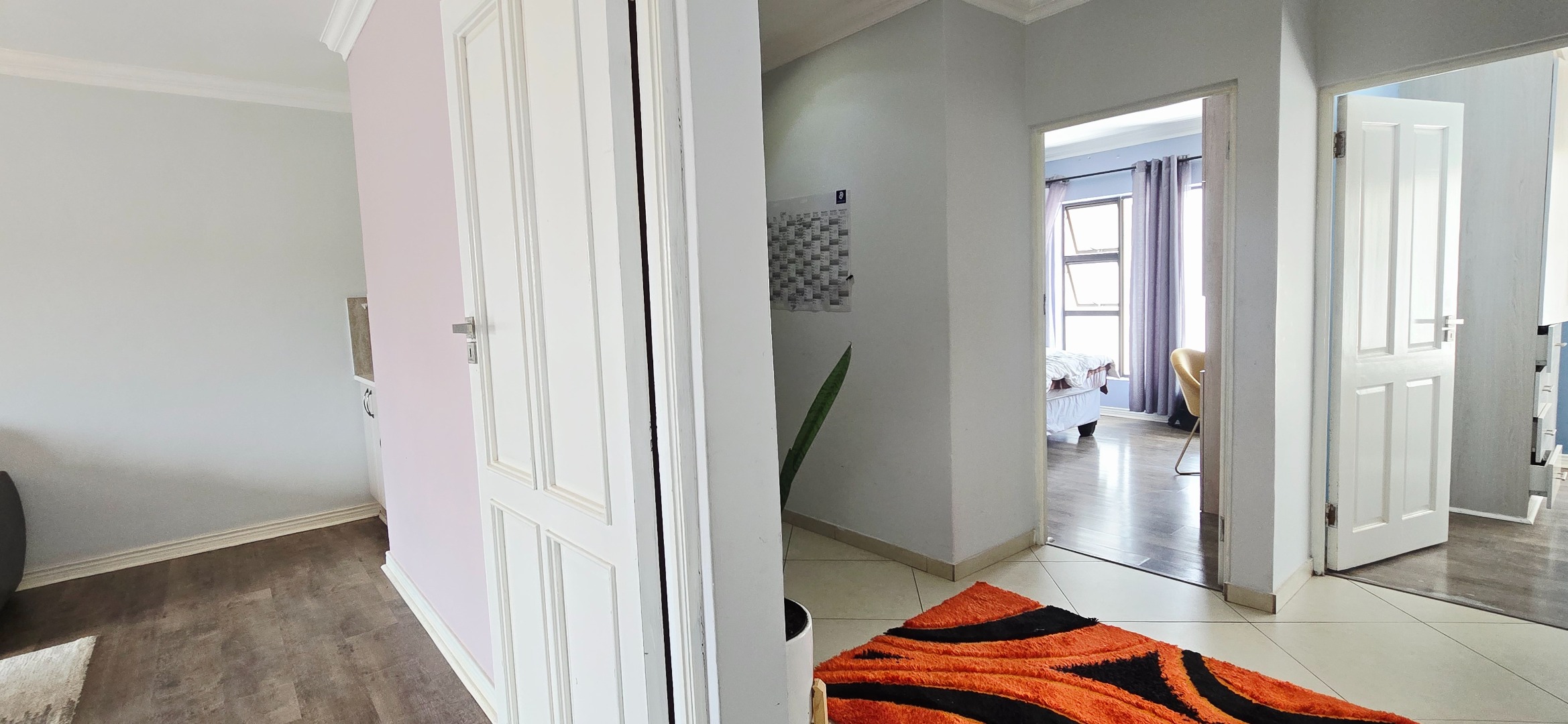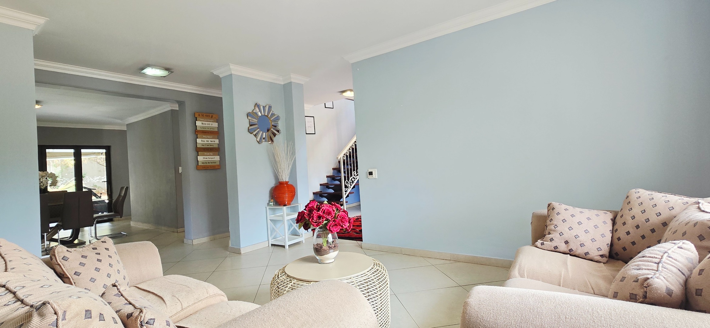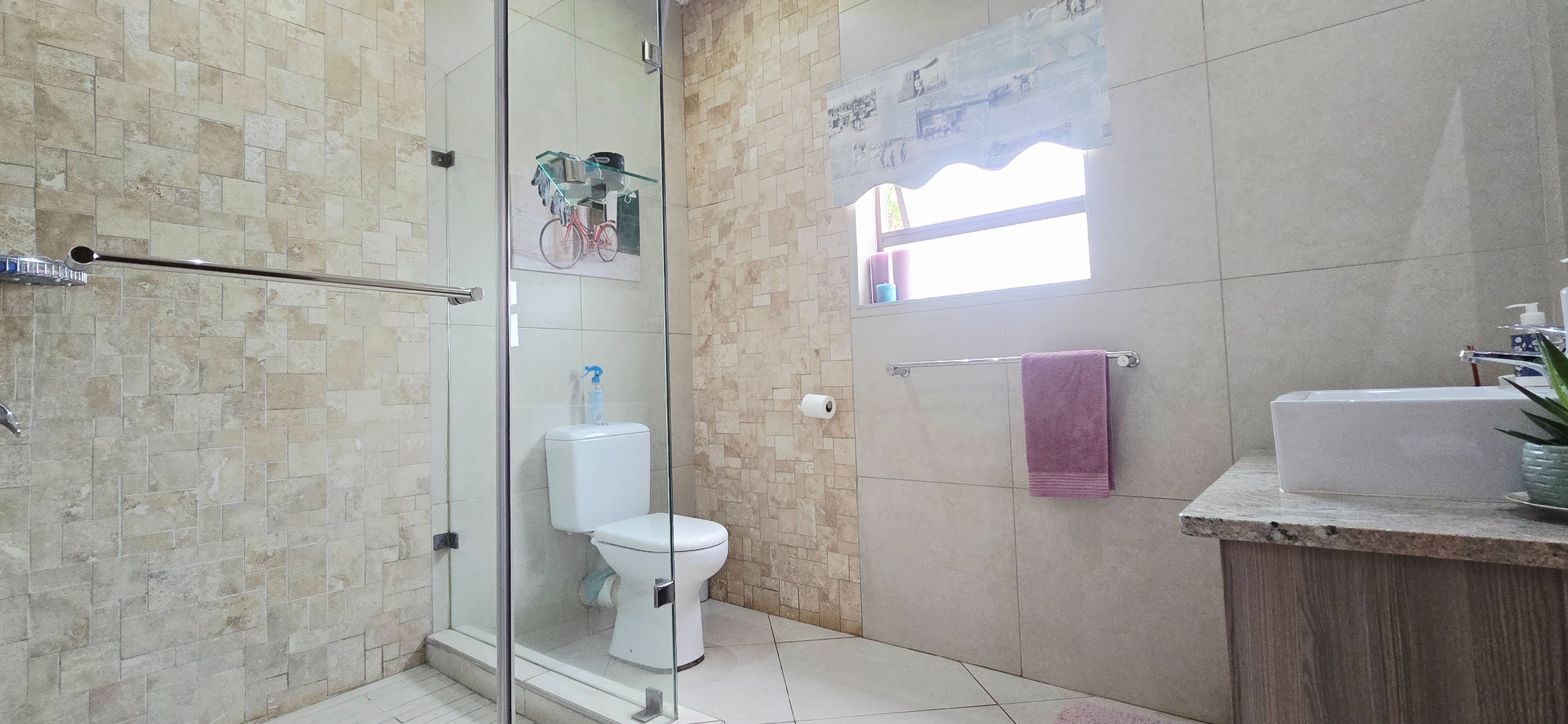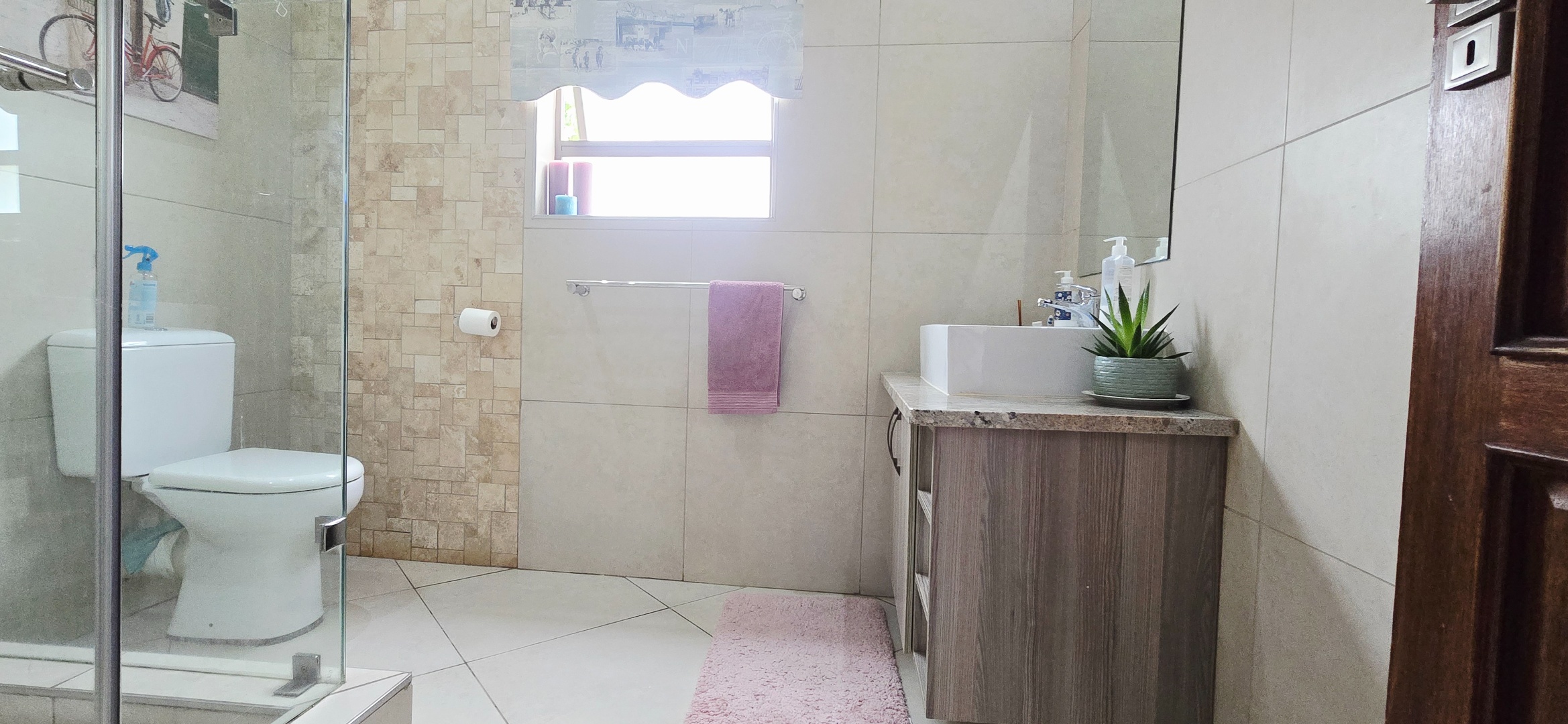 The front door leads you to an open plan home with reception area, living room and dining room flowing out to the enclosed braai room and open patio which overlooks the large garden and sparkling swimming pool. The braai room is enclosed, but can be opened up to join in with the larger patio when you entertain larger groups. The garden space is wonderfully spacious for ball play or furry friends.