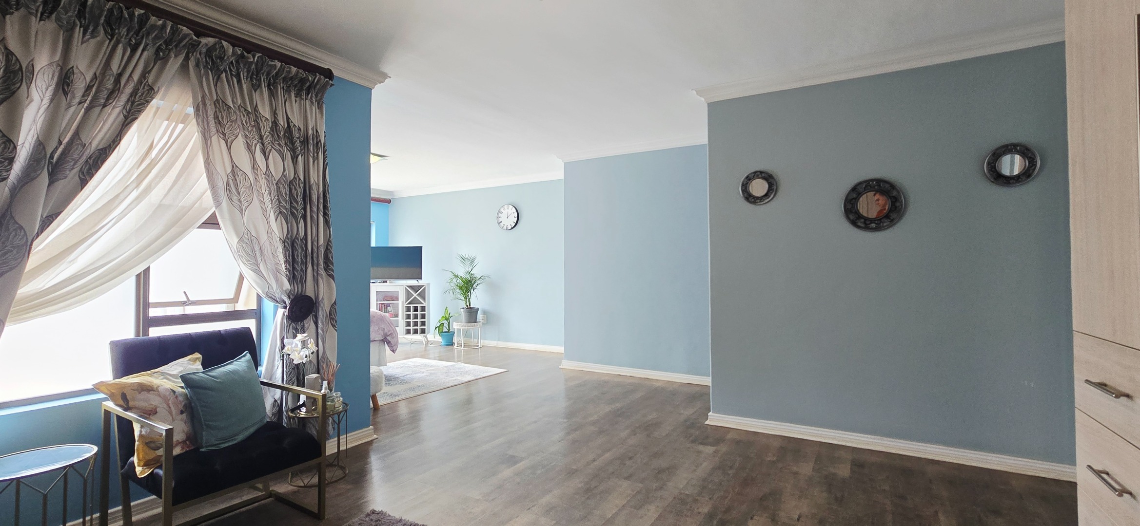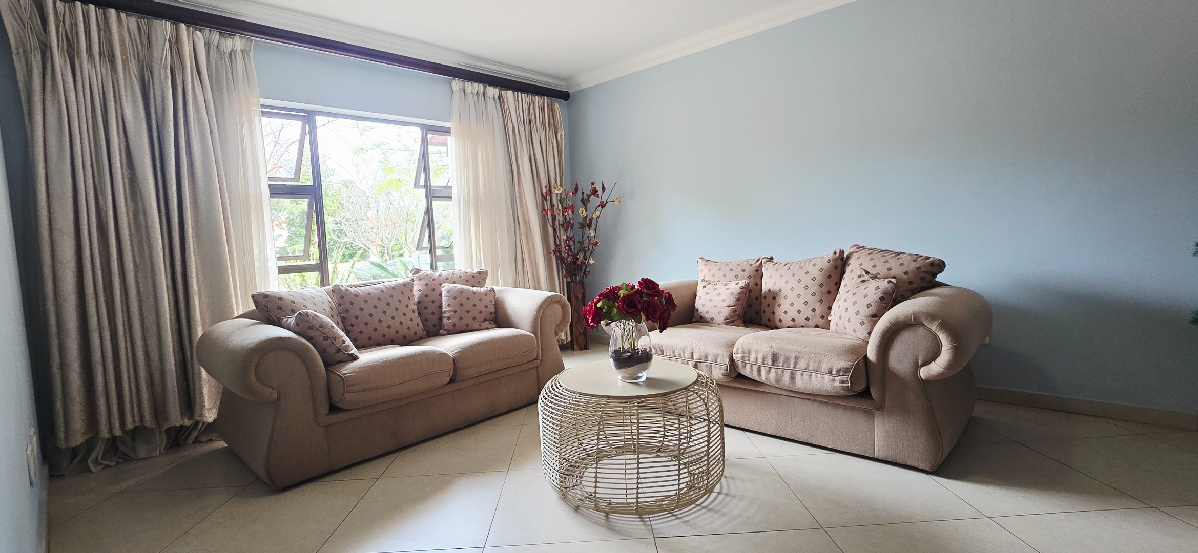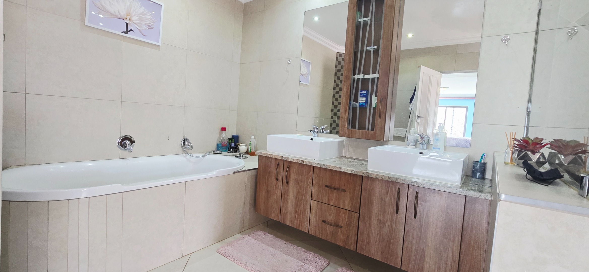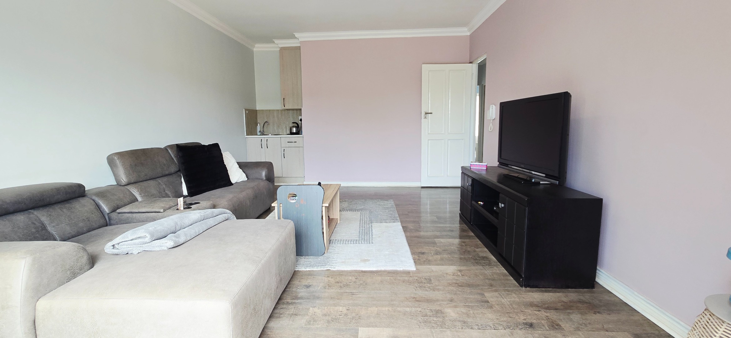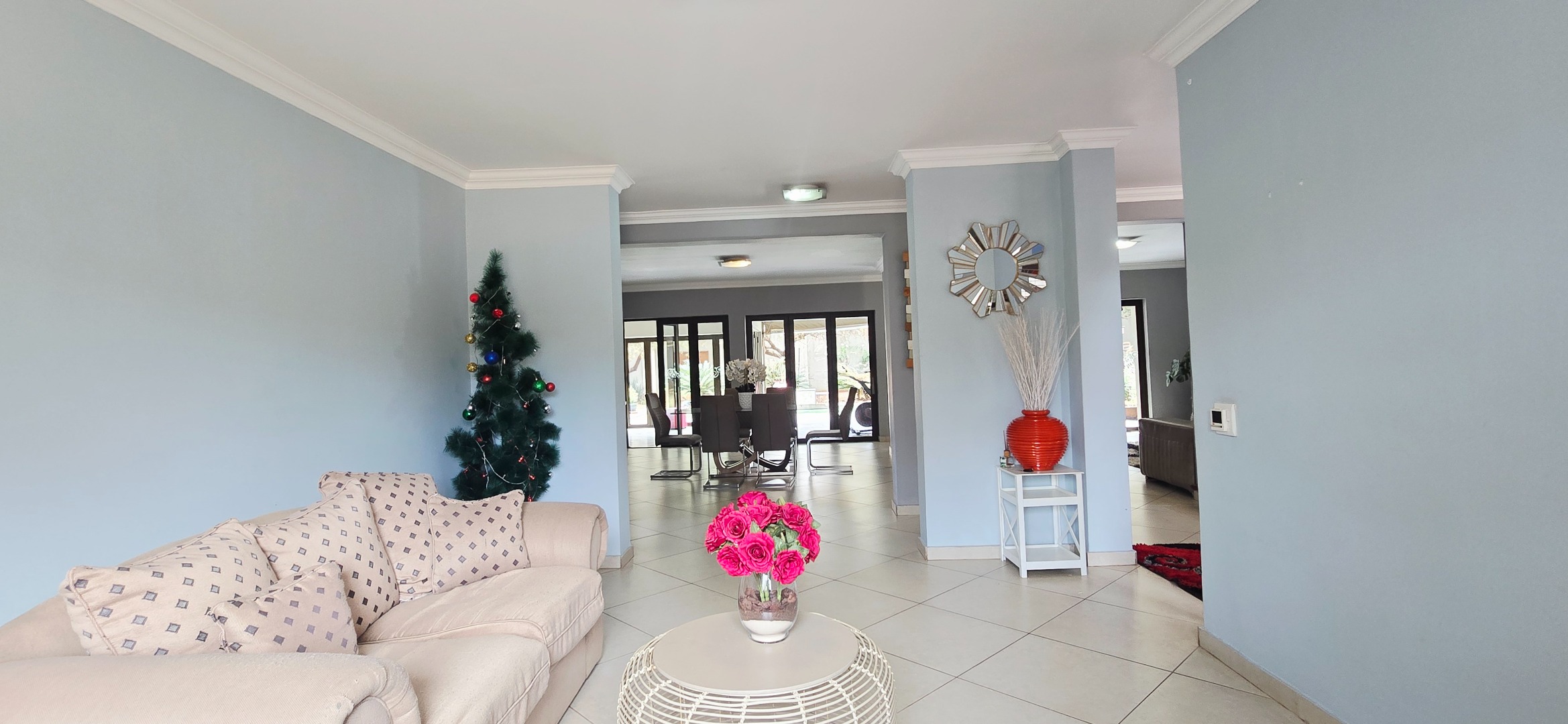 The front door leads you to an open plan home with reception area, living room and dining room flowing out to the enclosed braai room and open patio which overlooks the large garden and sparkling swimming pool. The braai room is enclosed, but can be opened up to join in with the larger patio when you entertain larger groups. The garden space is wonderfully spacious for ball play or furry friends.