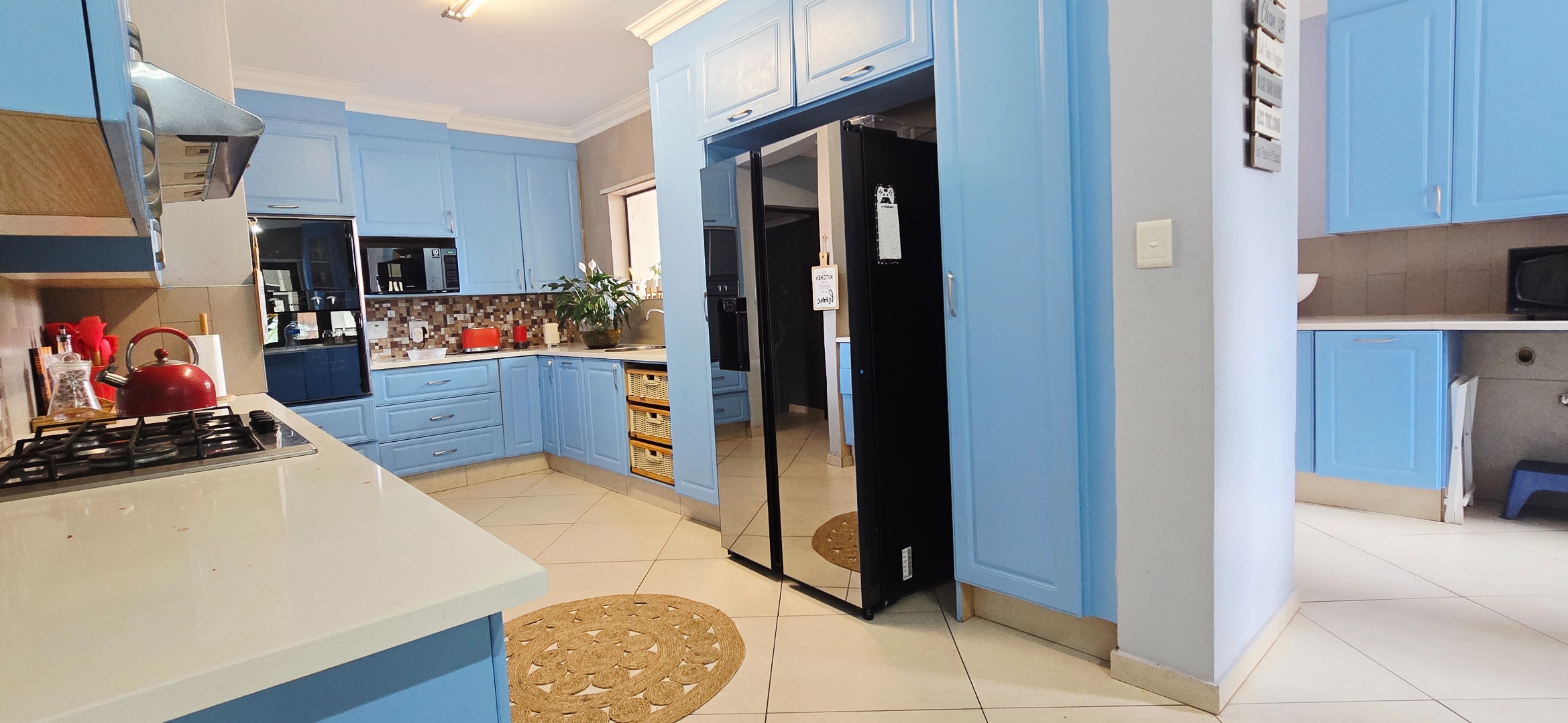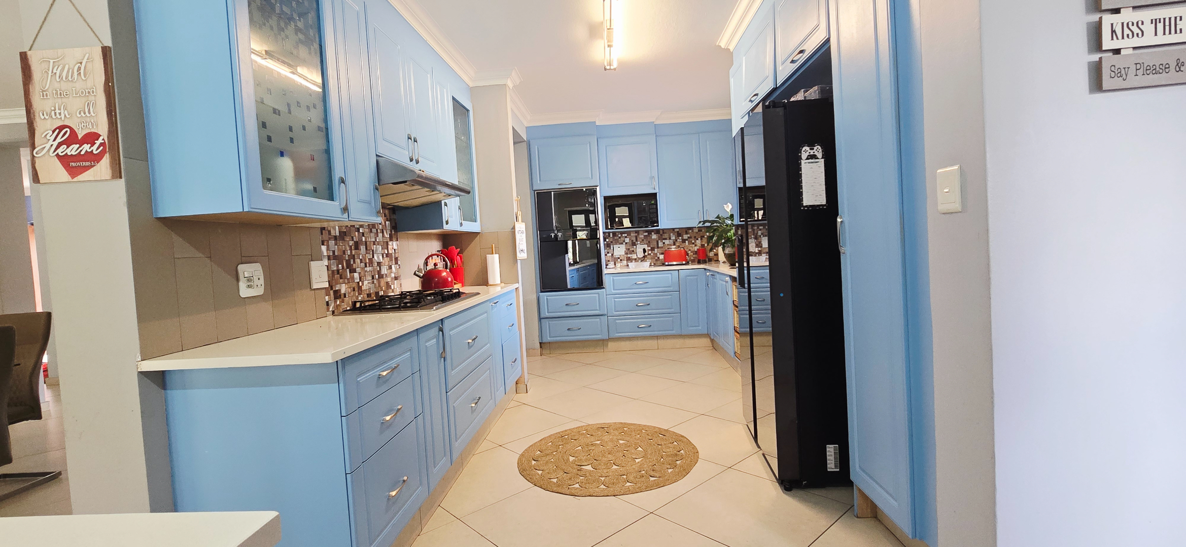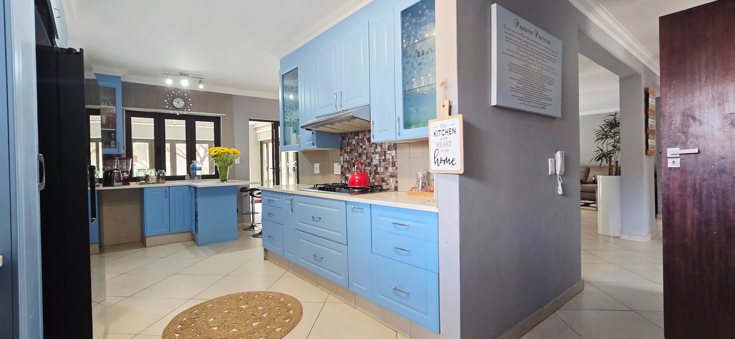 For winter formal dinners, the dining room can accommodate a larger dining room set. The dining space flows to the modern kitchen. Granite tops combine perfectly with cornflower blue cabinets. The scullery is spacious and leads out to a courtyard.
