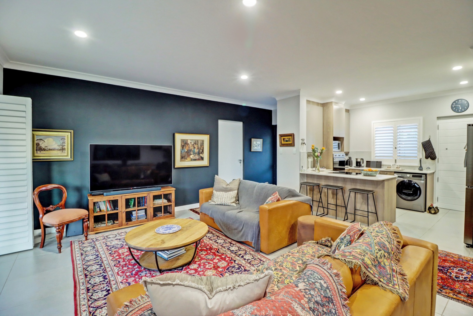 Step inside to an expansive open-plan living and dining area, where abundant natural light cascades through large bi-fold and sliding glass doors, seamlessly merging indoor comfort with the serene outdoor environment. The contemporary kitchen is a culinary masterpiece, boasting sleek cabinetry, pristine white countertops, and integrated appliances including a glass hob, oven, microwave, and dishwasher. Recessed lighting and stylish plantation shutters enhance the ambiance, while a dedicated braai room promises effortless entertaining.
