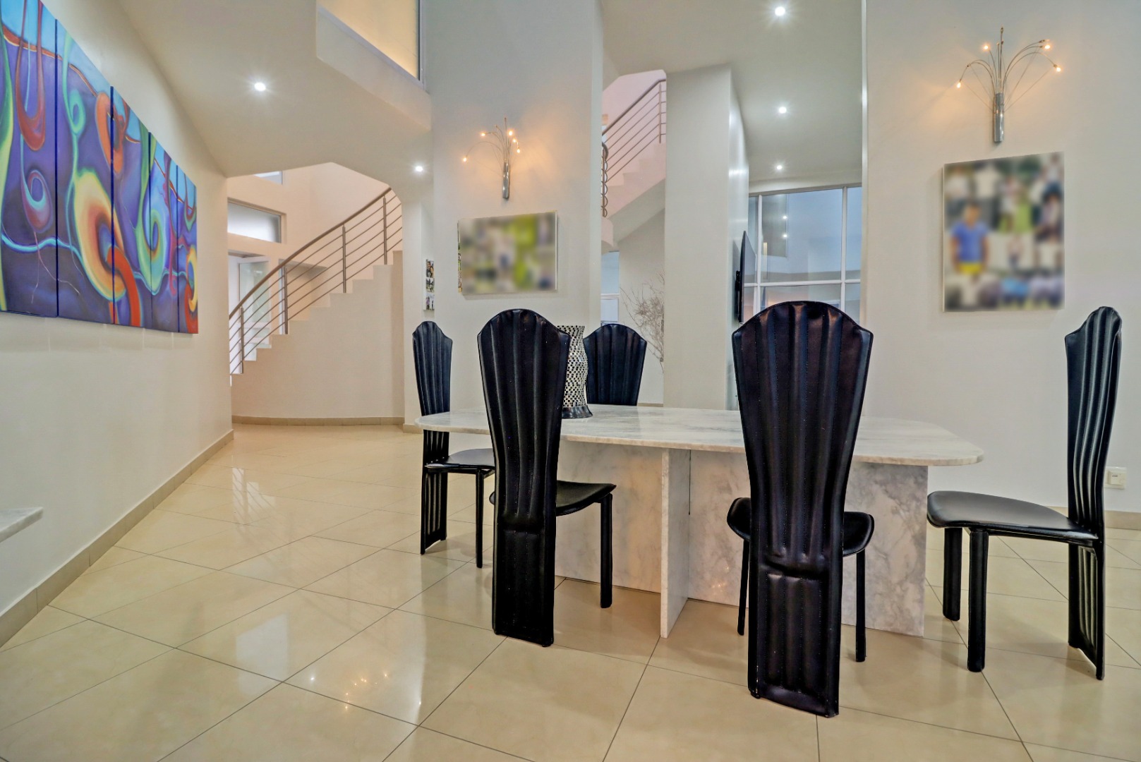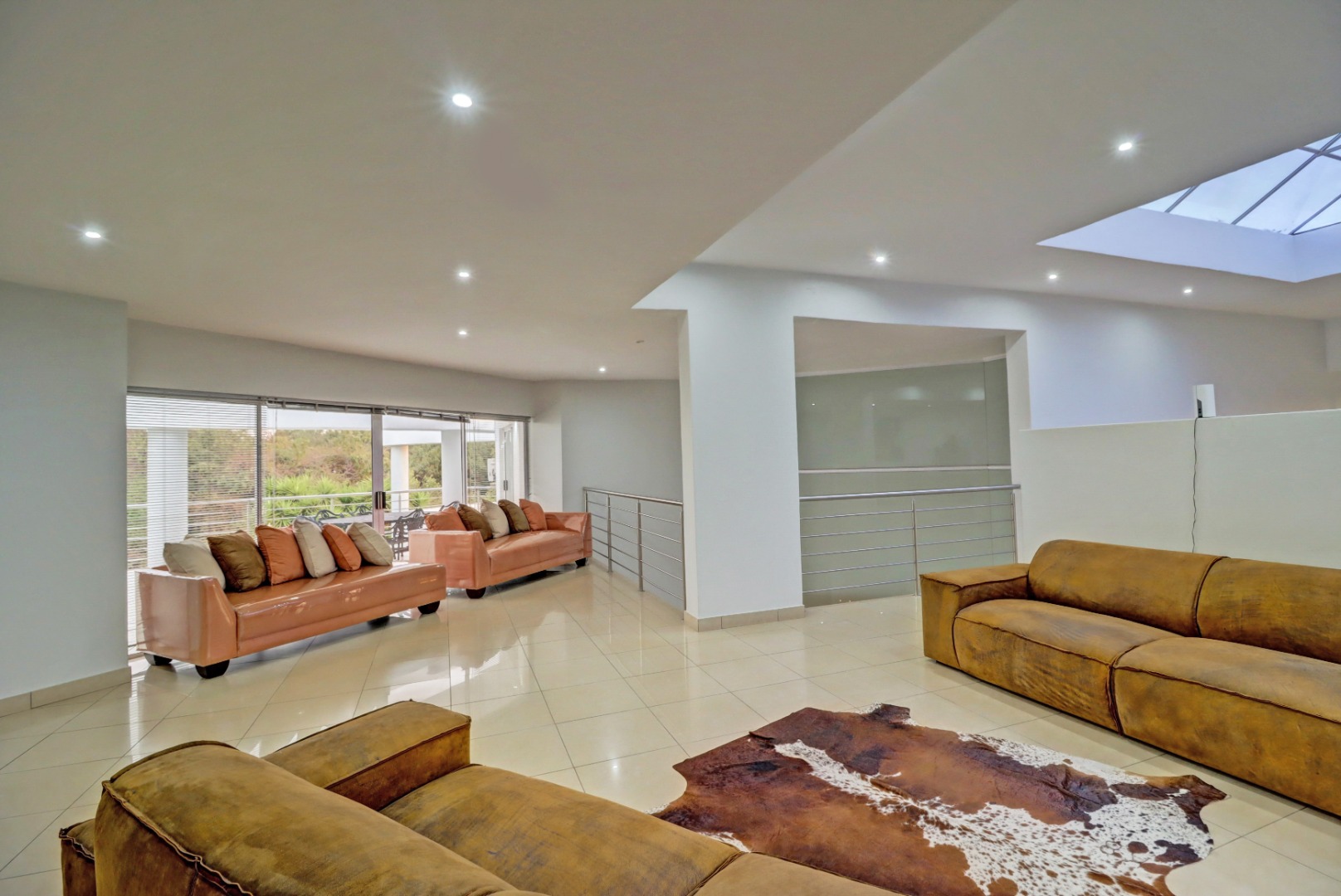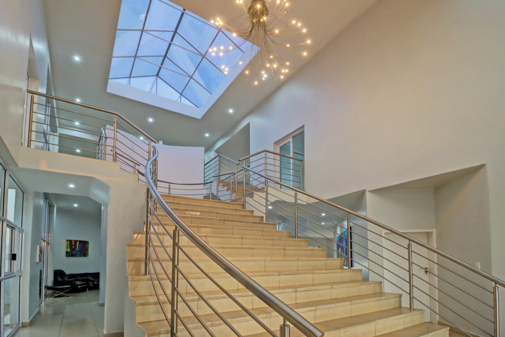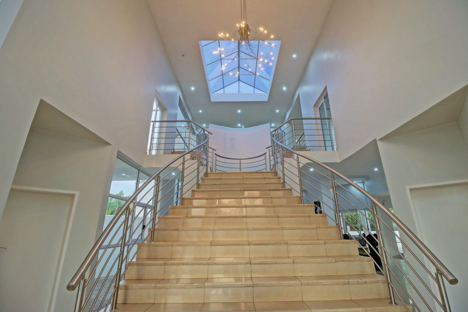 Discover an architectural masterpiece nestled within the prestigious Woodhill, Pretoria, offering an unparalleled lifestyle of sophistication and comfort. This modern, multi-story residence captivates with its sleek design, prominent covered entrance, and meticulously maintained exterior. Step inside to a grand, brightly lit entrance foyer, where high ceilings, a symmetrical staircase with stainless steel railings, and a contemporary chandelier create an immediate sense of grandeur. The expansive open-plan living areas, featuring four distinct lounges and a dedicated dining room, are bathed in natural light from large windows and seamlessly connect to the outdoors through elegant glass doors, all set upon pristine tiled flooring.
