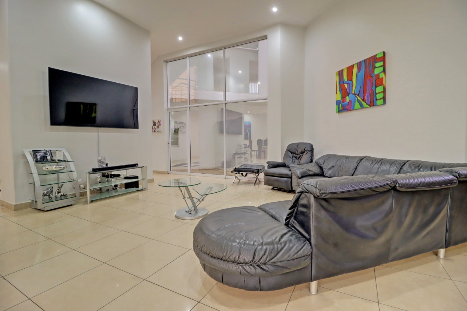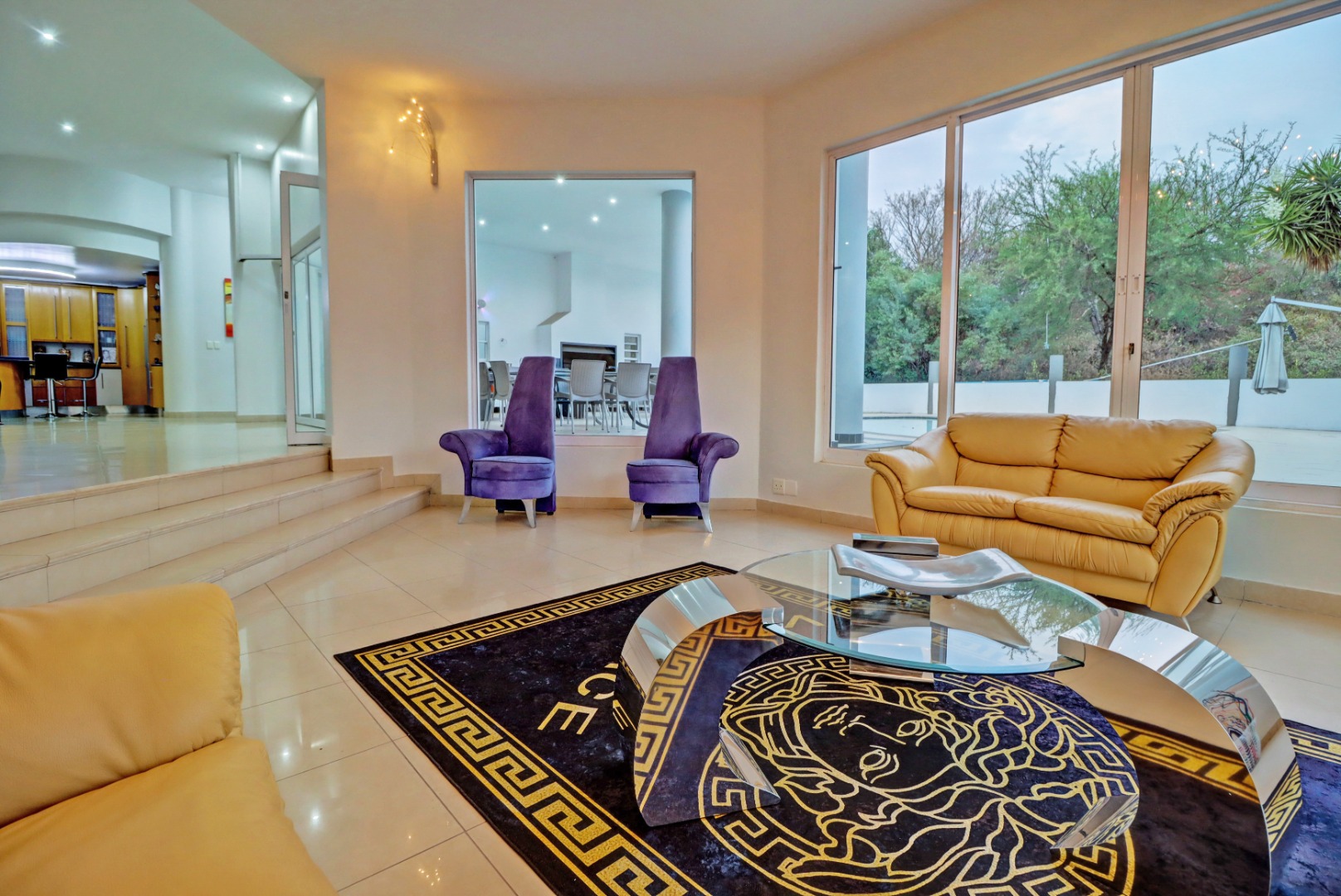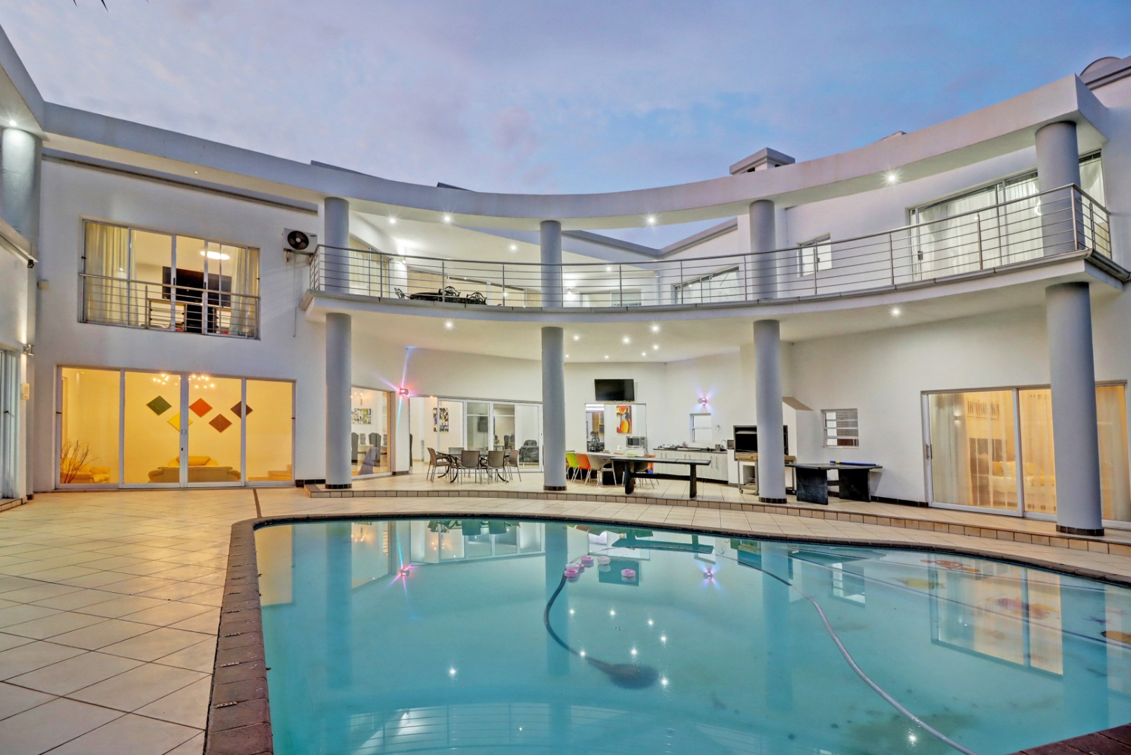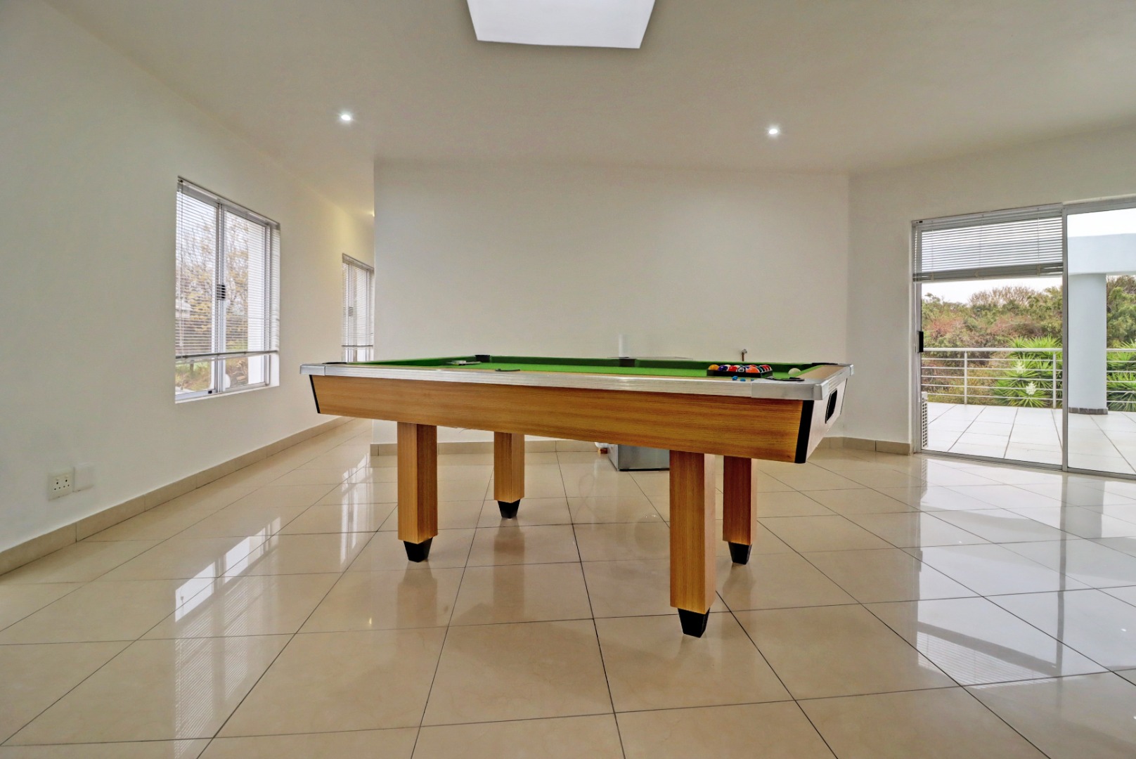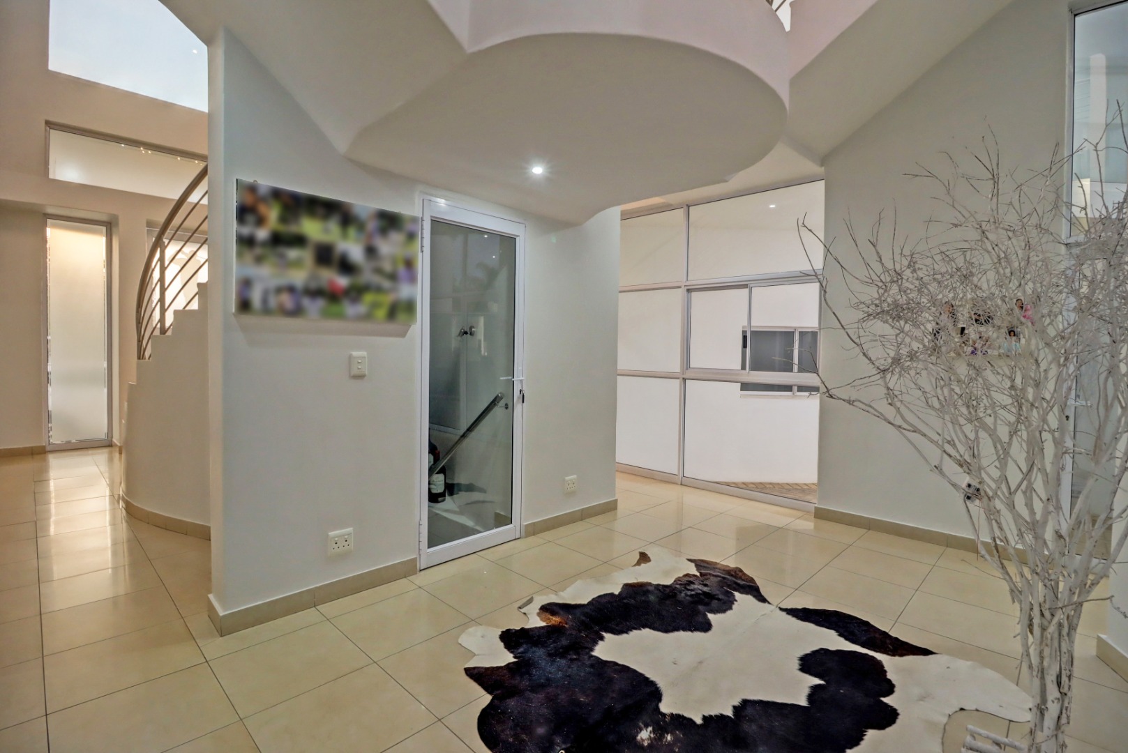 Discover an architectural masterpiece nestled within the prestigious Woodhill, Pretoria, offering an unparalleled lifestyle of sophistication and comfort. This modern, multi-story residence captivates with its sleek design, prominent covered entrance, and meticulously maintained exterior. Step inside to a grand, brightly lit entrance foyer, where high ceilings, a symmetrical staircase with stainless steel railings, and a contemporary chandelier create an immediate sense of grandeur. The expansive open-plan living areas, featuring four distinct lounges and a dedicated dining room, are bathed in natural light from large windows and seamlessly connect to the outdoors through elegant glass doors, all set upon pristine tiled flooring.
