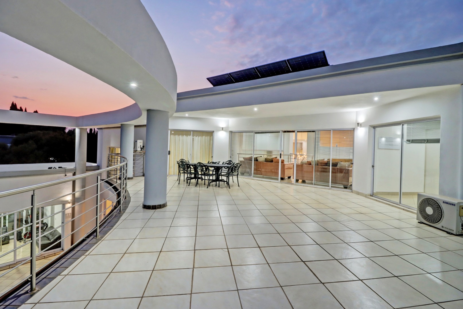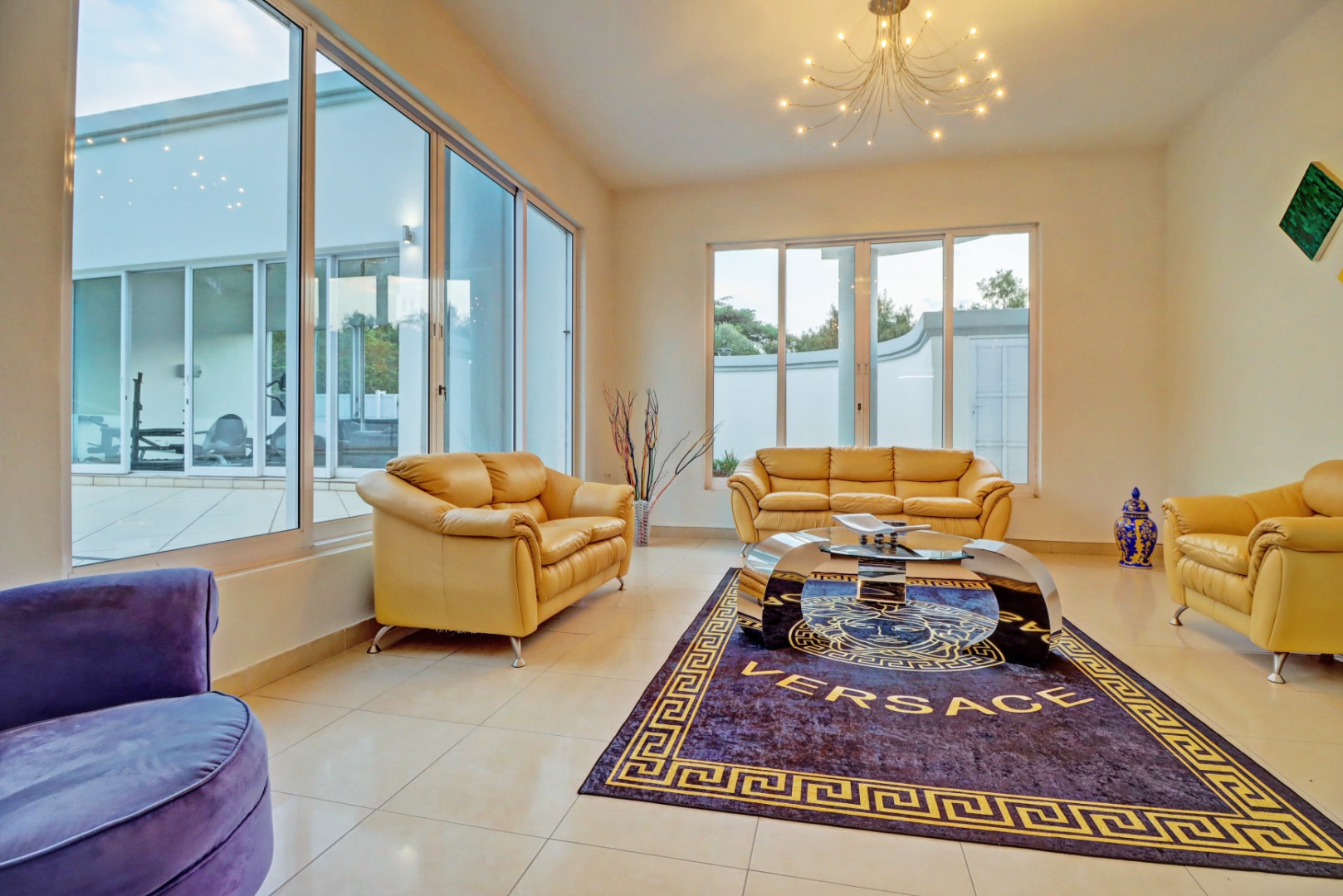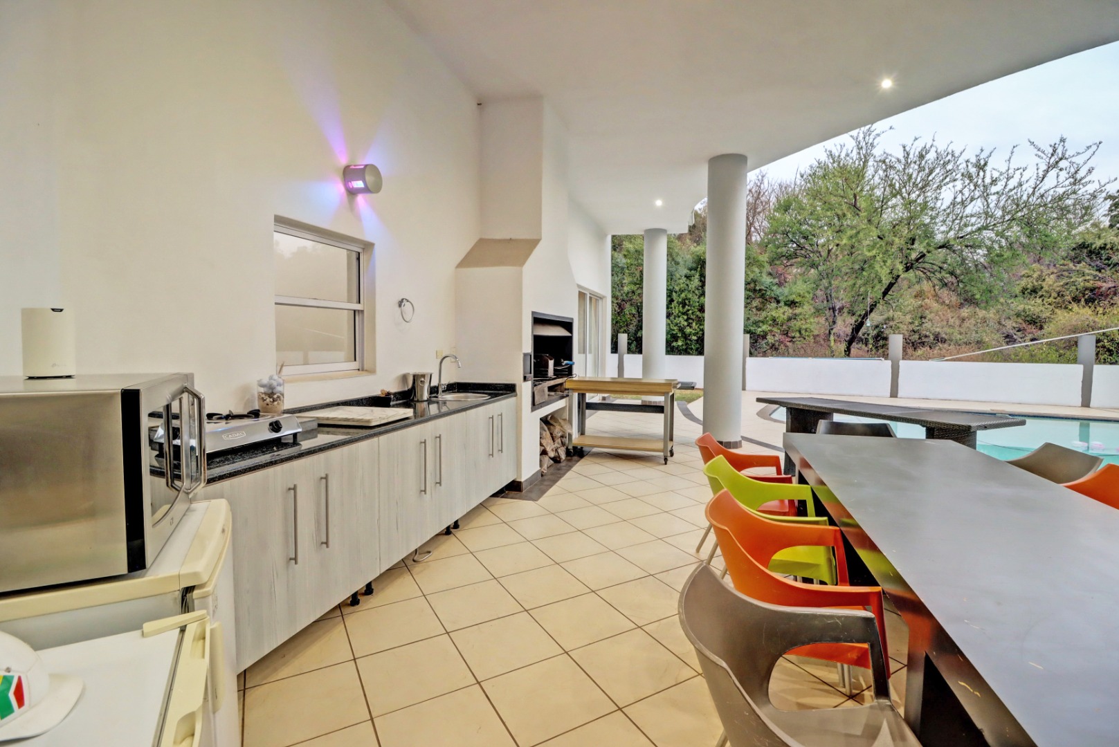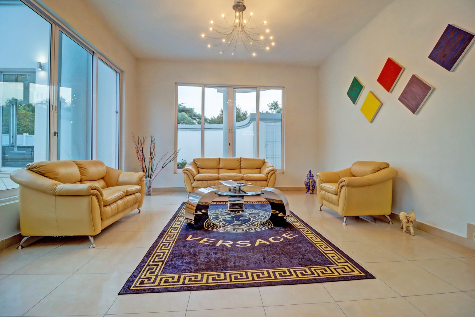 Discover an architectural masterpiece nestled within the prestigious Woodhill, Pretoria, offering an unparalleled lifestyle of sophistication and comfort. This modern, multi-story residence captivates with its sleek design, prominent covered entrance, and meticulously maintained exterior. Step inside to a grand, brightly lit entrance foyer, where high ceilings, a symmetrical staircase with stainless steel railings, and a contemporary chandelier create an immediate sense of grandeur. The expansive open-plan living areas, featuring four distinct lounges and a dedicated dining room, are bathed in natural light from large windows and seamlessly connect to the outdoors through elegant glass doors, all set upon pristine tiled flooring.