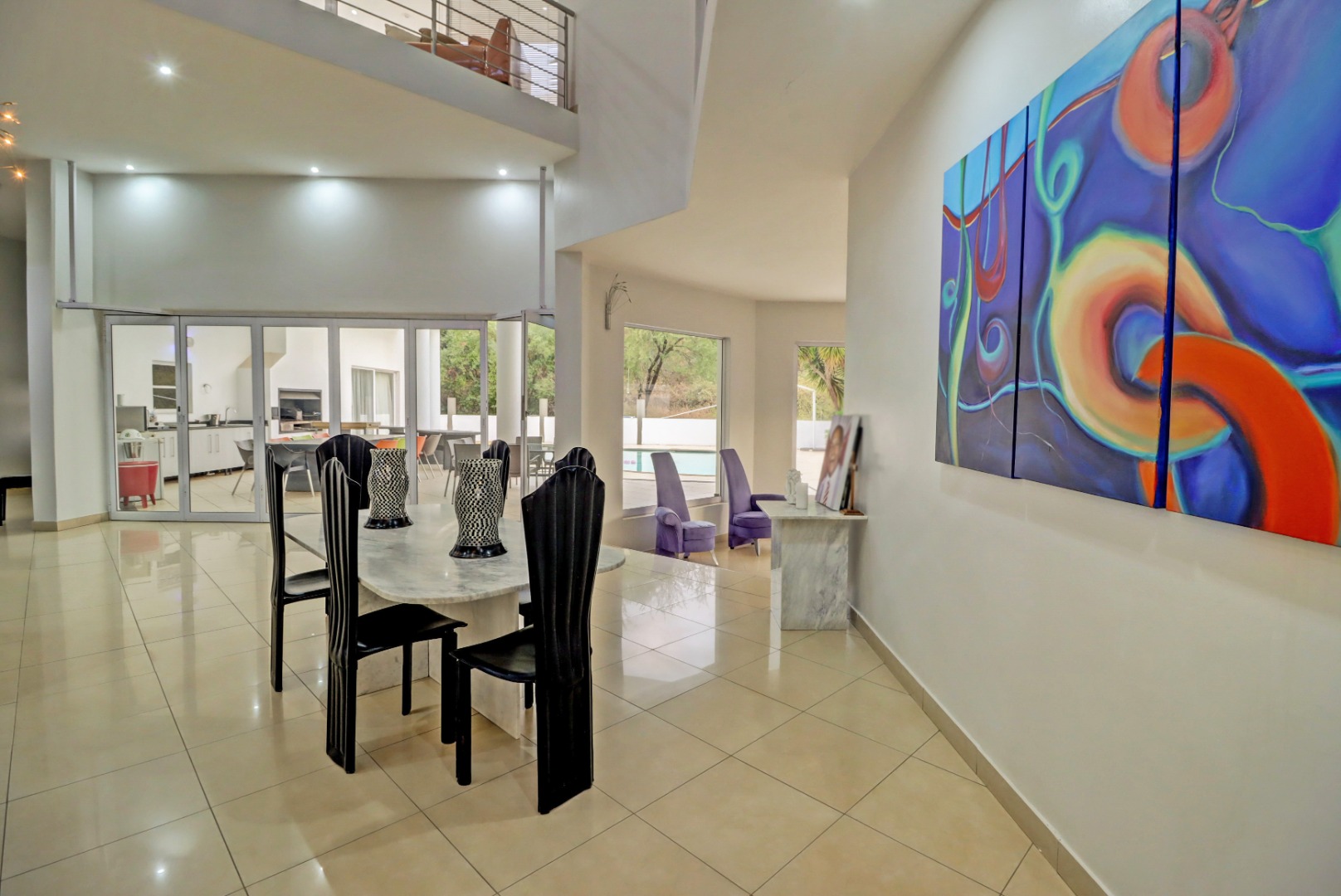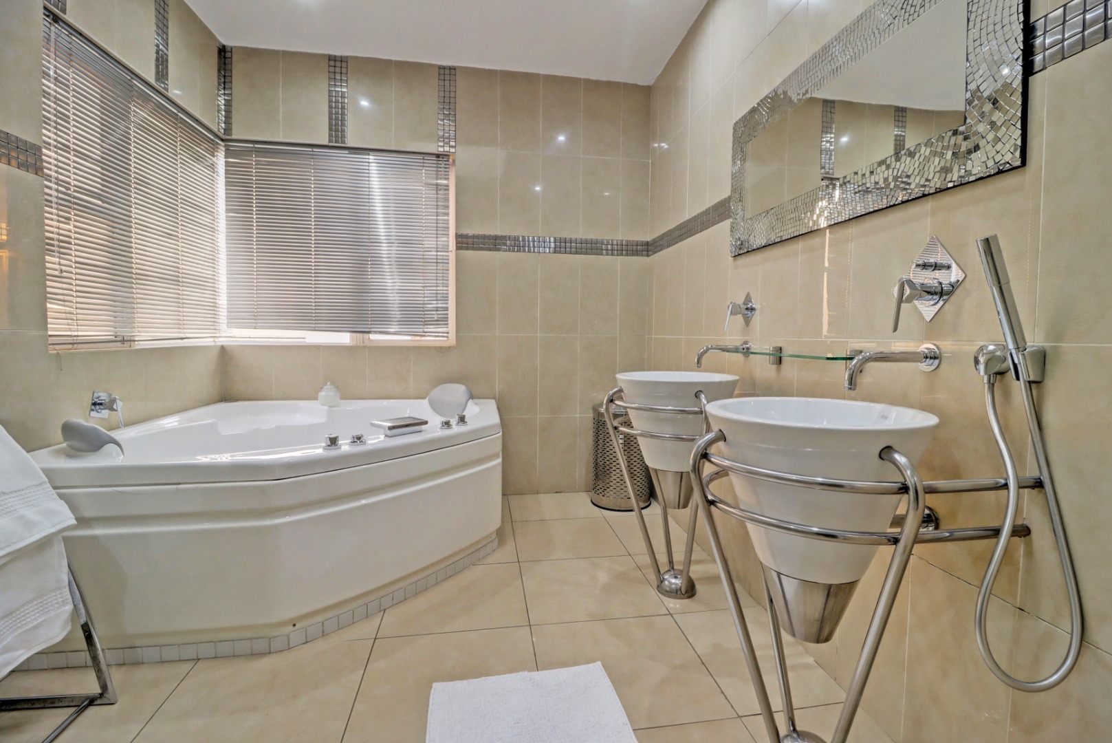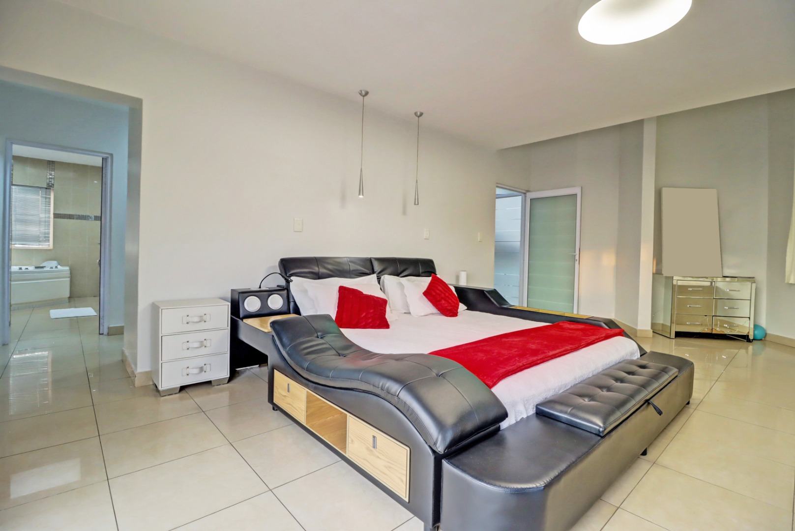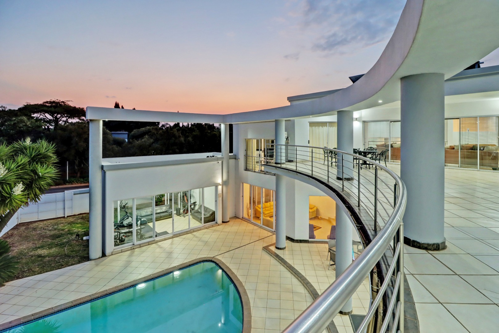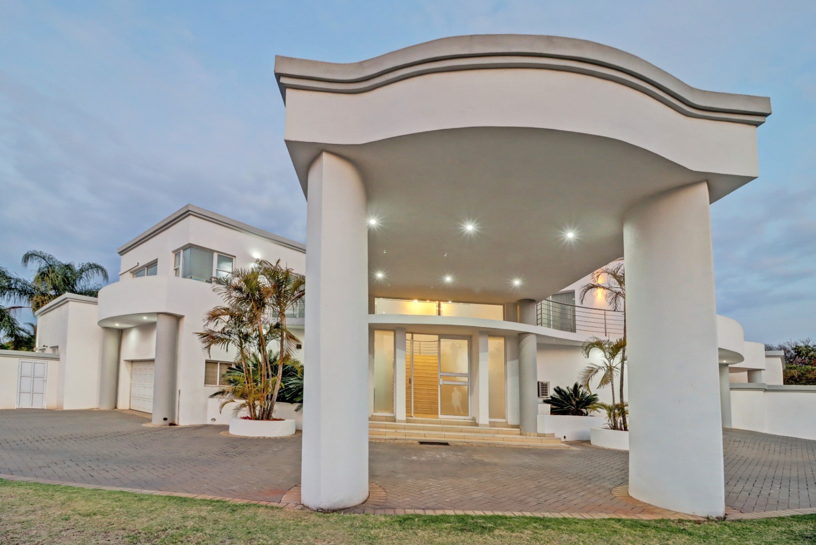 Discover an architectural masterpiece nestled within the prestigious Woodhill, Pretoria, offering an unparalleled lifestyle of sophistication and comfort. This modern, multi-story residence captivates with its sleek design, prominent covered entrance, and meticulously maintained exterior. Step inside to a grand, brightly lit entrance foyer, where high ceilings, a symmetrical staircase with stainless steel railings, and a contemporary chandelier create an immediate sense of grandeur. The expansive open-plan living areas, featuring four distinct lounges and a dedicated dining room, are bathed in natural light from large windows and seamlessly connect to the outdoors through elegant glass doors, all set upon pristine tiled flooring.