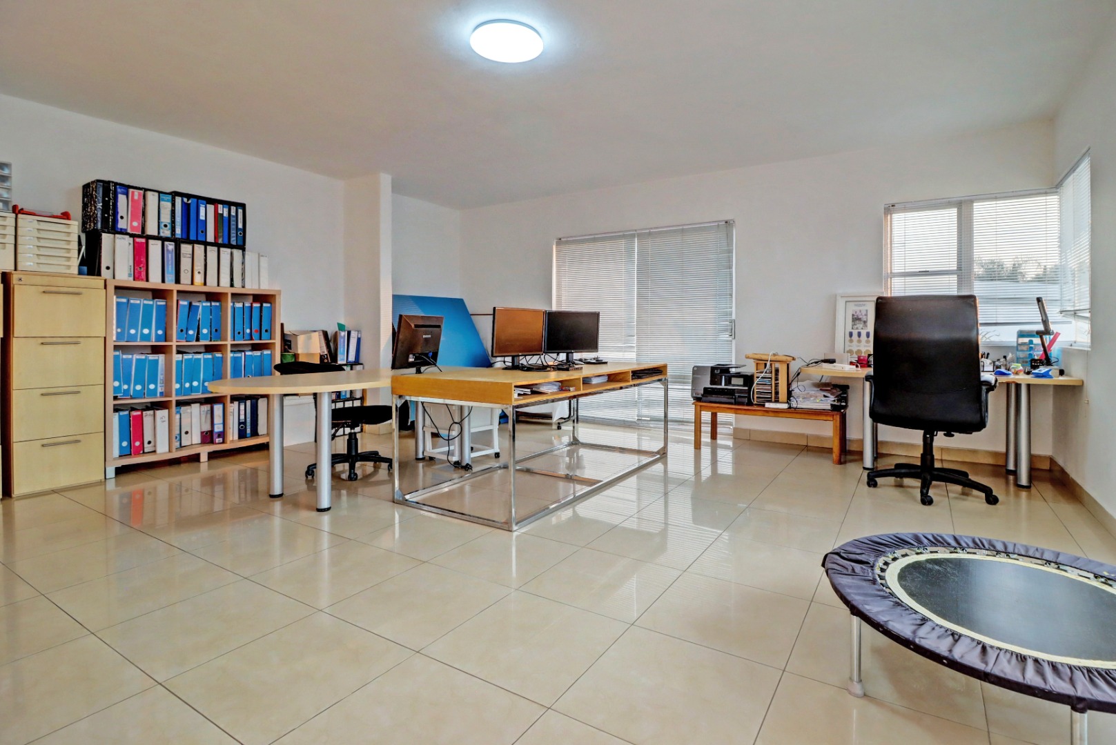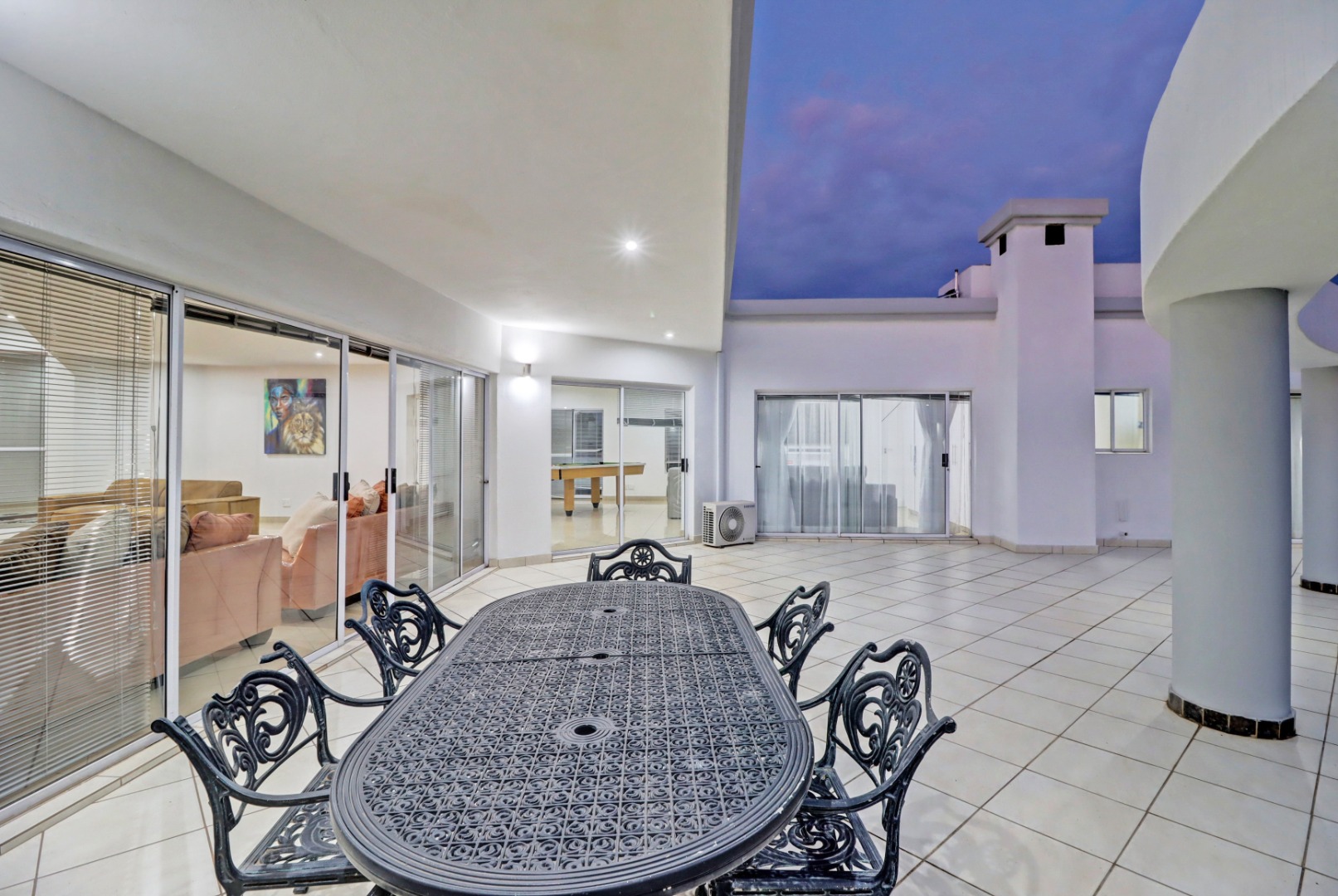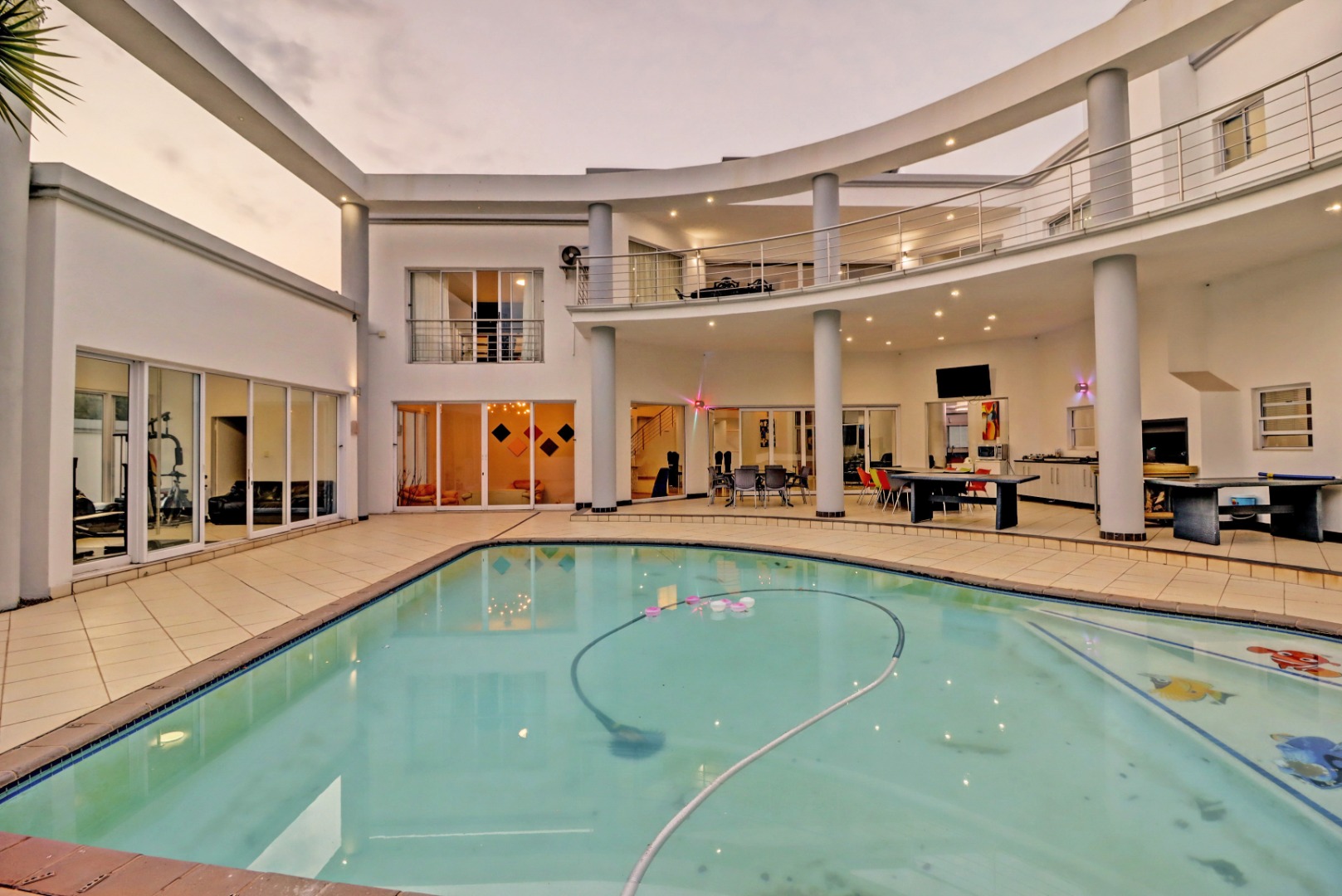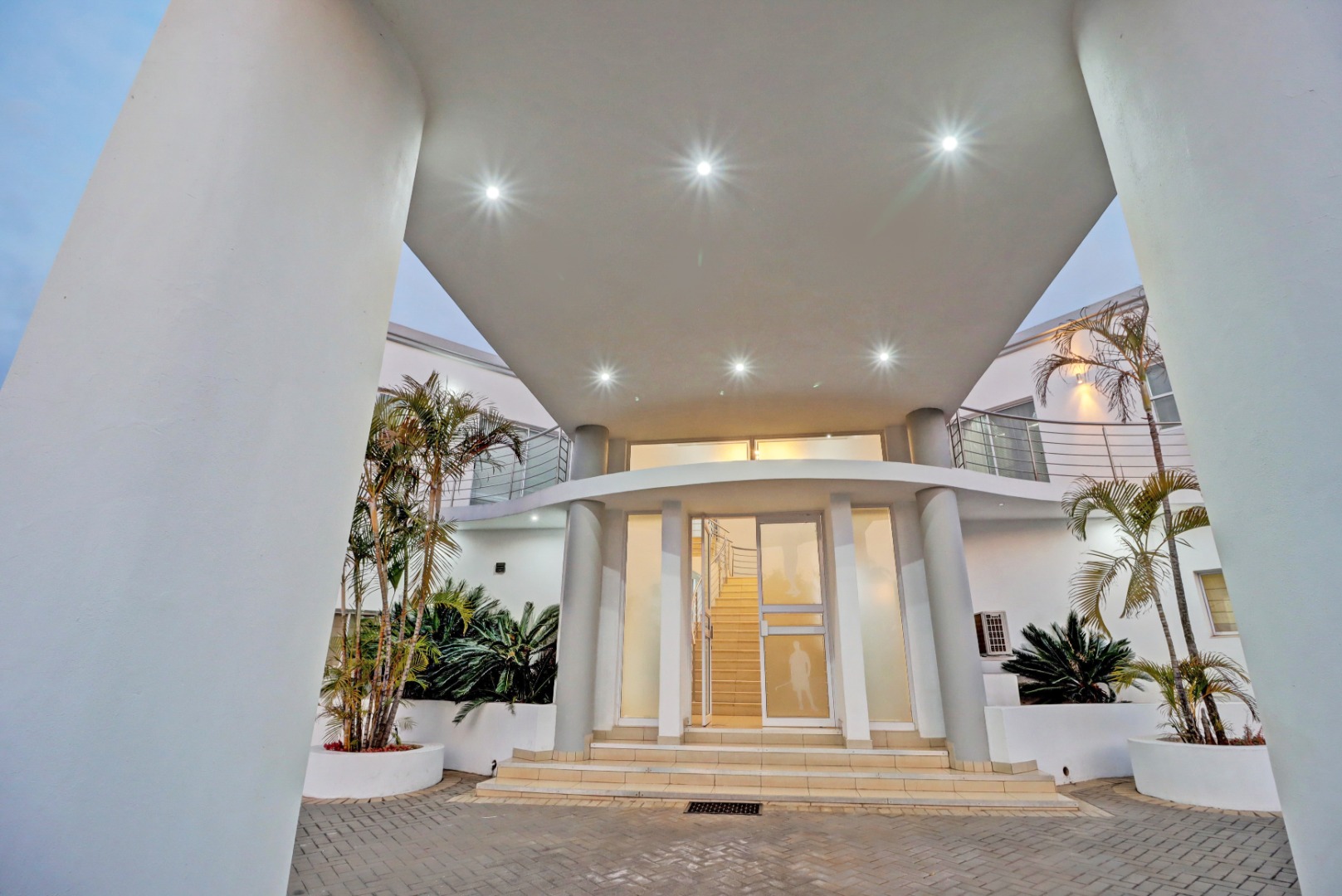 Discover an architectural masterpiece nestled within the prestigious Woodhill, Pretoria, offering an unparalleled lifestyle of sophistication and comfort. This modern, multi-story residence captivates with its sleek design, prominent covered entrance, and meticulously maintained exterior. Step inside to a grand, brightly lit entrance foyer, where high ceilings, a symmetrical staircase with stainless steel railings, and a contemporary chandelier create an immediate sense of grandeur. The expansive open-plan living areas, featuring four distinct lounges and a dedicated dining room, are bathed in natural light from large windows and seamlessly connect to the outdoors through elegant glass doors, all set upon pristine tiled flooring.