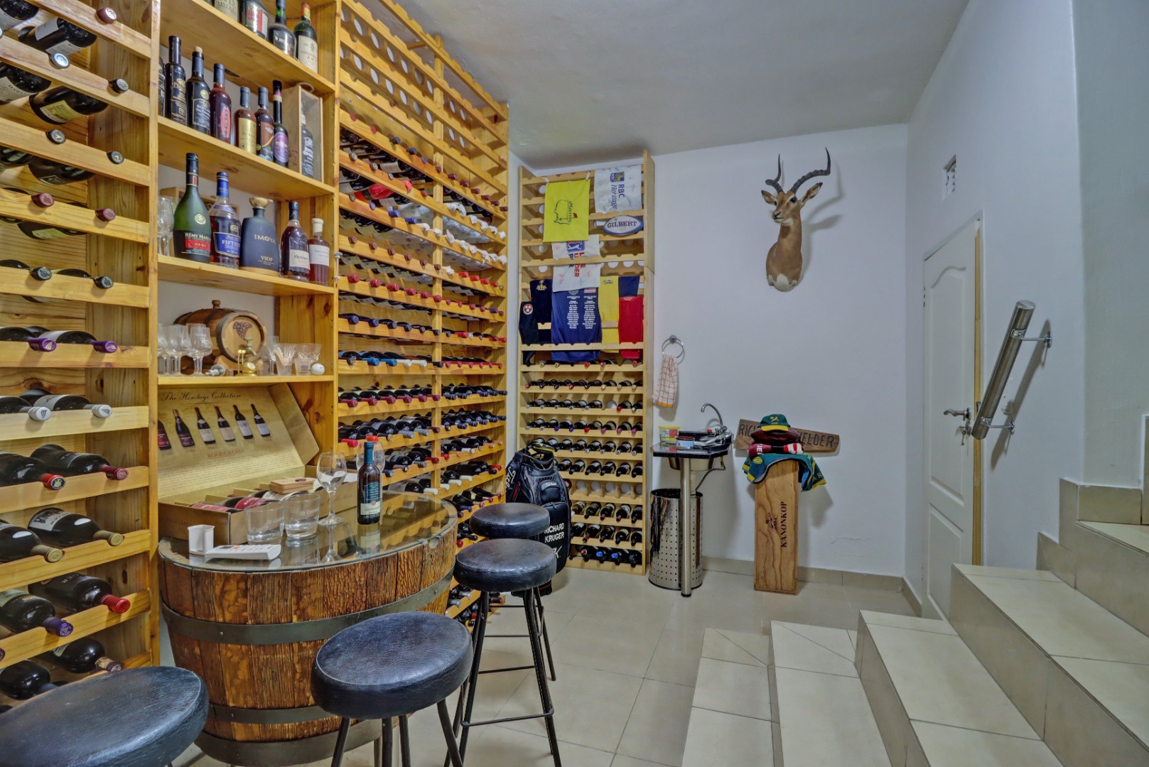 Embrace outdoor living with a striking curvilinear facade overlooking a large swimming pool, complemented by an expansive undercover entertainment area featuring a dining setup and a bar/kitchenette. A private patio, built-in braai, and an irrigated garden enhance the al fresco experience. Indulge your passions in the dedicated wine room, complete with extensive wooden racks and a tasting area. Residents also benefit from a private gym and access to the estate's world-class amenities, including a golf course, clubhouse, squash court, and tennis courts. Four garages and ample extra parking.