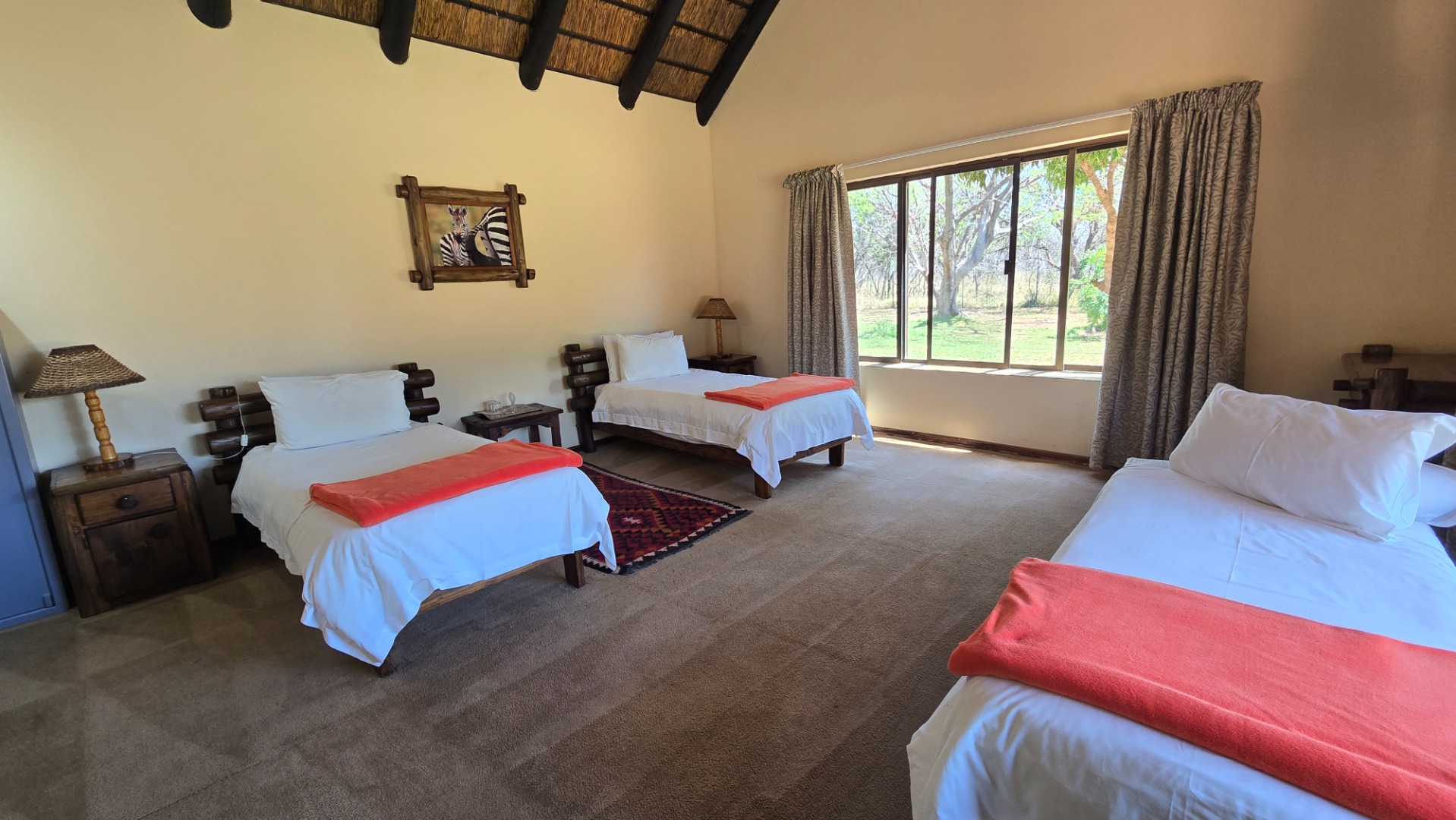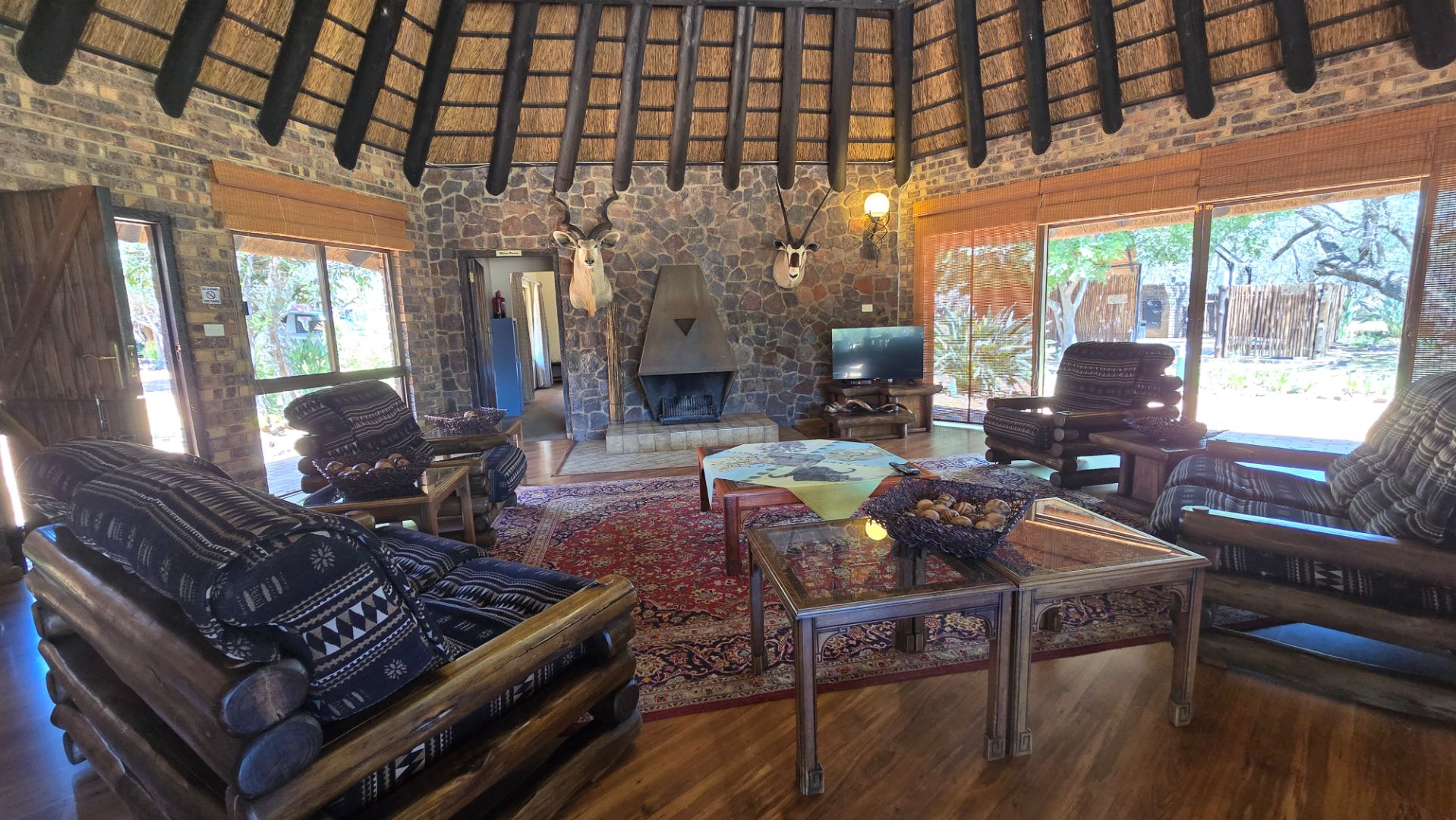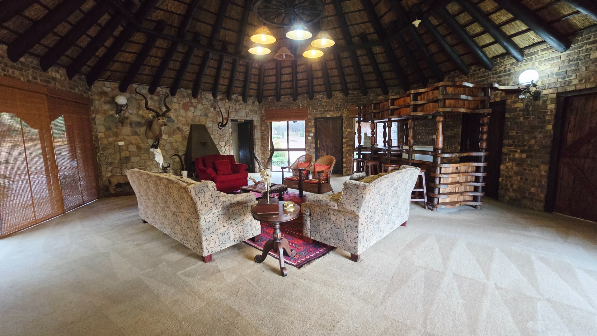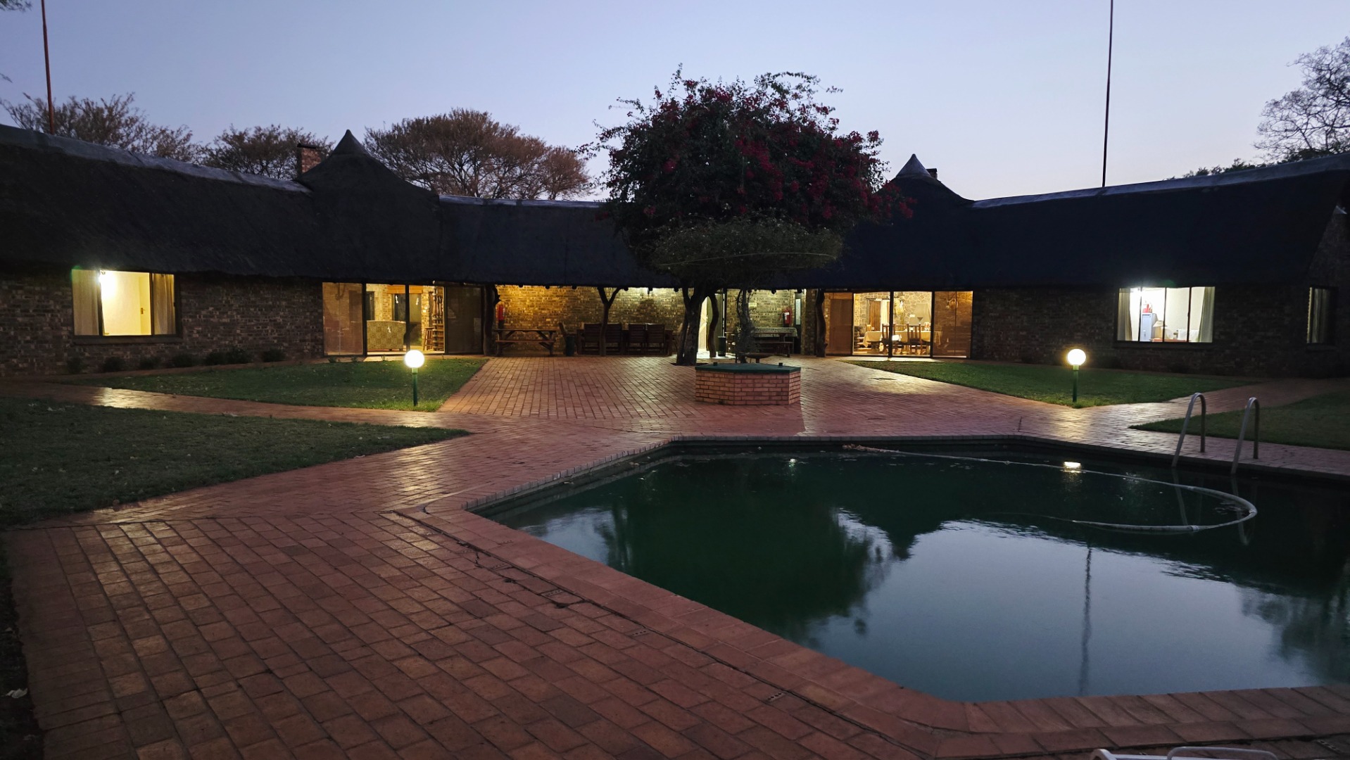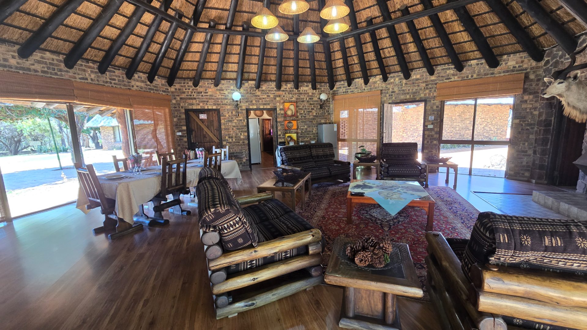 Improvements consist of and include a lodge with four En-Suite bedrooms, lounges, bar, recreation areas, conference room, industrial kitchen, large patio and swimming pool as well as a charming little chapel. A separate hunting camp with seven bedrooms, kitchen, ablution, braai boma and recreation area under thatch roof and at the large dam the two bedroomed chalet already mentioned.
