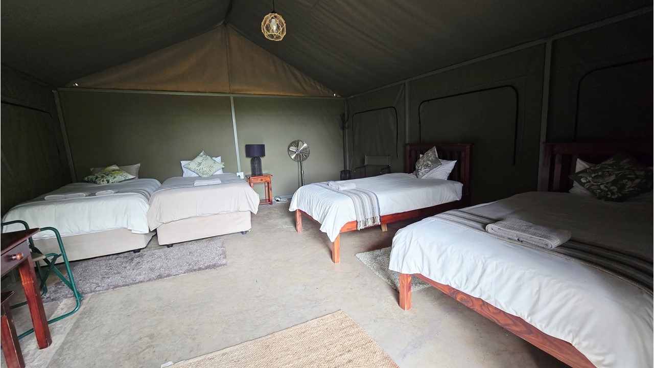 The first self-catering hunting camp offers 4 luxury safari tent chalets each with their own patio, a communal kitchen, ablution facilities, bar and boma area. The second hunting camp include six bedrooms, kitchen, bar and boma area.