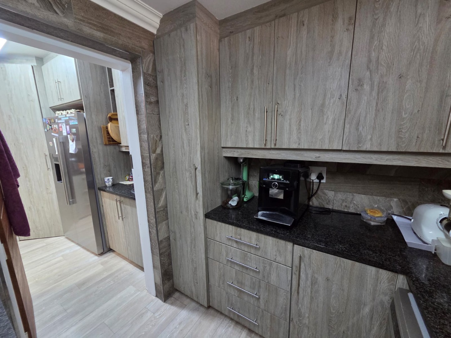 The stunning contemporary kitchen boasts generous cupboard space, a large gas hob, electric oven, and is complemented by a spacious scullery and laundry with room for three appliances – plus a dedicated coffee station for your morning routine.