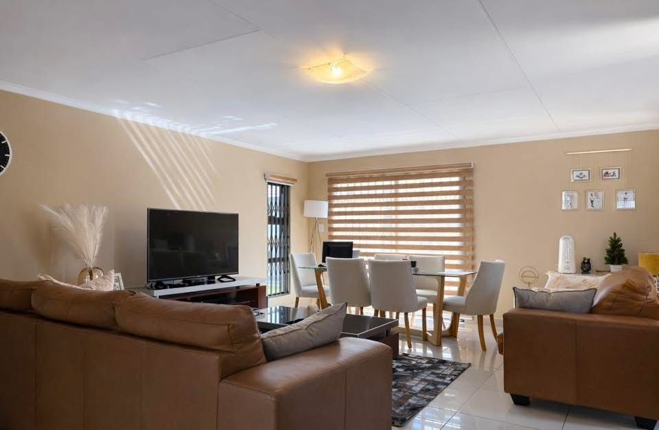 Discover modern living in this inviting 3-bedroom, 2-bathroom home situated within a desirable estate in Akasia, South Africa. Spanning a comfortable 150 sqm of floor space on a 419 sqm erf, this property offers a blend of contemporary design and practical features ideal for families or professionals. The heart of this home is its open-plan living and dining area, bathed in natural light from large windows fitted with modern blinds. The space features neutral decor and easy-to-maintain tiled flooring, creating a versatile environment for relaxation and entertaining. The modern kitchen seamlessly integrates into this area, boasting light-toned cabinetry, contrasting dark granite countertops, and a convenient breakfast bar. It is well-equipped with stainless steel appliances and ample storage, ensuring a functional and stylish culinary experience. The residence comprises three well-proportioned bedrooms, each designed for comfort. The bedrooms feature built-in wardrobes, offering generous storage solutions, and are finished with modern laminate flooring. One bedroom benefits from air conditioning, providing enhanced comfort. The two bathrooms are neatly appointed, catering to the needs of a busy household. Outdoor amenities include a double garage and additional parking space for two vehicles, providing secure accommodation for your vehicles. The property's location within an estate offers an added layer of community and peace of mind. Security bars on windows enhance safety without compromising the home's bright interior. Located in Heatherdale, a tranquil suburb of Akasia, this property benefits from a peaceful residential environment while maintaining convenient access to local amenities and transport routes within Akasia, South Africa. Key Features: * 3 Bedrooms, 2 Bathrooms * Open-plan Living & Dining Area * Modern Kitchen with Breakfast Bar * Built-in Wardrobes * Air Conditioning in one bedroom * Double Garage & 2 Parking Spaces * Tiled & Laminate Flooring * Estate Living * 419 sqm Erf, 150 sqm Floor Size