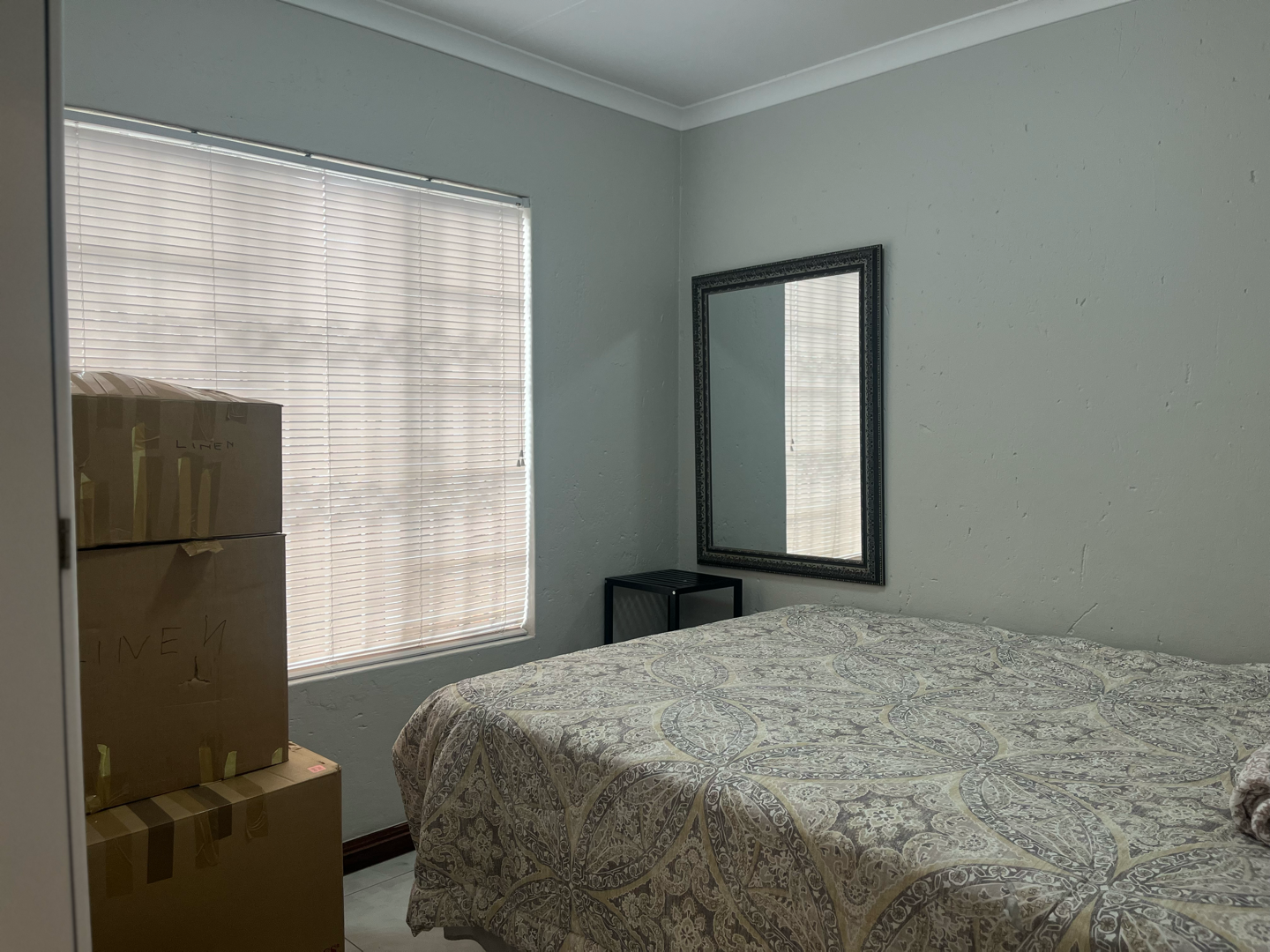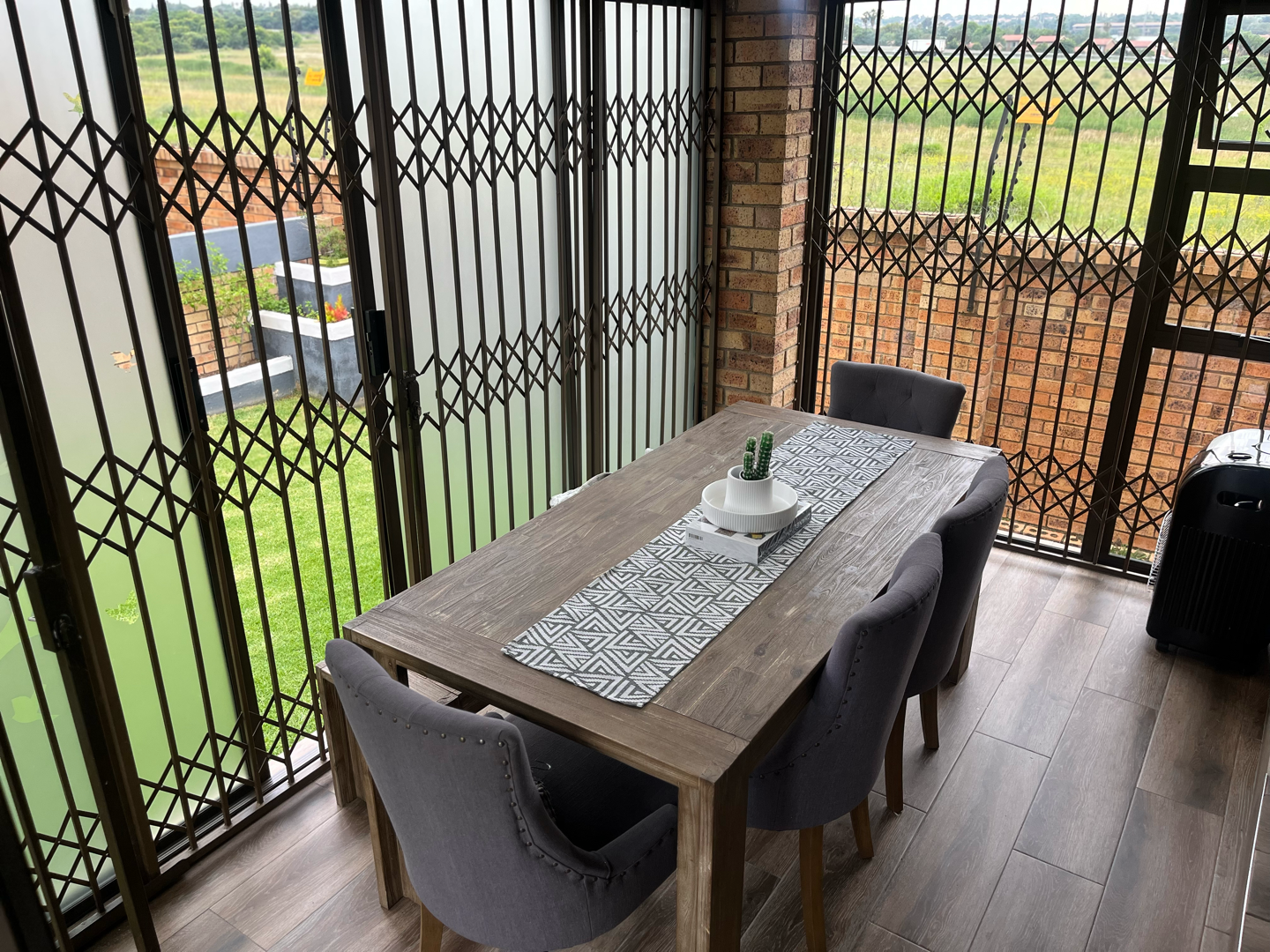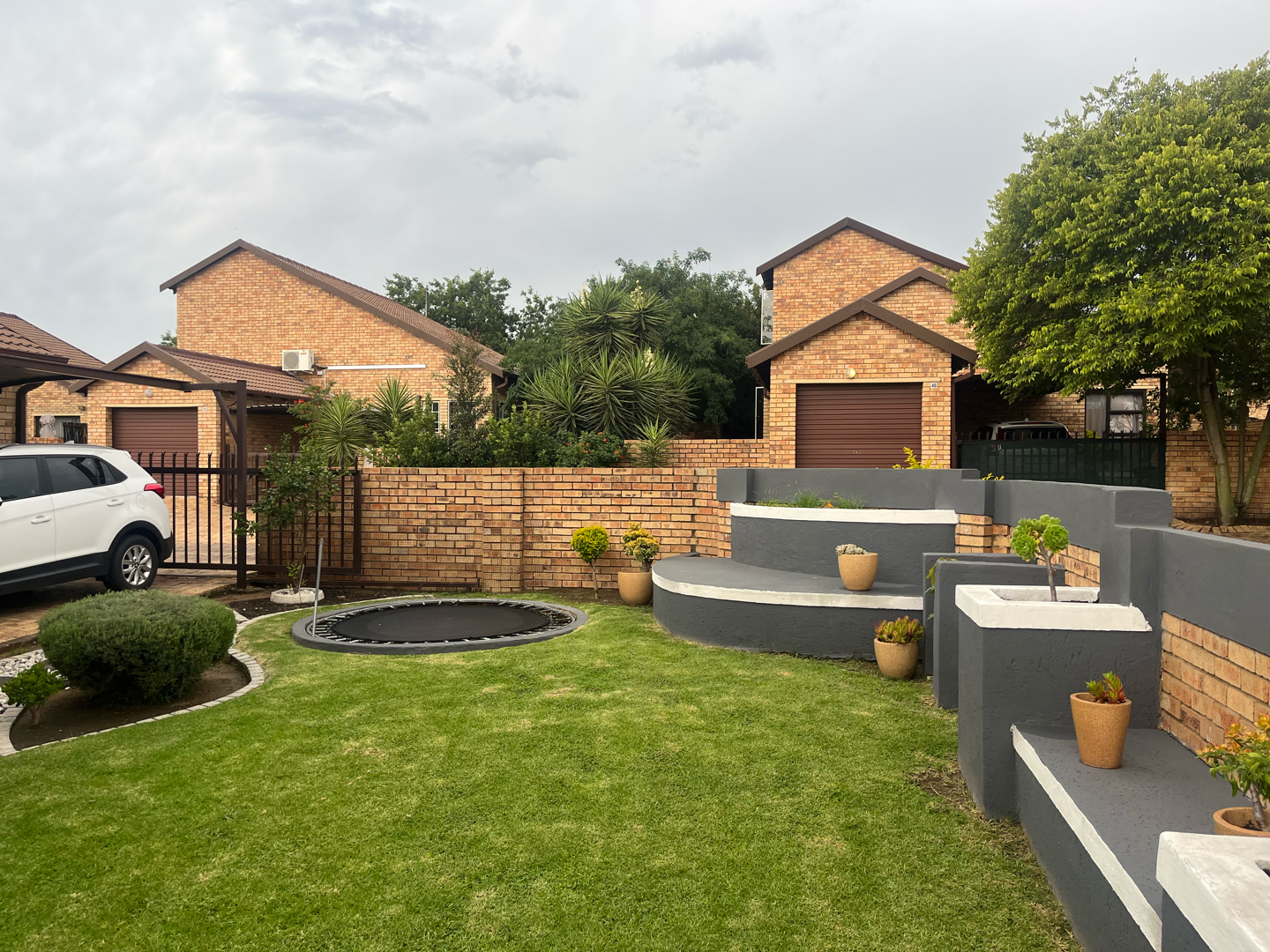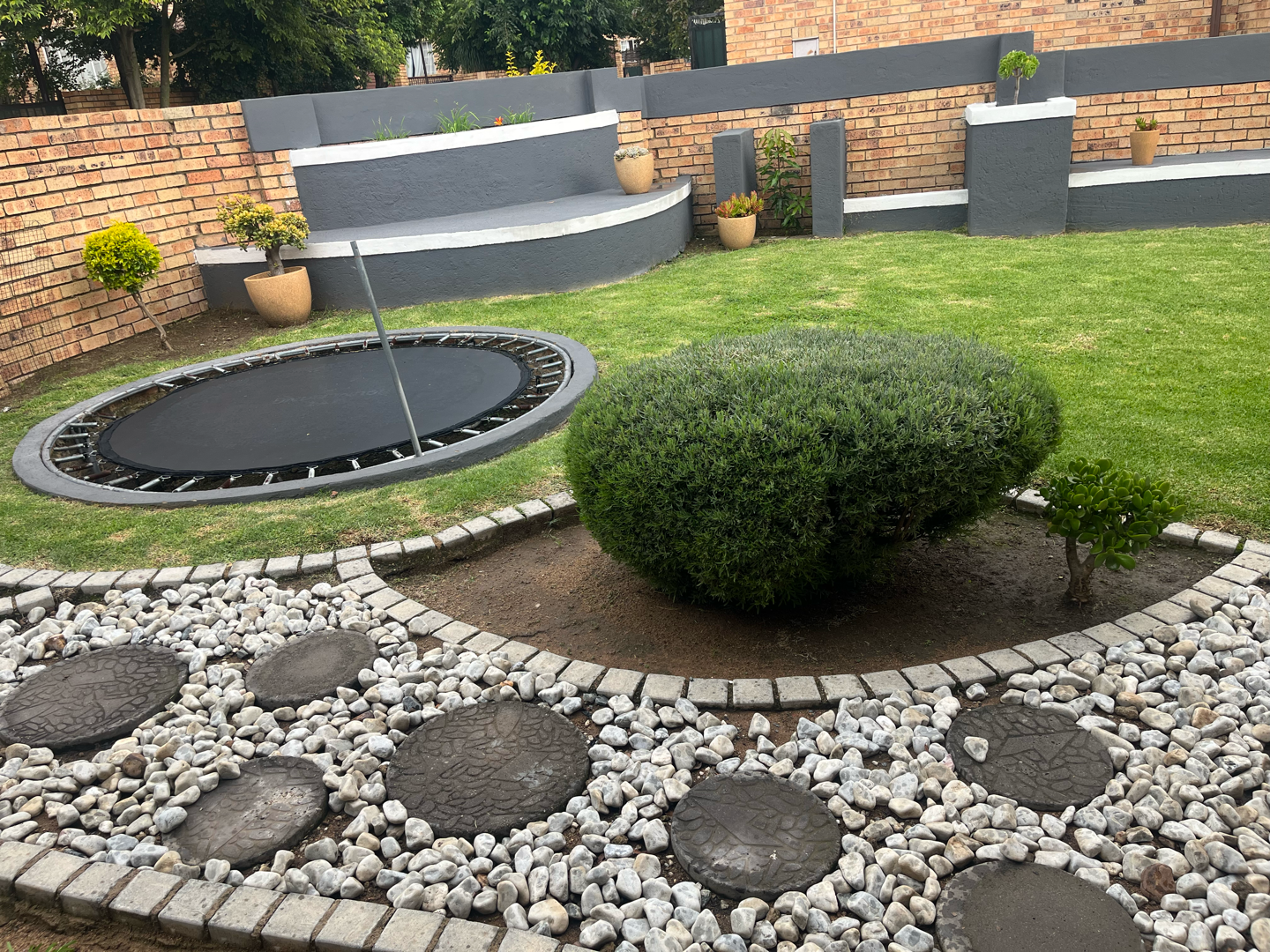 Outside, the property offers a meticulously maintained garden with manicured lawns, decorative pebble paths, and stepping stones. Raised garden beds and a mature fruit tree add charm, while an in-ground trampoline provides a dedicated play area. The home benefits from excellent security features, including 24-hour security, an access gate, intercom system, security post, burglar bars, and security trellis gates on all glass doors and windows, ensuring peace of mind. The property is totally walled and includes electric fencing. Pets are allowed, making this an ideal family home, complete with a single garage and additional parking.