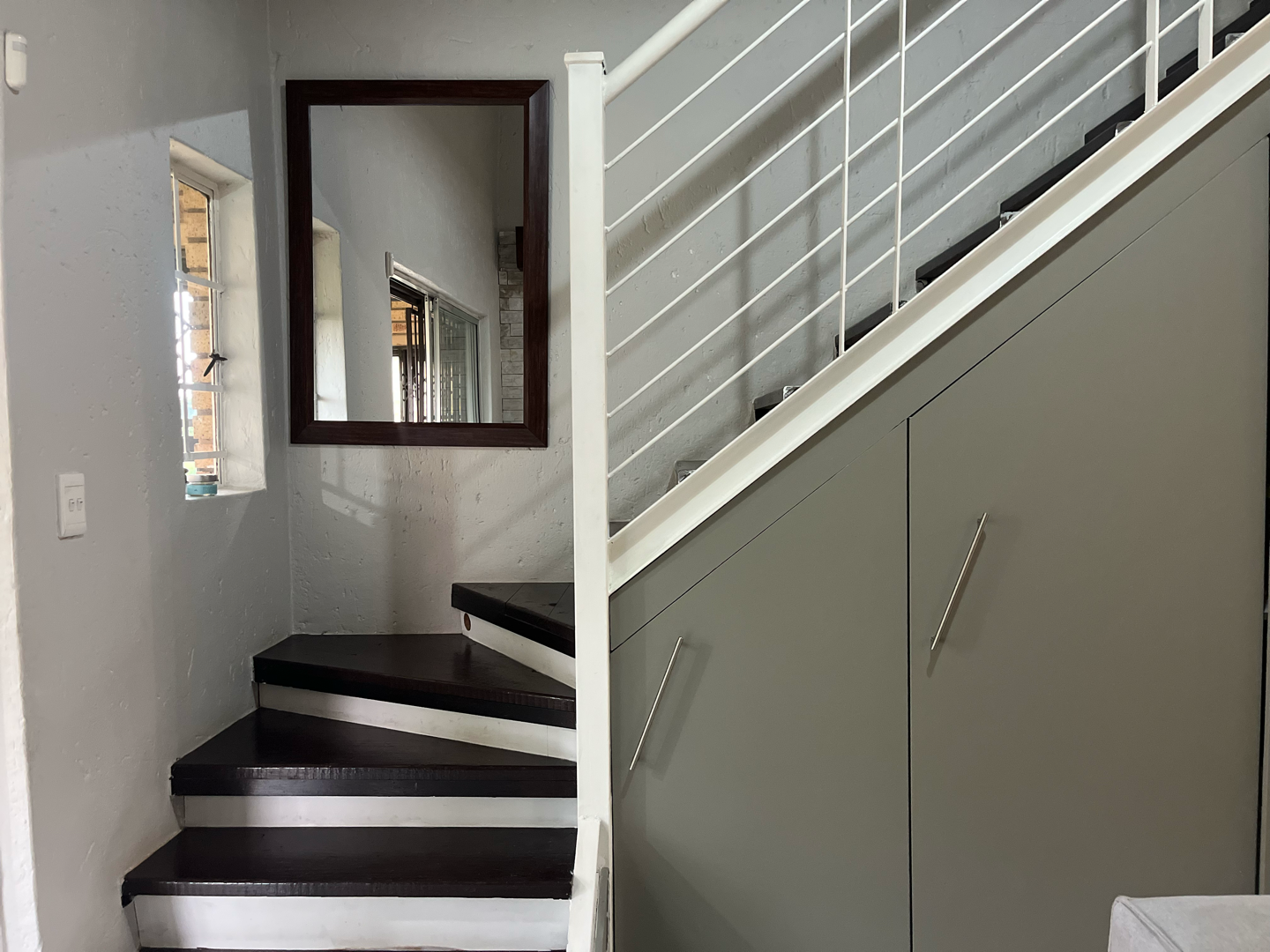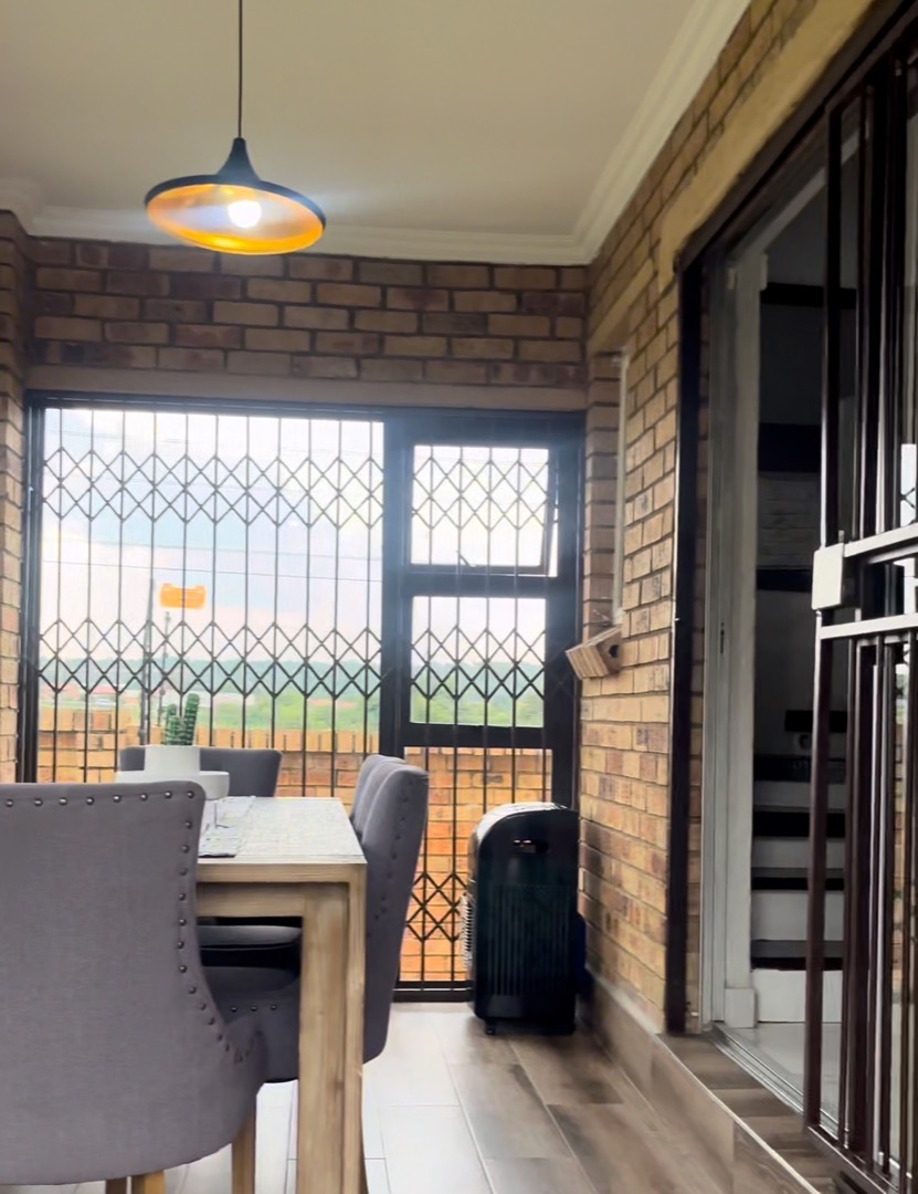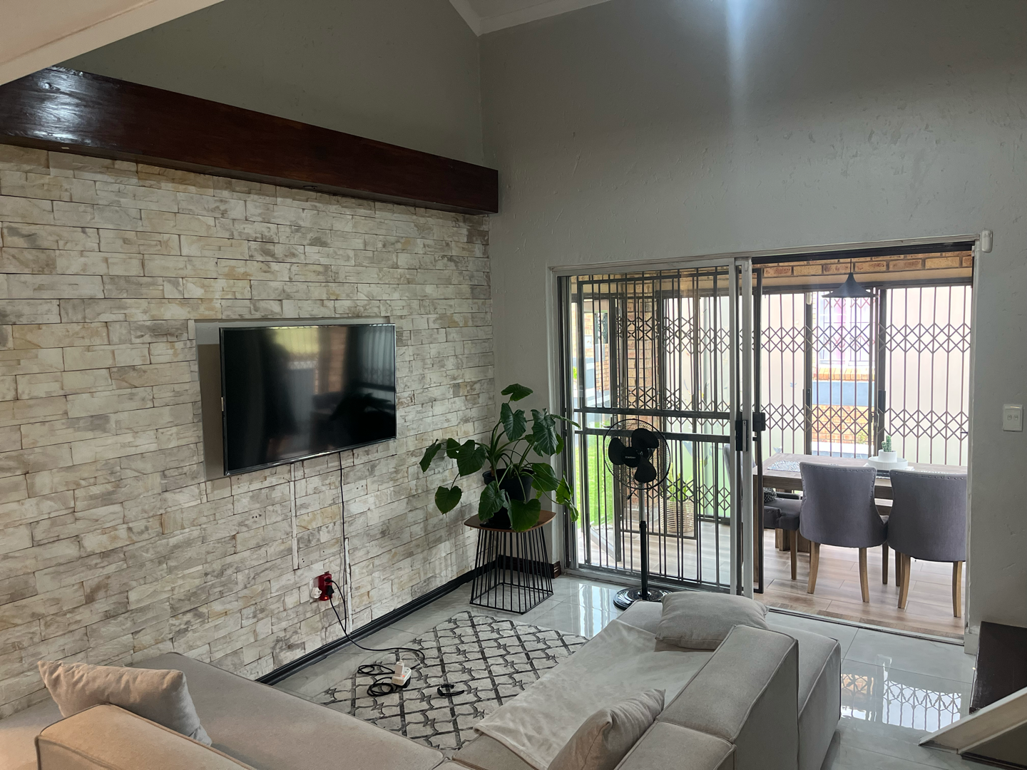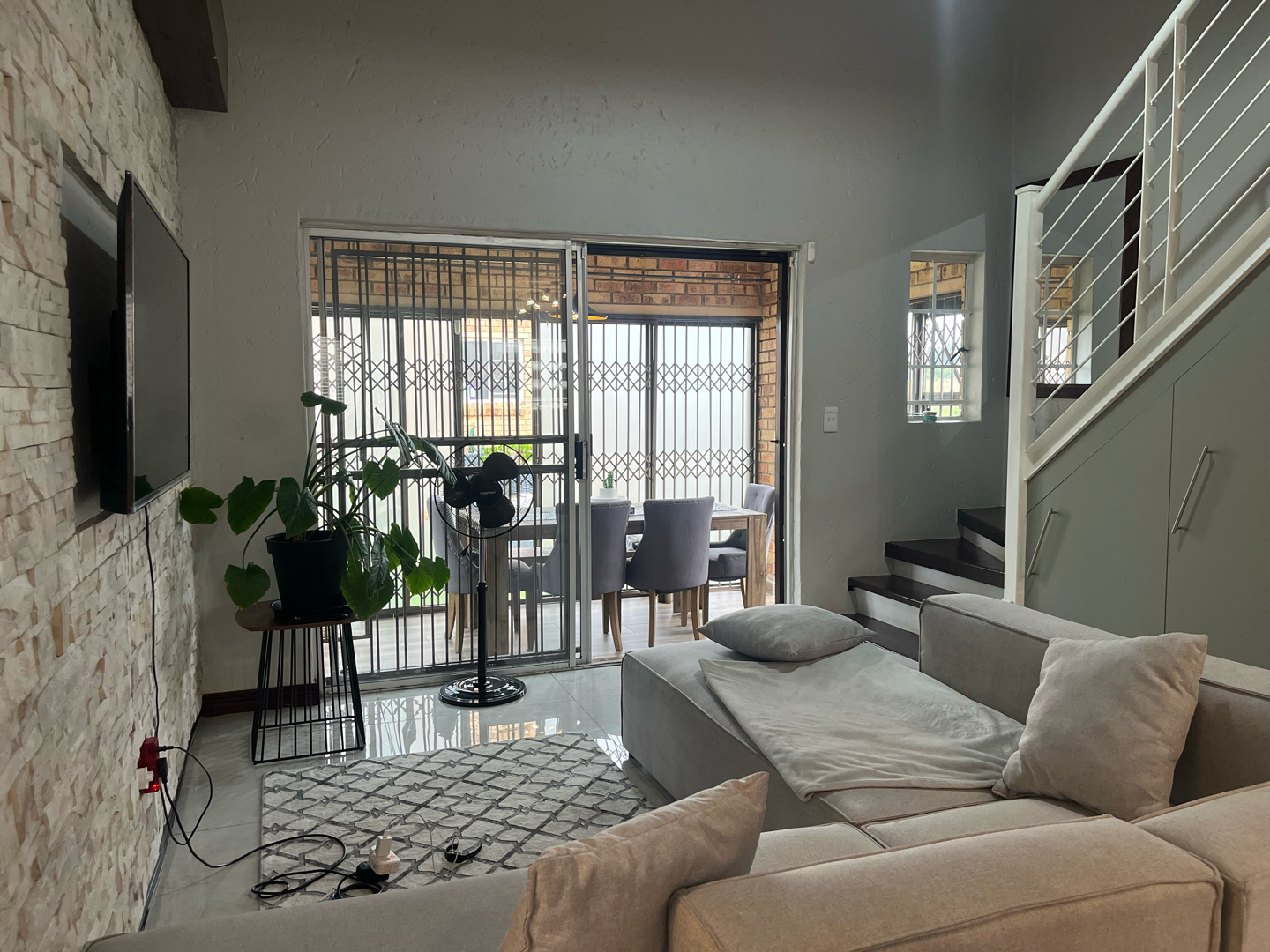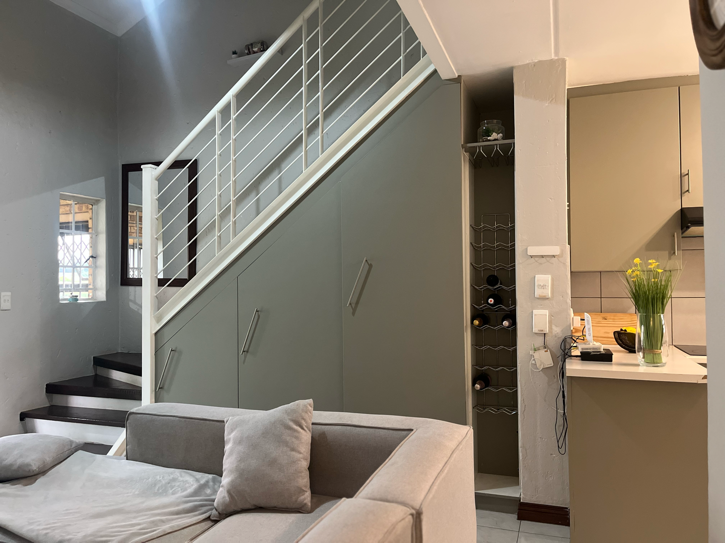 This modern 3-bedroom, 2-bathroom home offers comfortable living within a secure complex in Amberfield, Centurion. Spanning 95 square metres, the residence features an inviting open-plan layout. The lounge boasts a stylish stacked stone accent wall and high vaulted ceilings, creating an airy and contemporary ambiance. Large sliding doors enhance the indoor-outdoor flow, leading to a private patio. The modern kitchen is well-appointed with sleek grey cabinetry, white countertops, and stainless steel appliances, including a large refrigerator, dishwasher, microwave, and hob, complemented by an extractor fan. Integrated under-stair storage, complete with a dedicated wine rack, maximises space efficiently, while a modern staircase railing adds to the home's aesthetic appeal. Throughout the home, durable tiled flooring ensures easy maintenance and a cohesive look.
