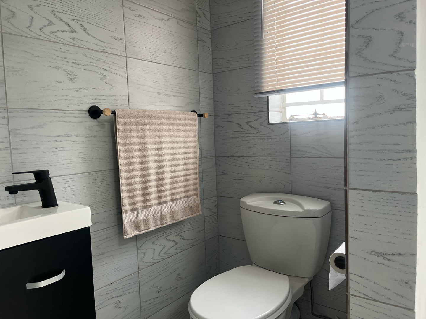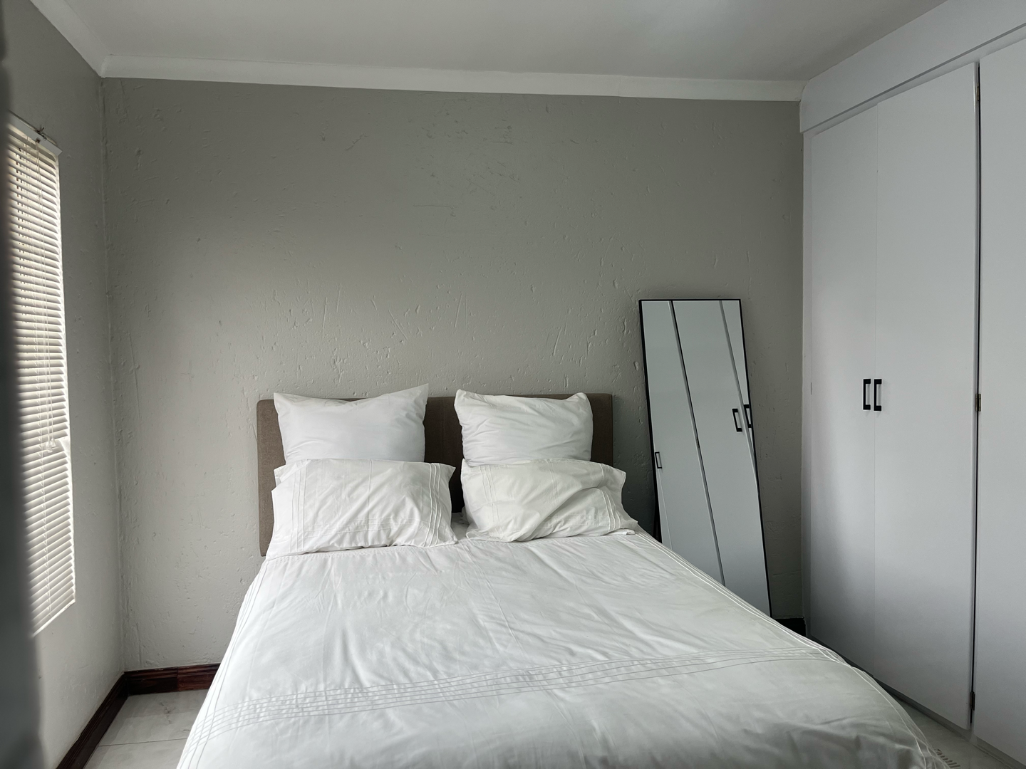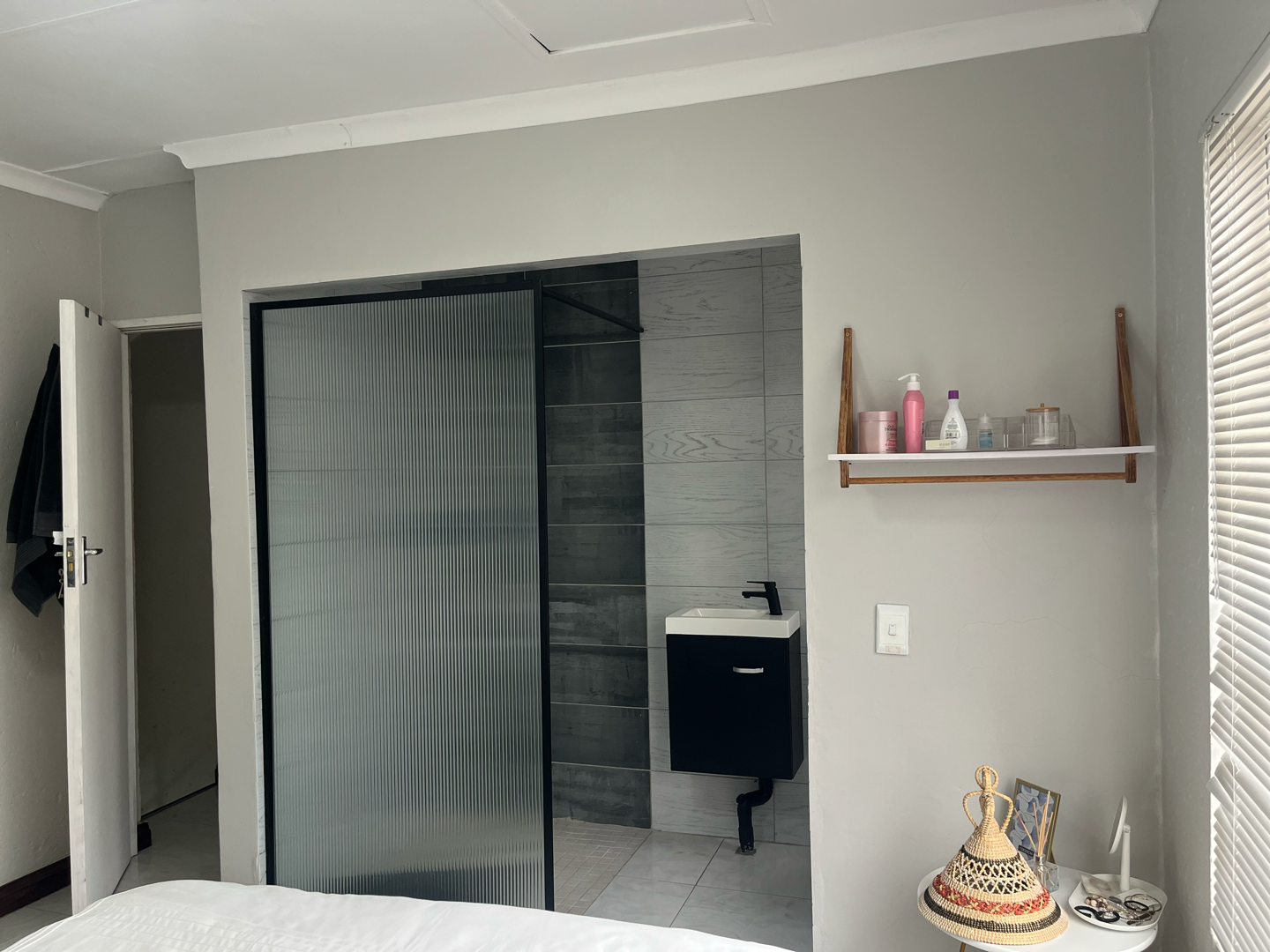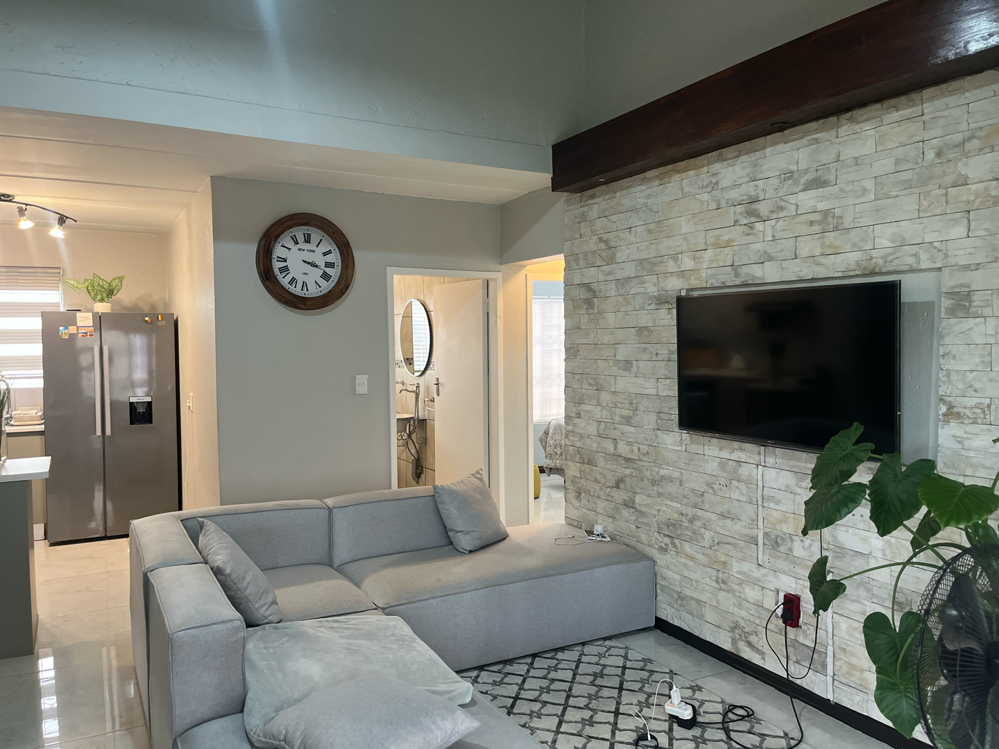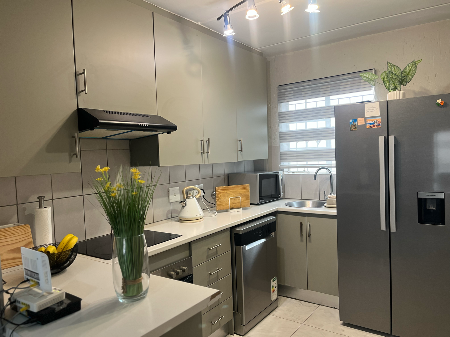 This modern 3-bedroom, 2-bathroom home offers comfortable living within a secure complex in Amberfield, Centurion. Spanning 95 square metres, the residence features an inviting open-plan layout. The lounge boasts a stylish stacked stone accent wall and high vaulted ceilings, creating an airy and contemporary ambiance. Large sliding doors enhance the indoor-outdoor flow, leading to a private patio. The modern kitchen is well-appointed with sleek grey cabinetry, white countertops, and stainless steel appliances, including a large refrigerator, dishwasher, microwave, and hob, complemented by an extractor fan. Integrated under-stair storage, complete with a dedicated wine rack, maximises space efficiently, while a modern staircase railing adds to the home's aesthetic appeal. Throughout the home, durable tiled flooring ensures easy maintenance and a cohesive look.