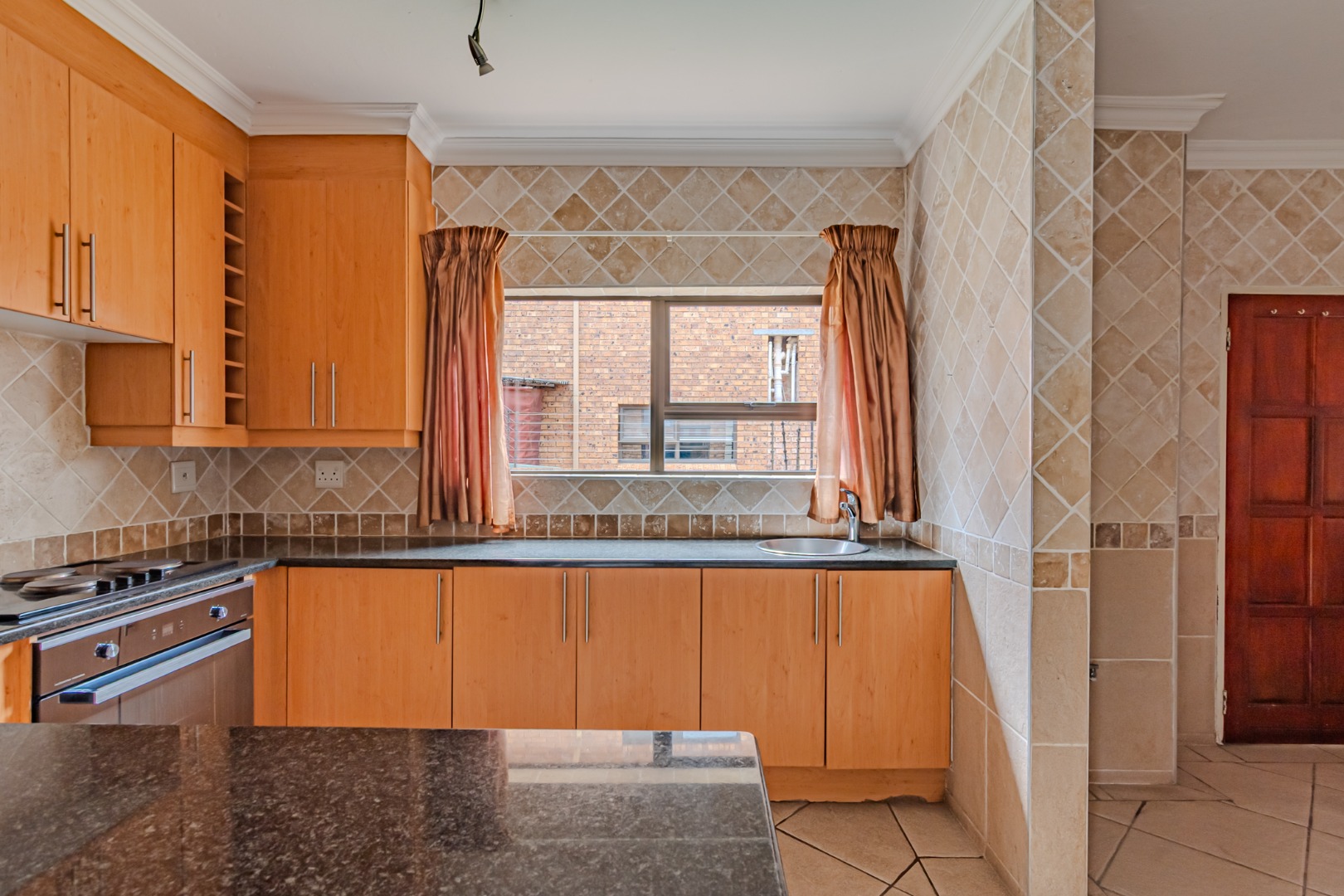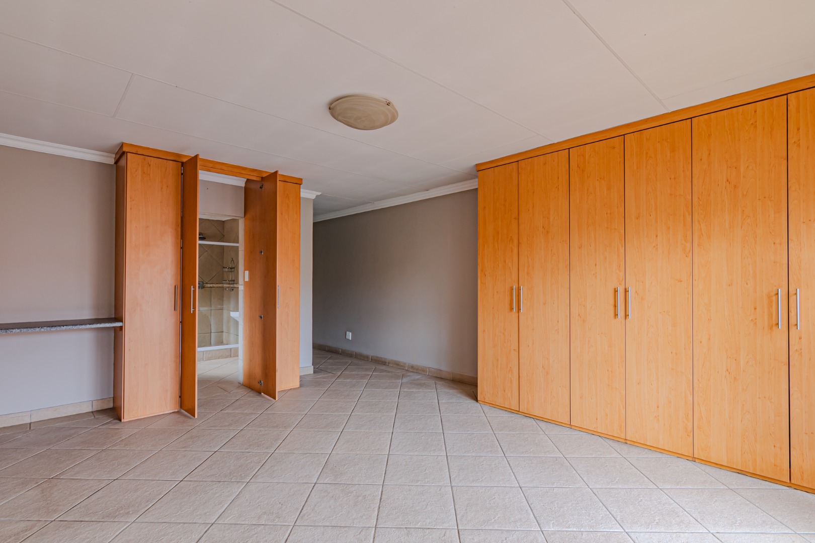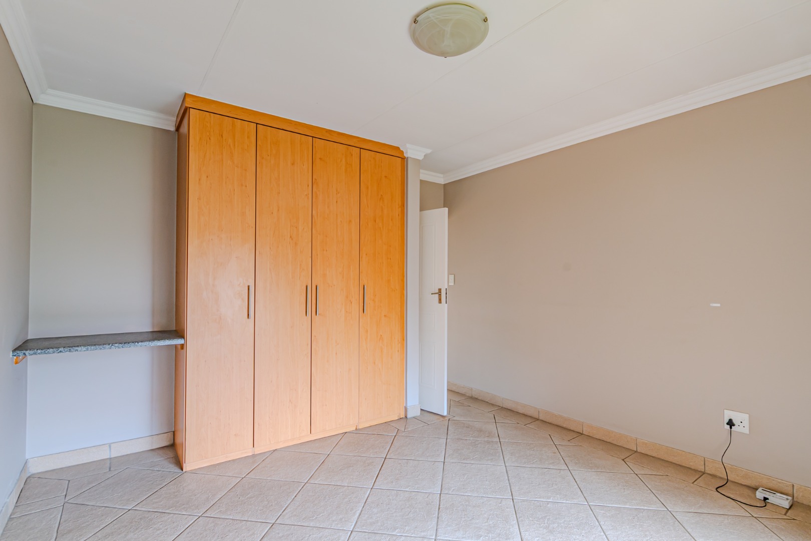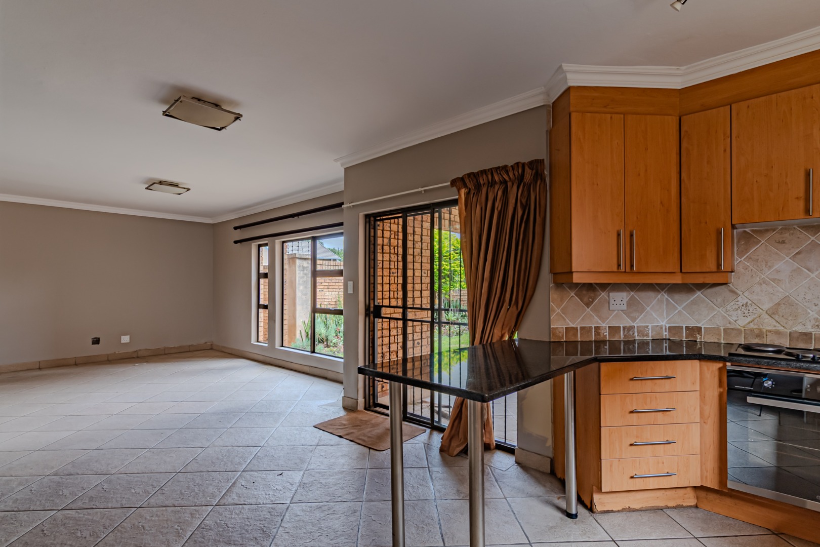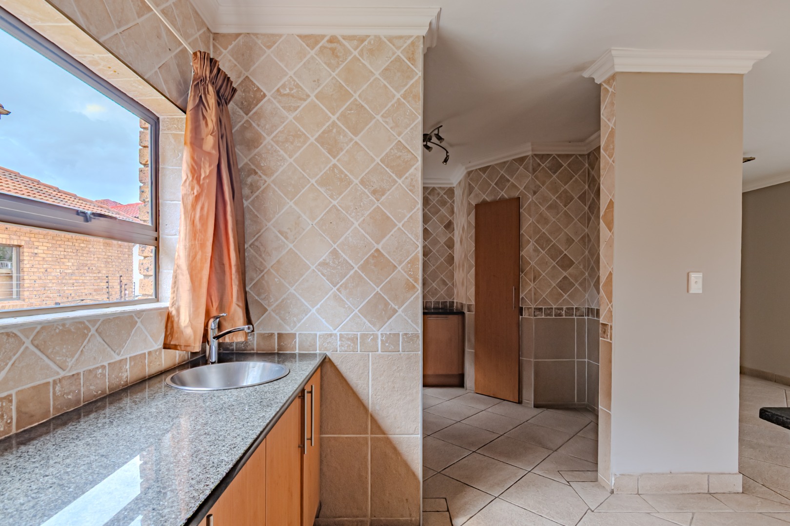 The kitchen has a sleek stylish look where modern design meets practicality. The granite tops offer both beauty and durability providing ample space for meal preparation. The cupboards provide plenty of storage space, creating a clutter-free environment. The spacious pantry adds to the kitchen’s functionality, offering extra storage space.