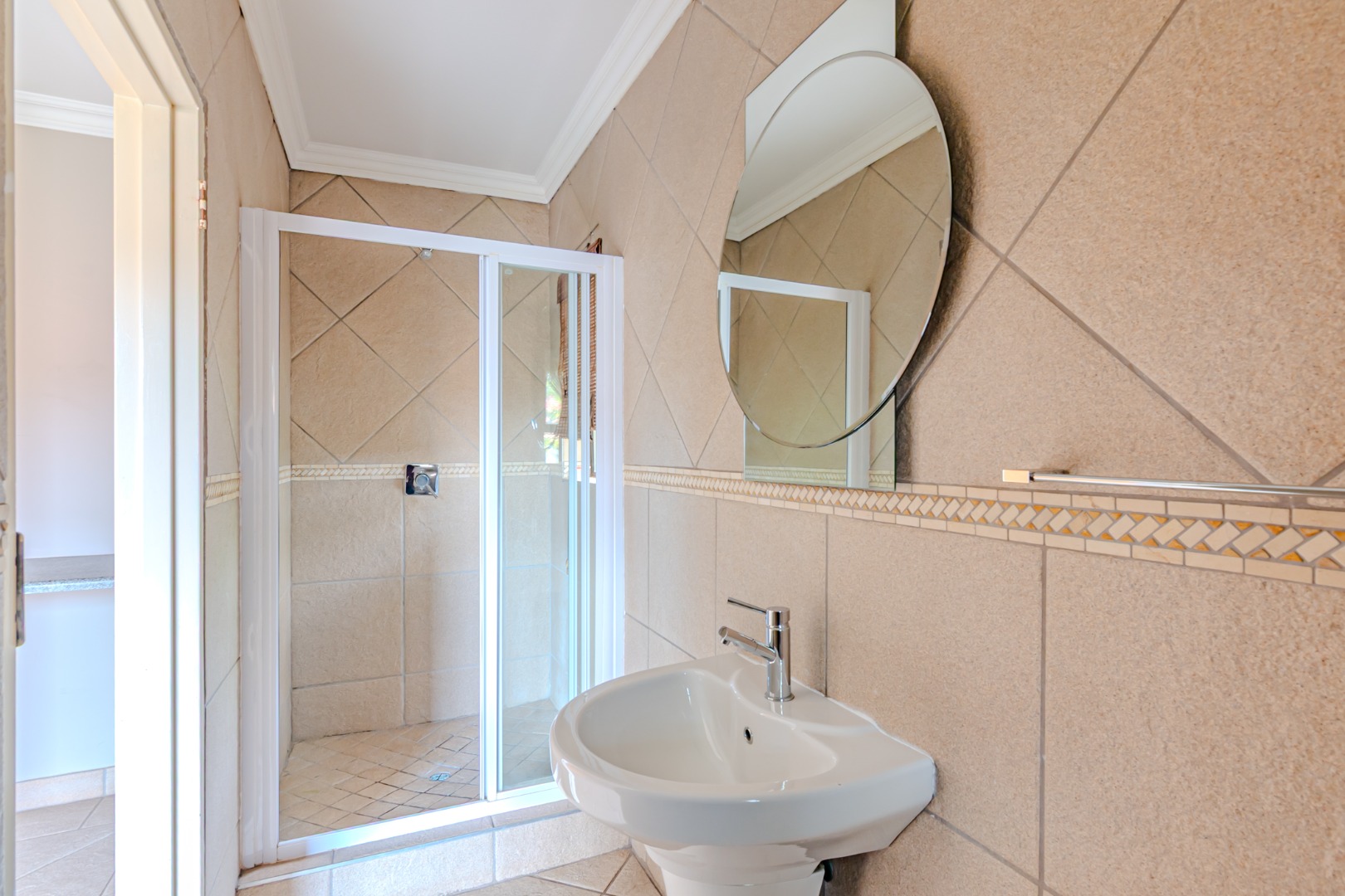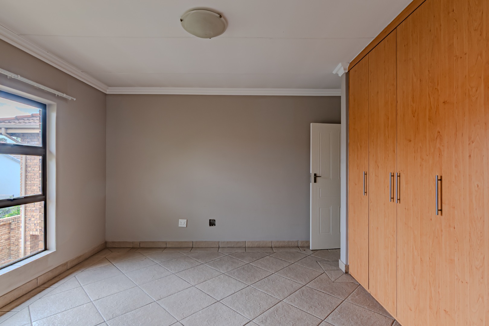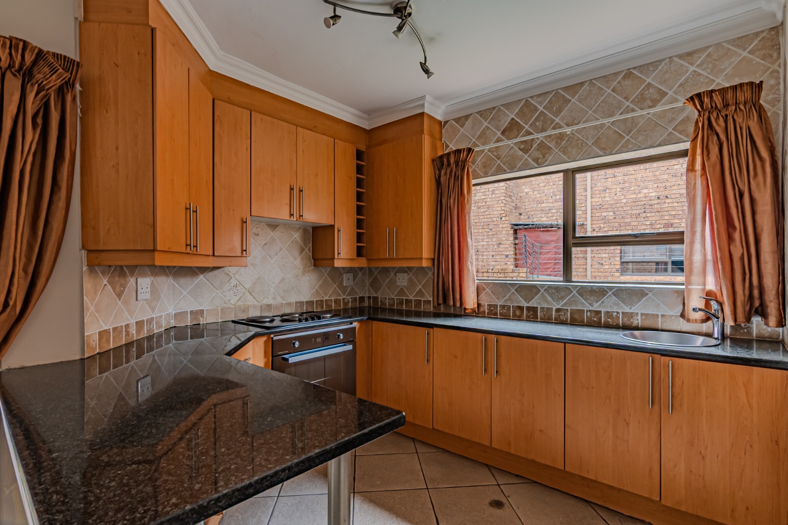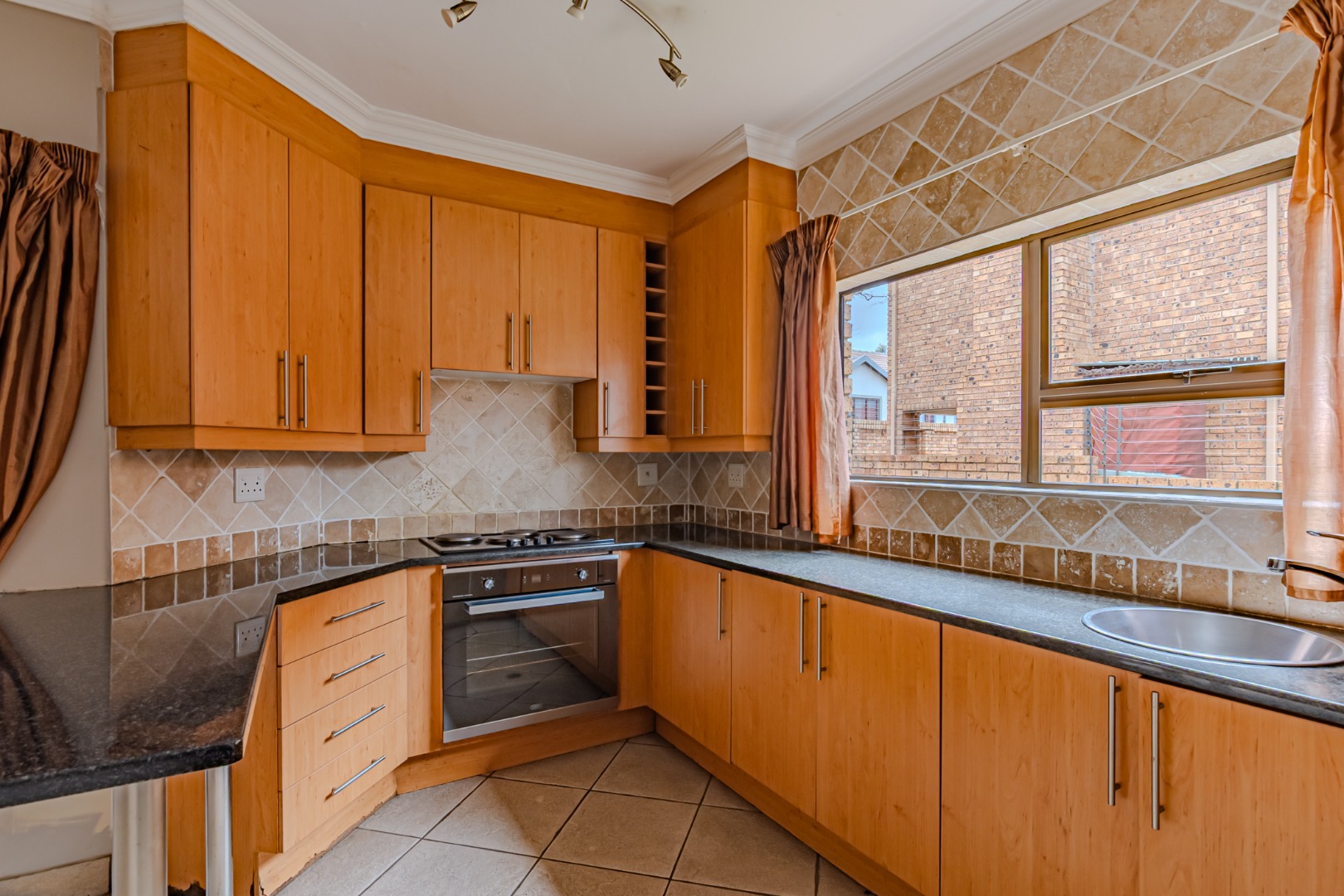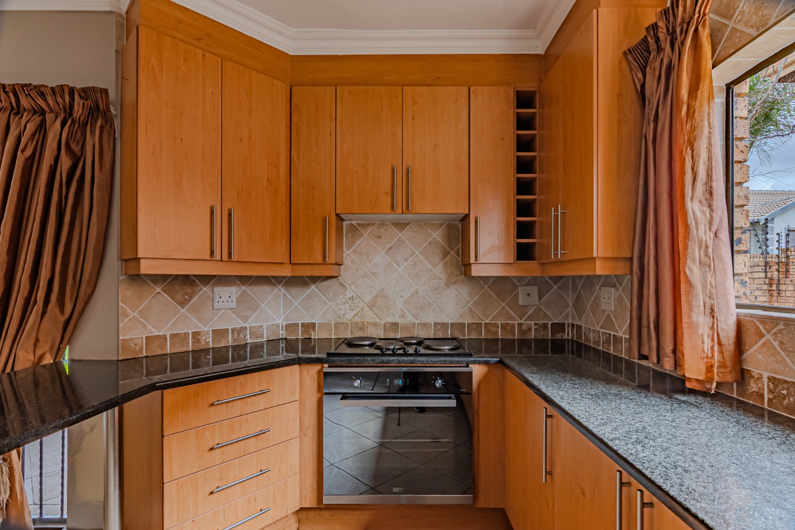 The kitchen has a sleek stylish look where modern design meets practicality. The granite tops offer both beauty and durability providing ample space for meal preparation. The cupboards provide plenty of storage space, creating a clutter-free environment. The spacious pantry adds to the kitchen’s functionality, offering extra storage space.