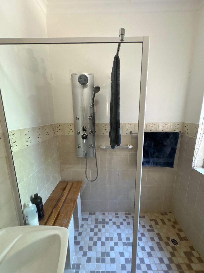Both bedrooms offer comfortable spaces, and the single bathroom is a standout. It boasts a modern multi-function shower panel with a rainfall head, handheld sprayer, and body jets, plus a convenient built-in wooden bench and a sleek glass enclosure. It’s the perfect spot to relax and refresh.