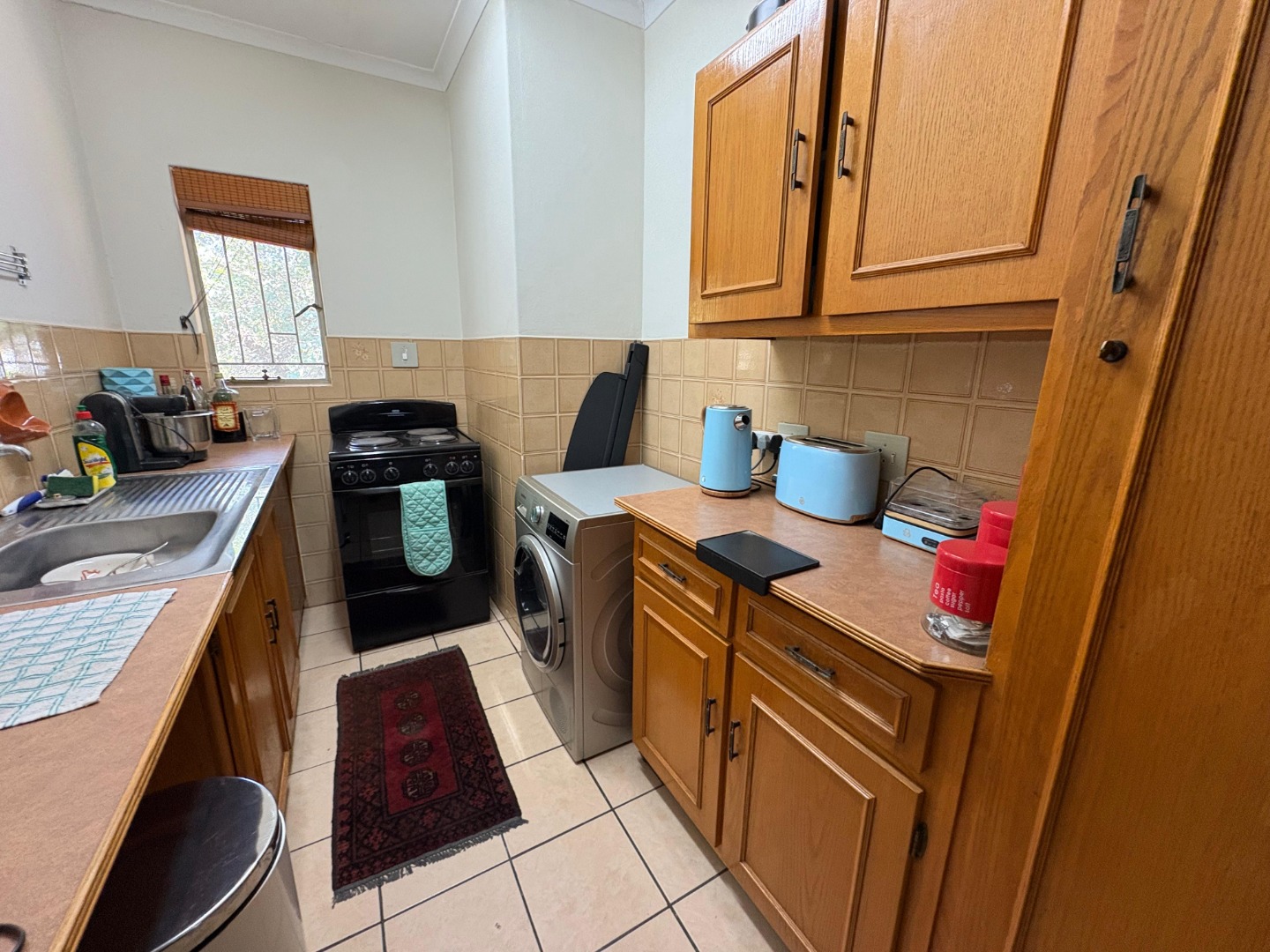 The compact yet functional kitchen is a real space-saver, featuring light wood cabinetry, tiled floors, and a tiled backsplash. It comes equipped with a stove and even has a washing machine integrated, making laundry day a breeze. There's ample cabinet storage for all your essentials, keeping everything neat and tidy.