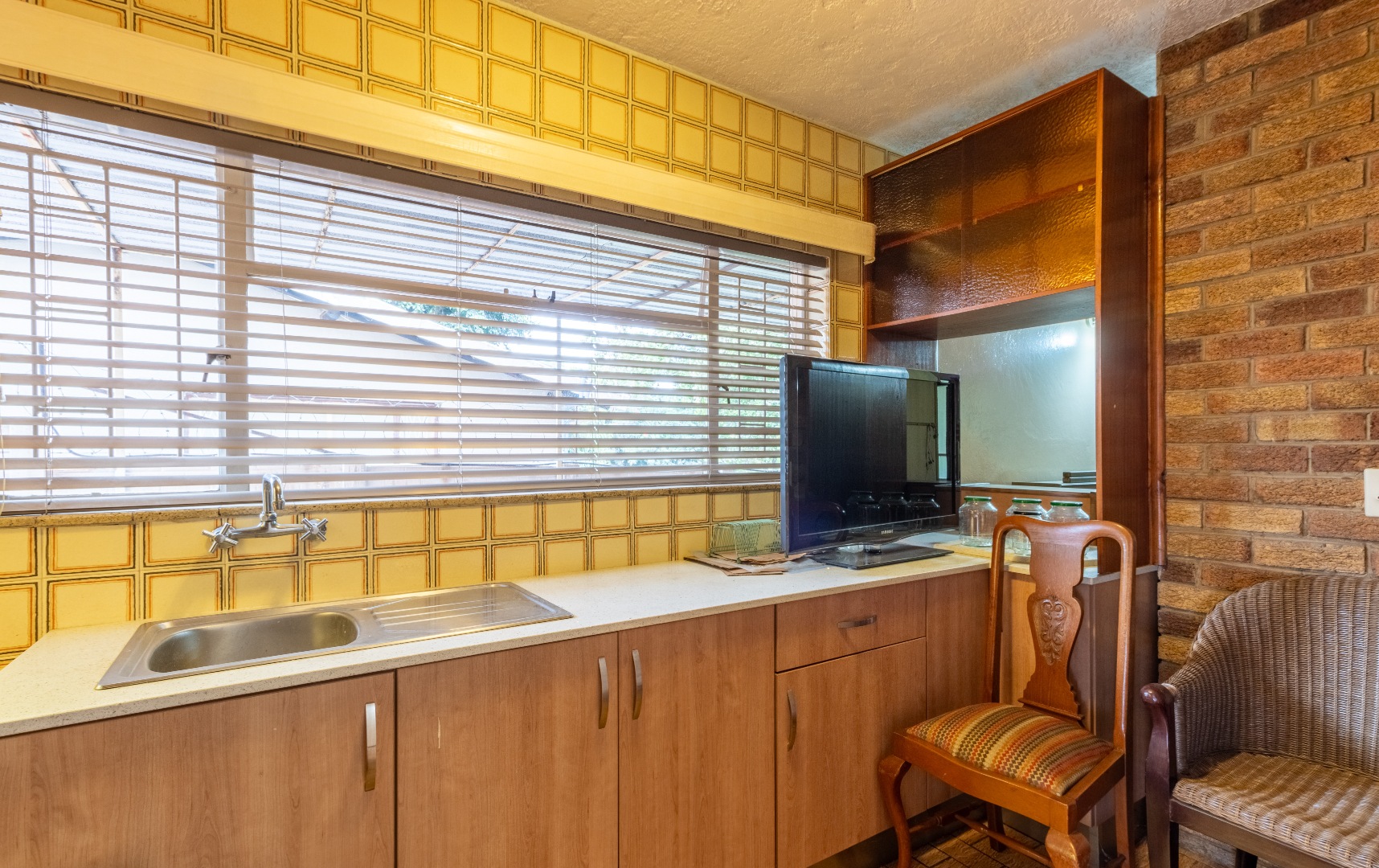 - Modern kitchen with gas stove and oven, double basin, blinds, tiled finishes, and a separate scullery
