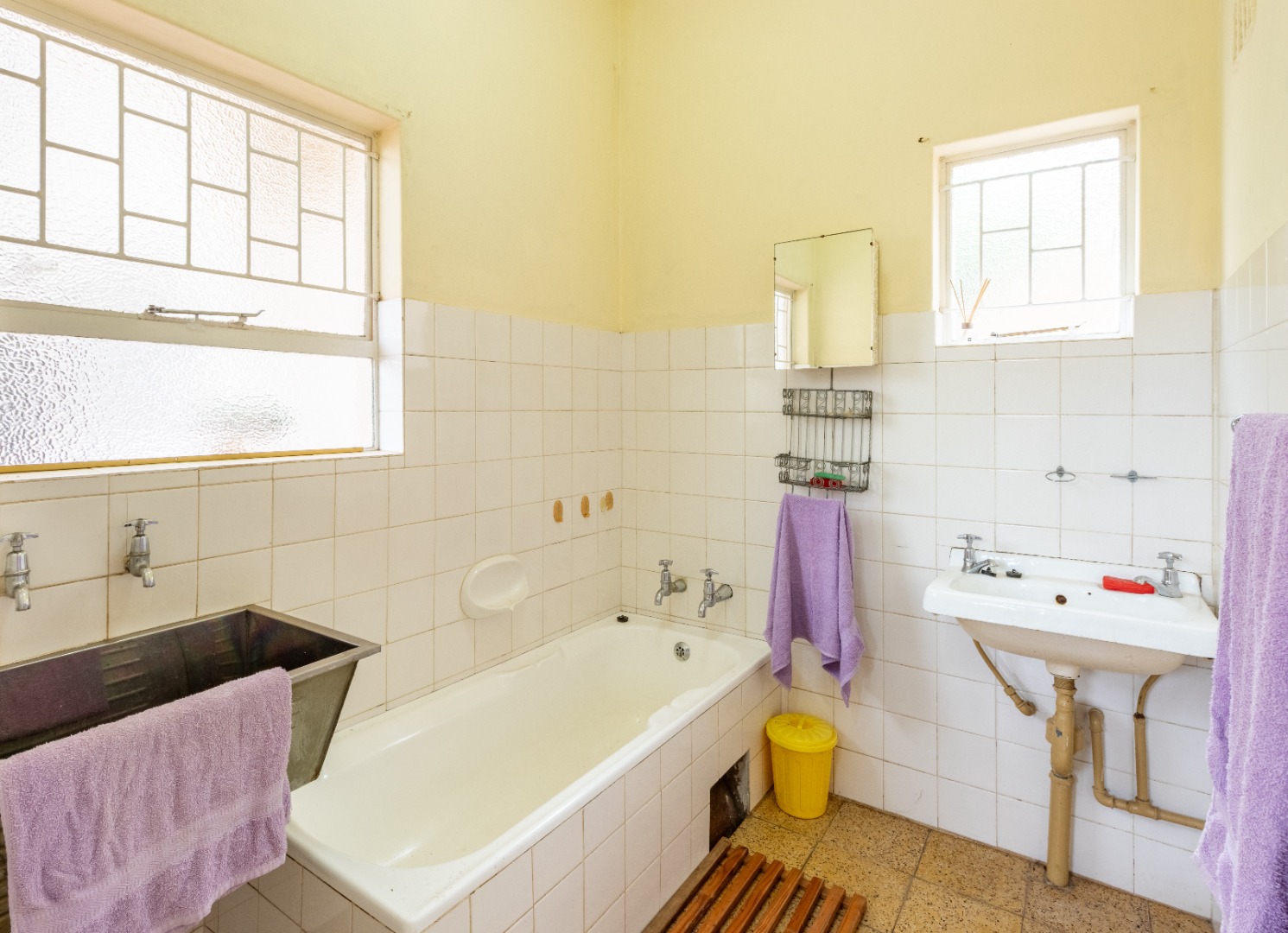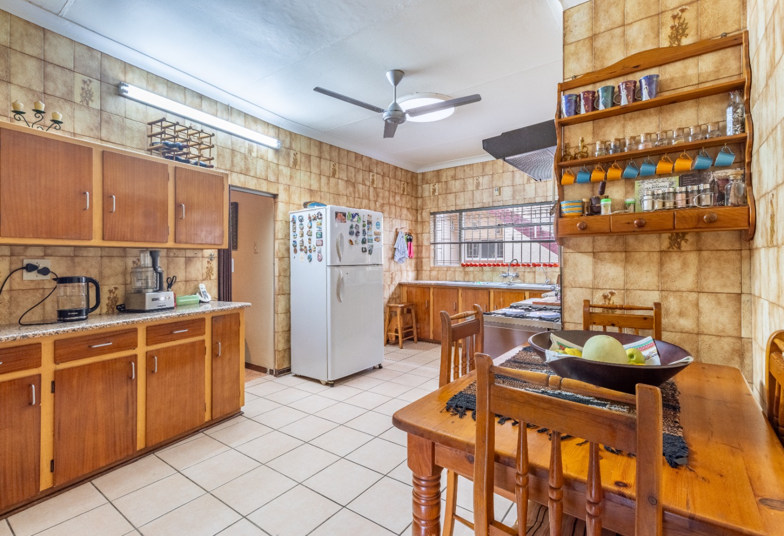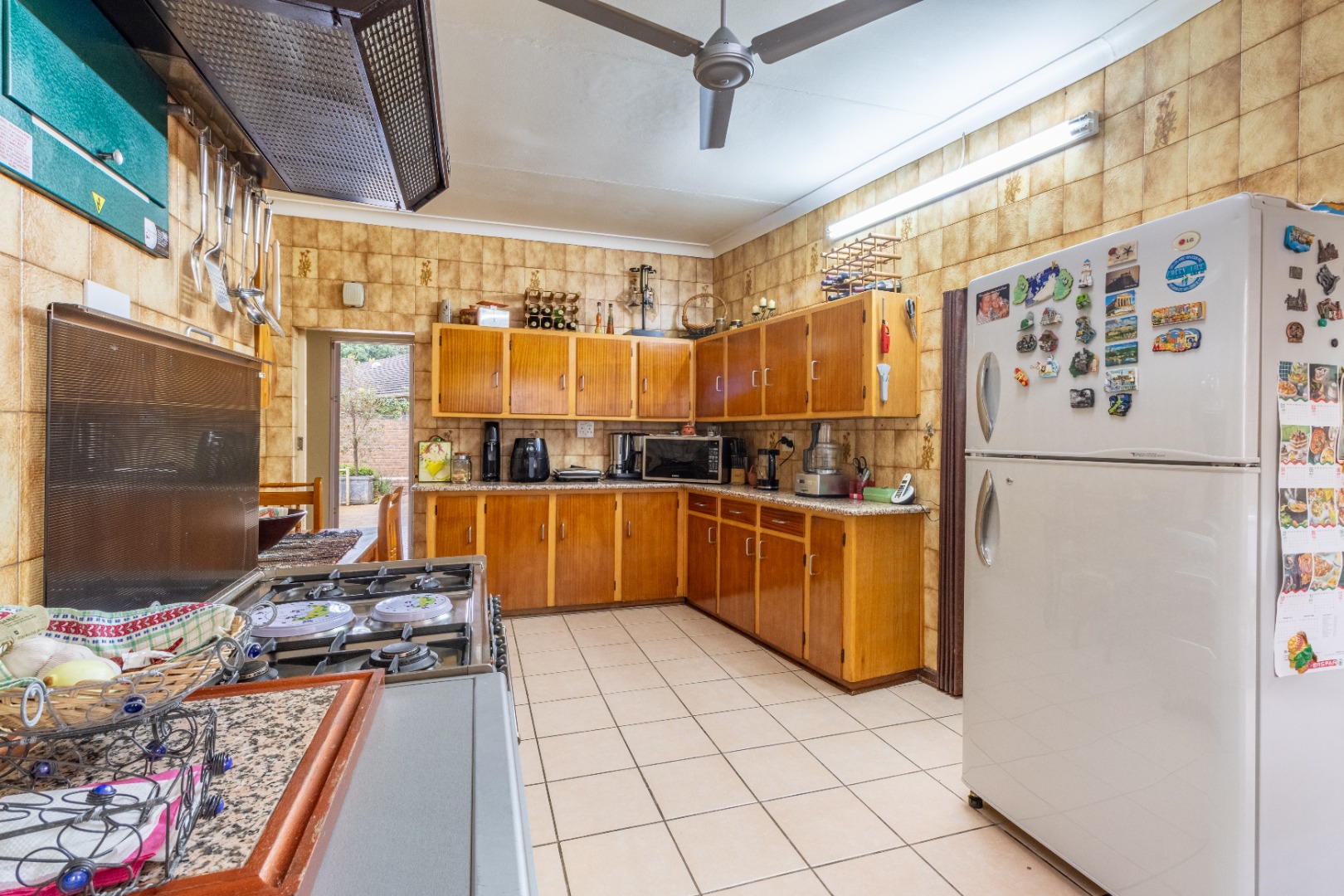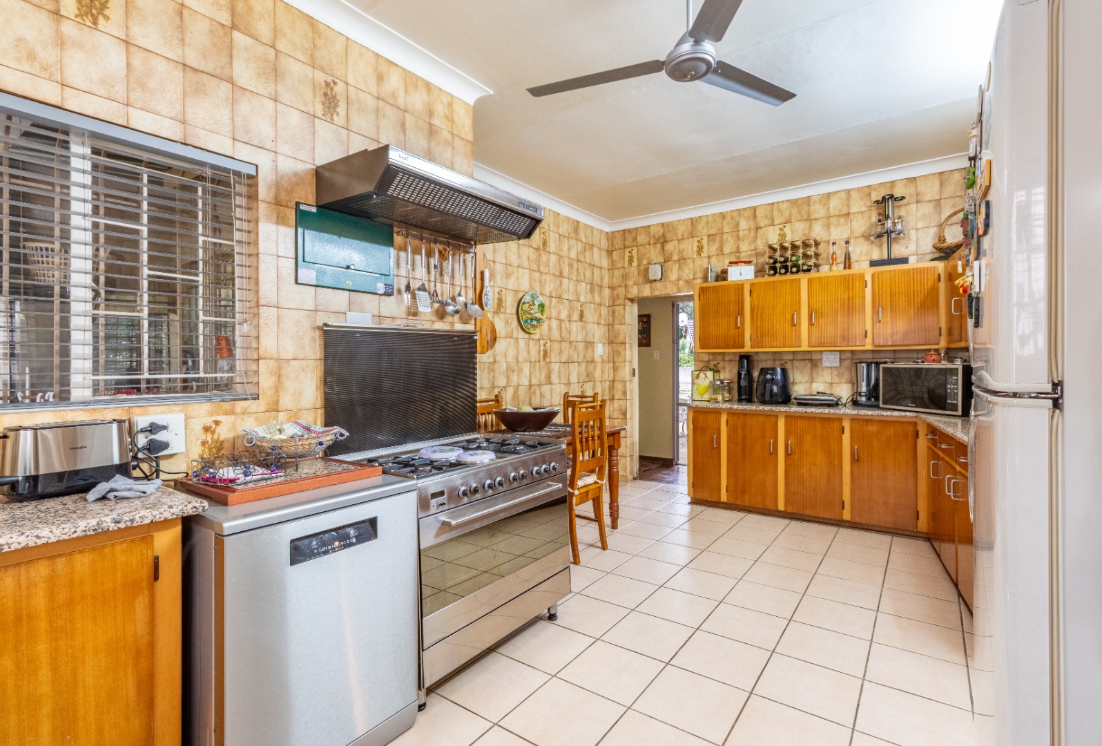 - Modern kitchen with gas stove and oven, double basin, blinds, tiled finishes, and a separate scullery