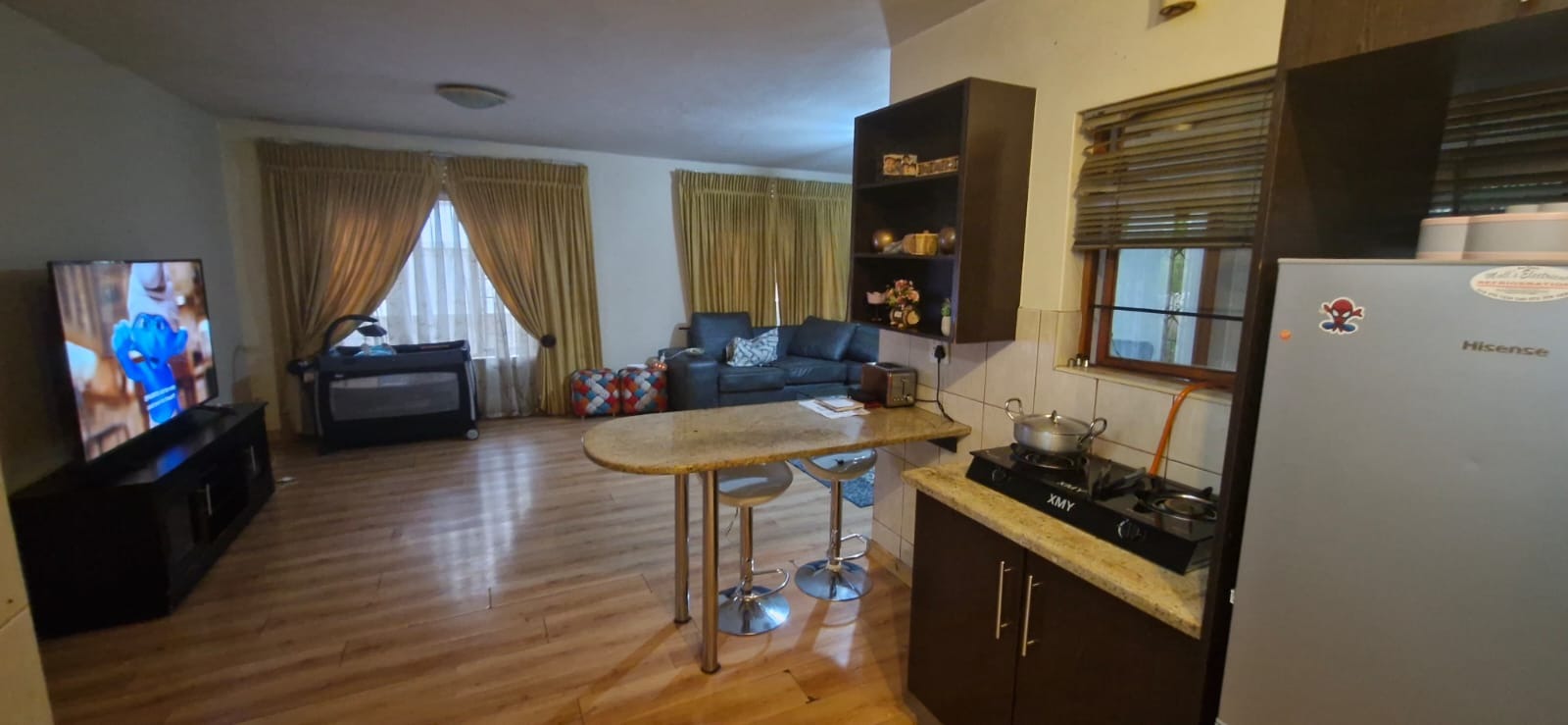 Step into a spacious open-plan lounge and dining area that flows seamlessly into an enclosed patio with a built-in braai – perfect for entertaining all year round.