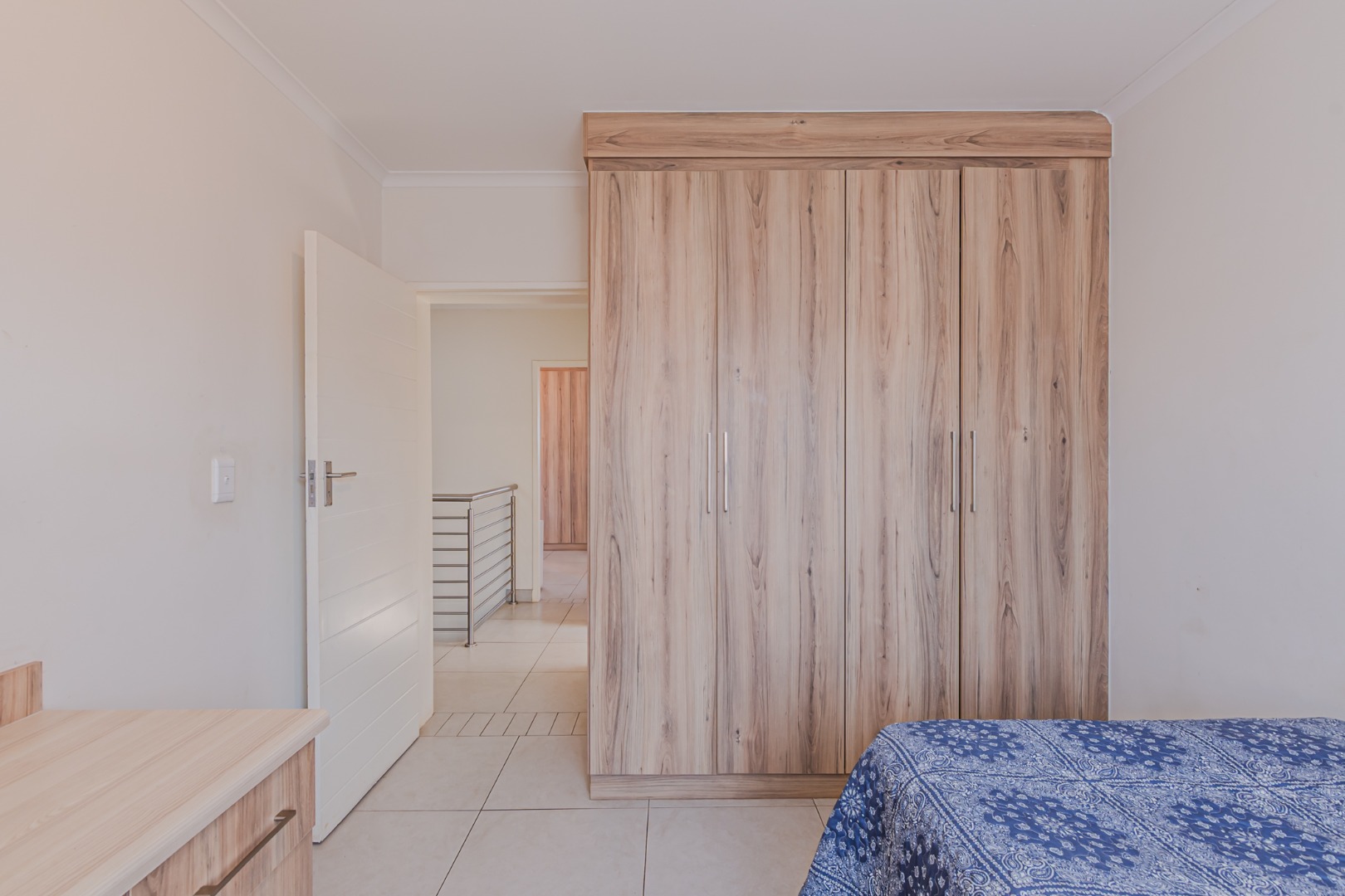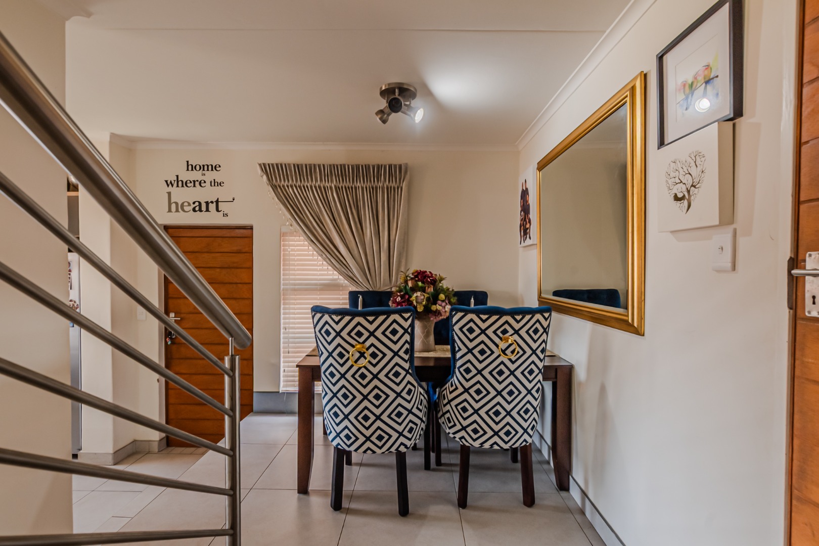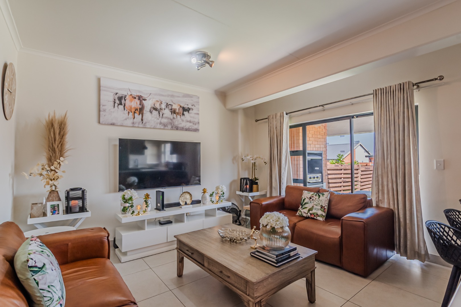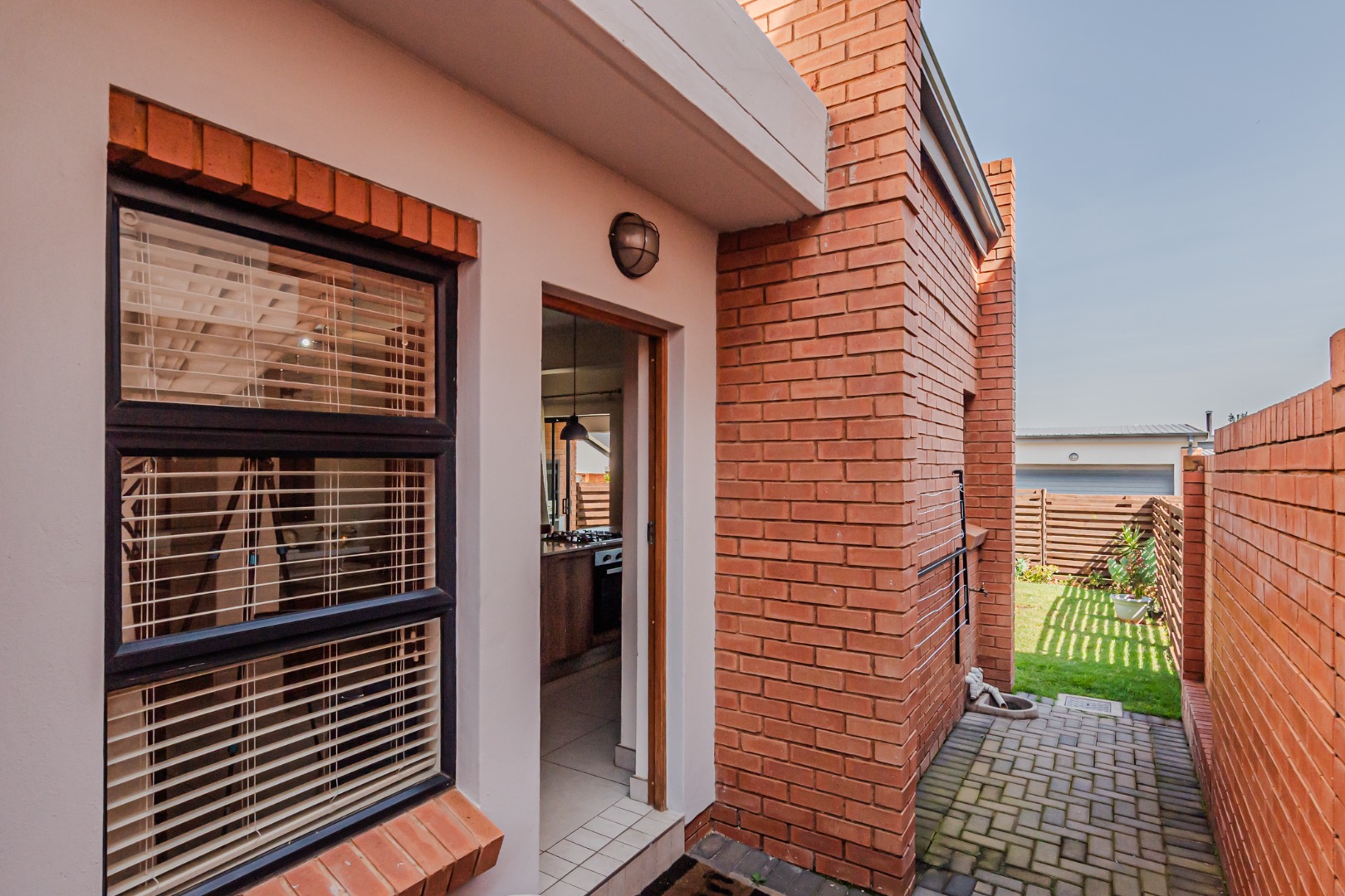 Outdoor amenities include a well-maintained garden and paving, providing a pleasant environment for pets, which are allowed. A double garage offers secure parking and additional storage. Residents benefit from the peace of mind provided by 24-hour security within the gated community, ensuring a safe and tranquil lifestyle. The home is also equipped with a gas geyser and fibre connectivity, catering to modern demands for efficiency and high-speed internet.