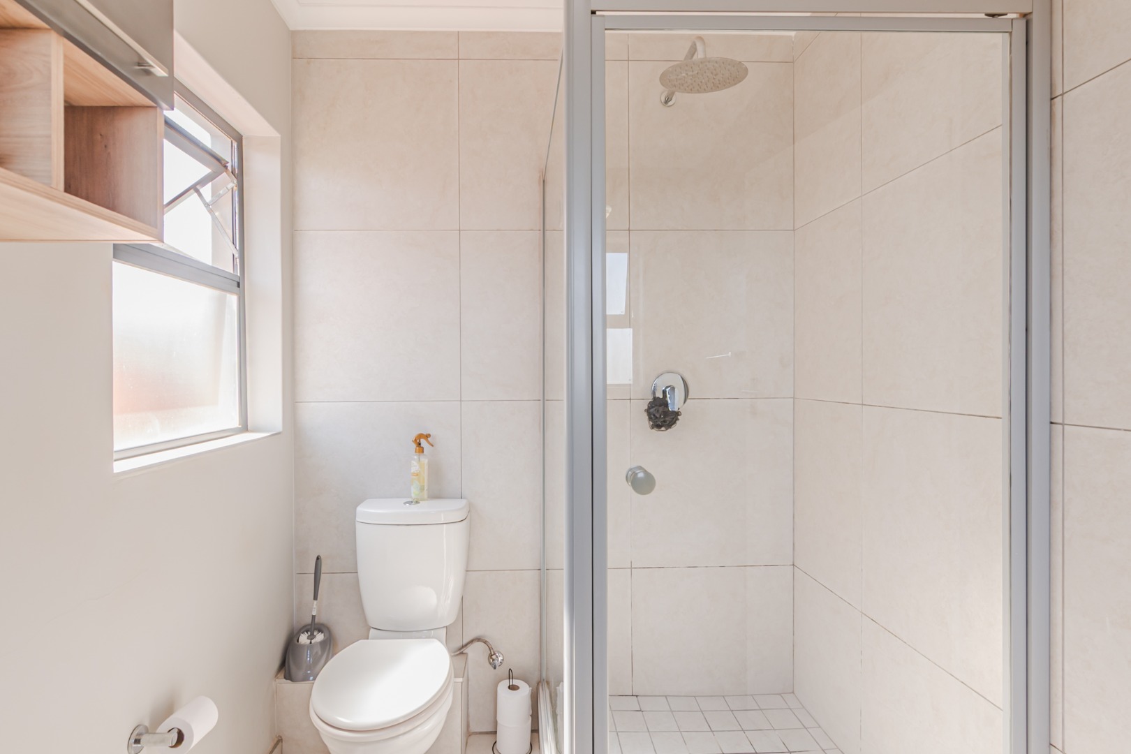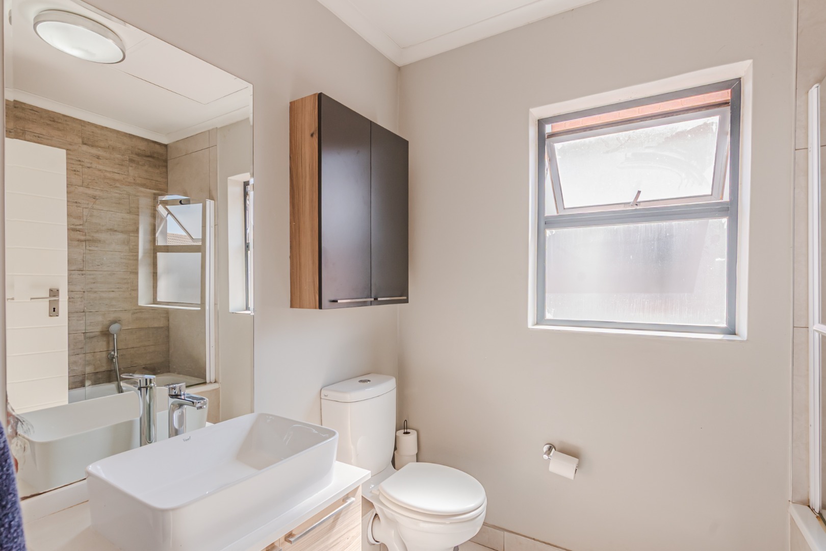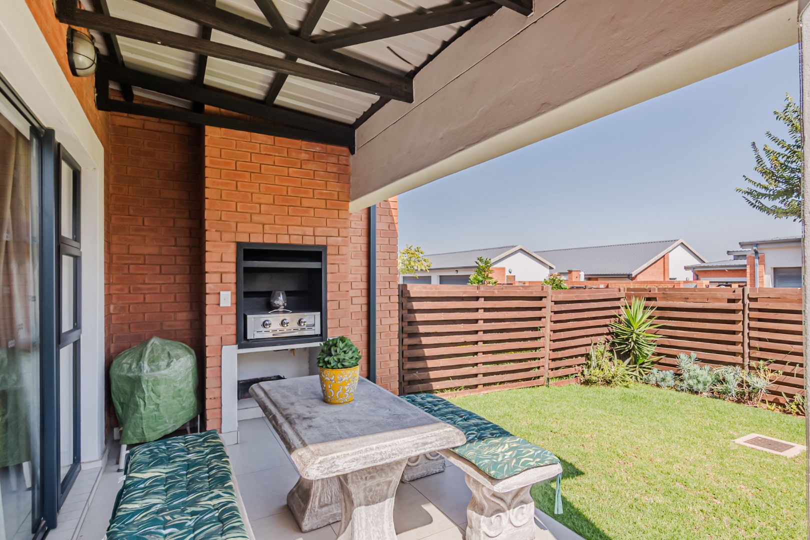 The property boasts three well-proportioned bedrooms, including an en-suite bathroom for added privacy and convenience. A separate guest toilet serves the remaining areas, all finished with modern fixtures and tiled flooring for easy maintenance. The seamless flow between indoor and outdoor spaces is enhanced by sliding doors leading to a private patio, complete with a built-in gas braai, ideal for dining and relaxation.