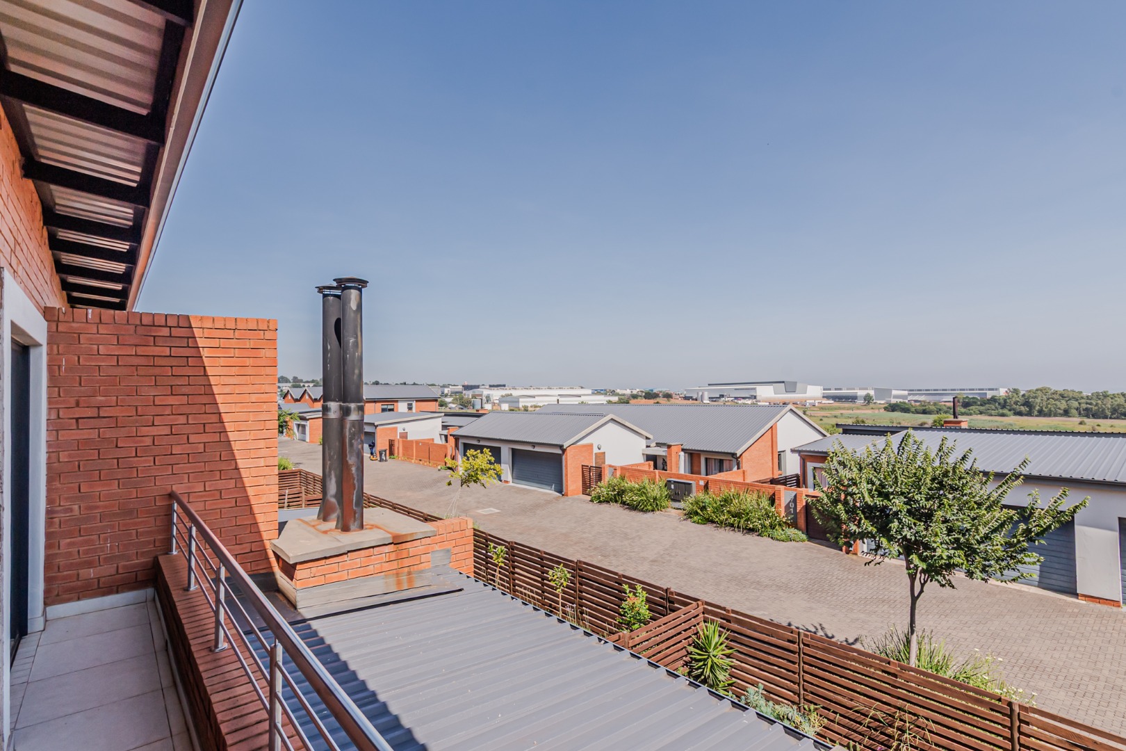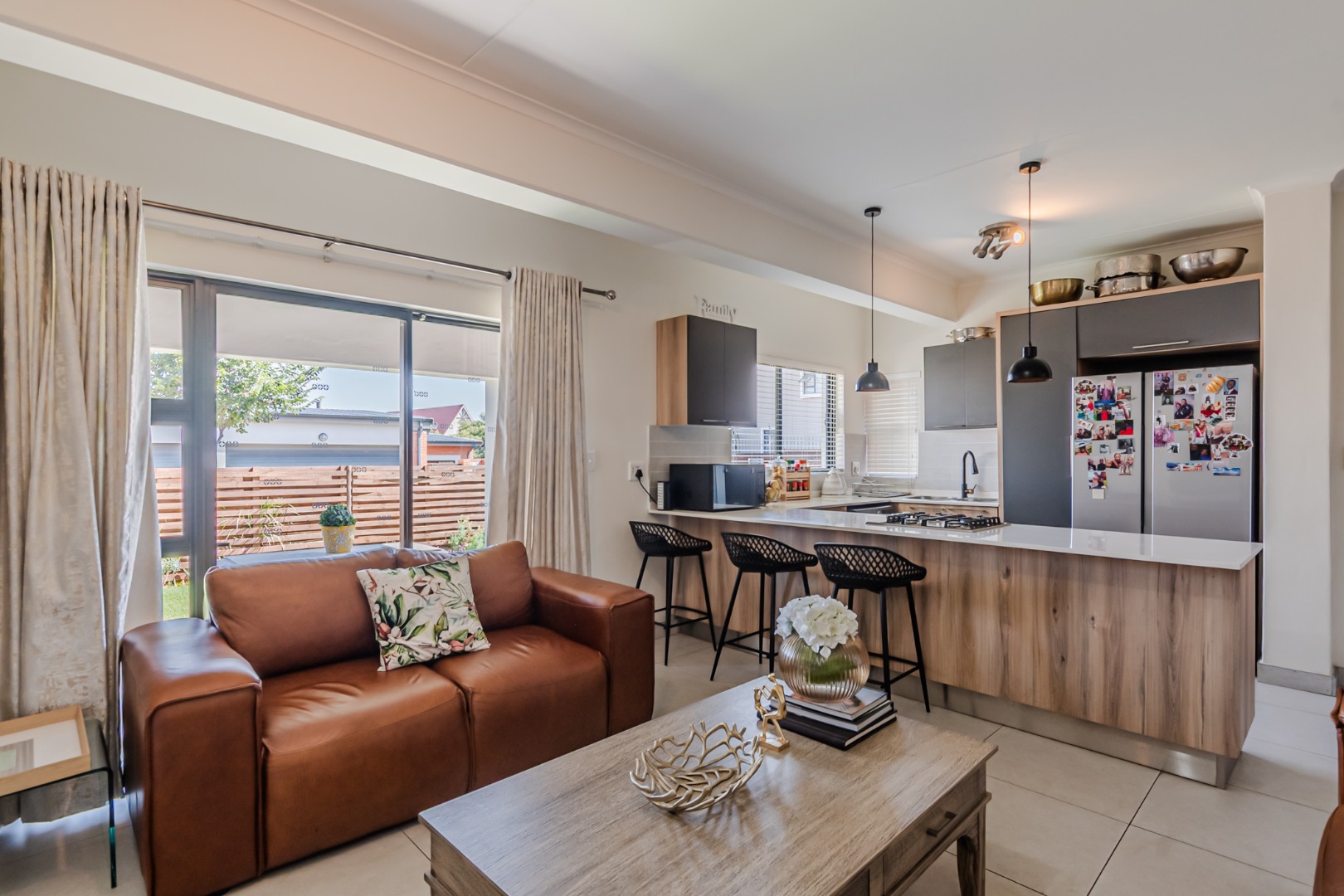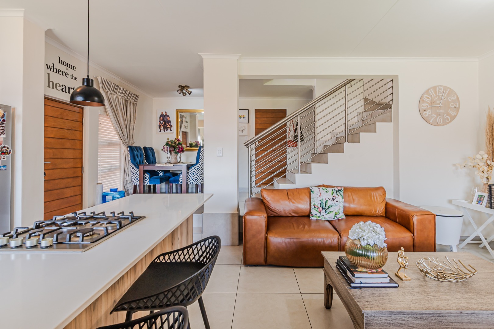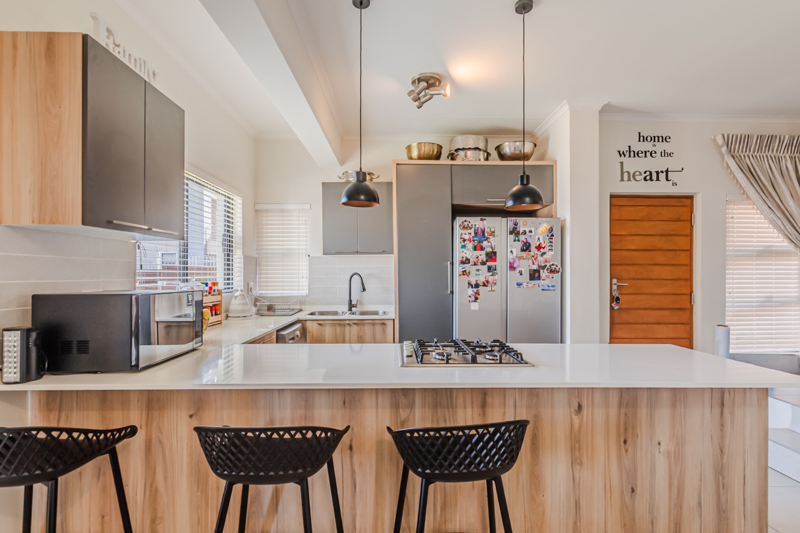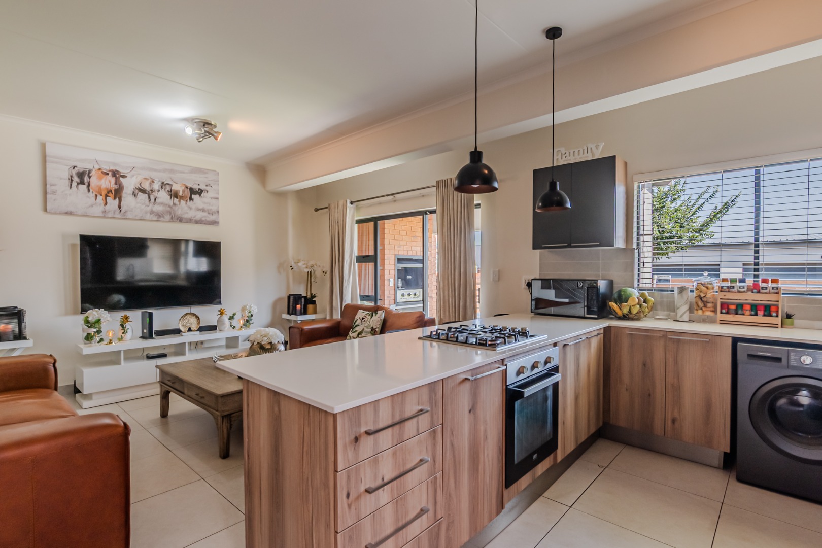 Discover modern living in this inviting 3-bedroom, 2.5 bathroom home located within a secure estate in Louwlardia, Centurion. Spanning a generous 161 sqm under roof on a 530 sqm erf, this residence offers a contemporary open-plan design, perfect for comfortable family life and entertaining. The heart of the home features a sleek, modern kitchen equipped with a gas hob, built-in oven, and ample white countertops, complemented by stylish wood-grain and dark grey cabinetry. An integrated washing machine adds to the kitchen's functionality, while large windows and sliding doors ensure abundant natural light throughout the living and dining areas.