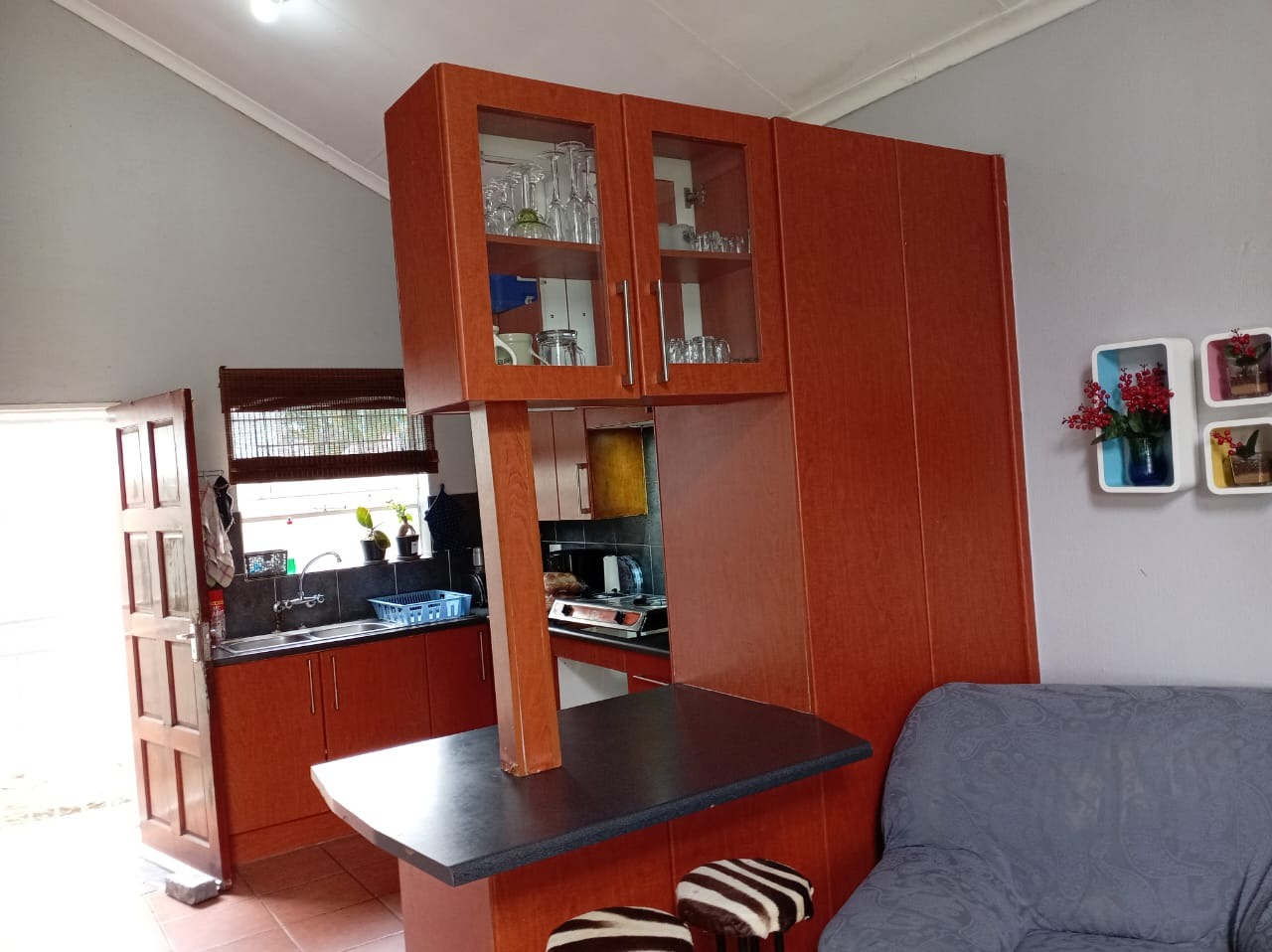 The kitchen is both practical and expressive — ample cabinetry, a fitted stove, and a glass display cabinet that adds character while showcasing your finer touches. It flows effortlessly into the spacious lounge, where sliding doors open onto a manicured wrap-around garden — creating that rare indoor-outdoor connection buyers are always searching for.