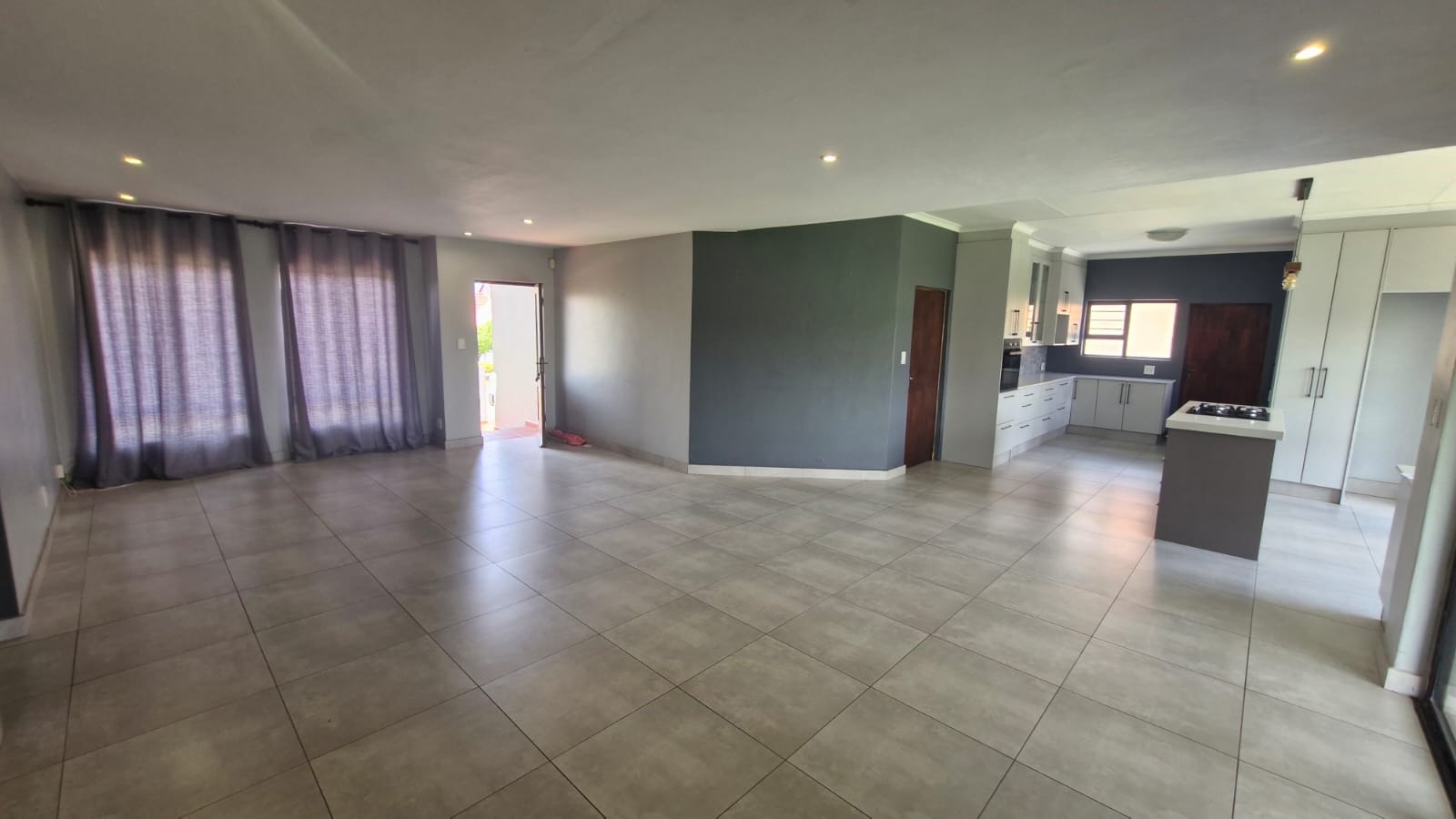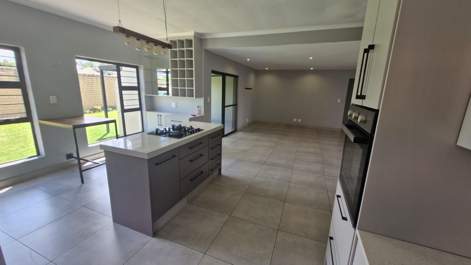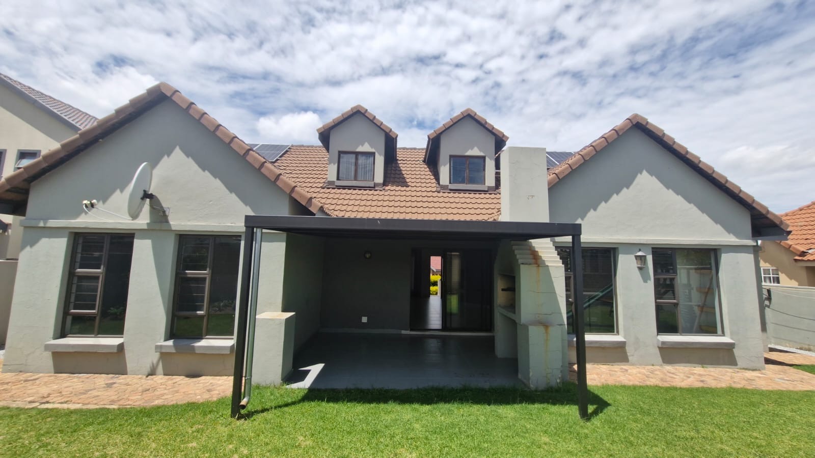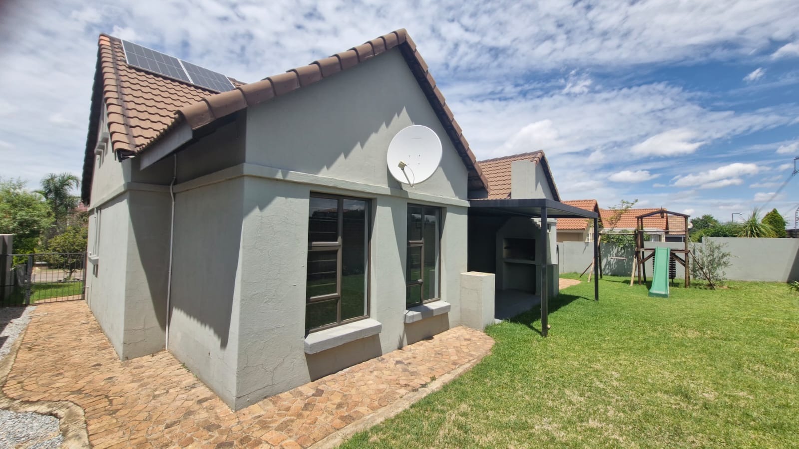 Discover this modern 3-bedroom, 2-bathroom home situated within a secure estate in Kosmosdal, Centurion. The property boasts an attractive, well-maintained exterior with a warm grey finish, tiled roof, and charming dormer windows, complemented by a double garage with wooden doors and a distinct cobblestone driveway. Manicured landscaping enhances its inviting kerb appeal. The interior features an open-plan layout, seamlessly connecting the living and kitchen areas. Modern light-colored tiled flooring, recessed lighting, and neutral grey walls create a contemporary ambiance. The kitchen is a highlight, equipped with grey cabinetry, light countertops, a central island with a gas hob, a built-in oven, and ample storage including a pantry. Large windows and sliding doors ensure abundant natural light throughout. Accommodation includes three comfortable bedrooms, with one featuring an en-suite bathroom. Bedrooms offer modern dark laminate flooring, built-in wardrobes, and two-tone paint schemes, providing both style and practicality. The home also benefits from a family TV room and a dedicated dining area. Outdoor living is catered for with a private garden, a built-in braai for entertaining, and access to a communal pool and club house within the estate. Practical features include air conditioning, solar panels, a battery inverter, and fibre connectivity, ensuring comfort and efficiency. Security is paramount with 24-hour security and burglar bars. Kosmosdal offers a convenient lifestyle in Centurion, known for its accessibility and growing community. This area provides a balance of suburban tranquility and easy access to urban amenities. Key Features: * 3 Bedrooms, 2 Bathrooms (1 En-suite) * Modern Open-Plan Living & Kitchen * Double Garage & 4 Parking Spaces * Private Garden with Built-in Braai * Communal Pool & Club House Access * Solar Panels & Battery Inverter * Fibre Connectivity & Air Conditioning * 24-Hour Security Estate with Burglar Bars * 500 sqm Erf Size, 255 sqm Floor Size