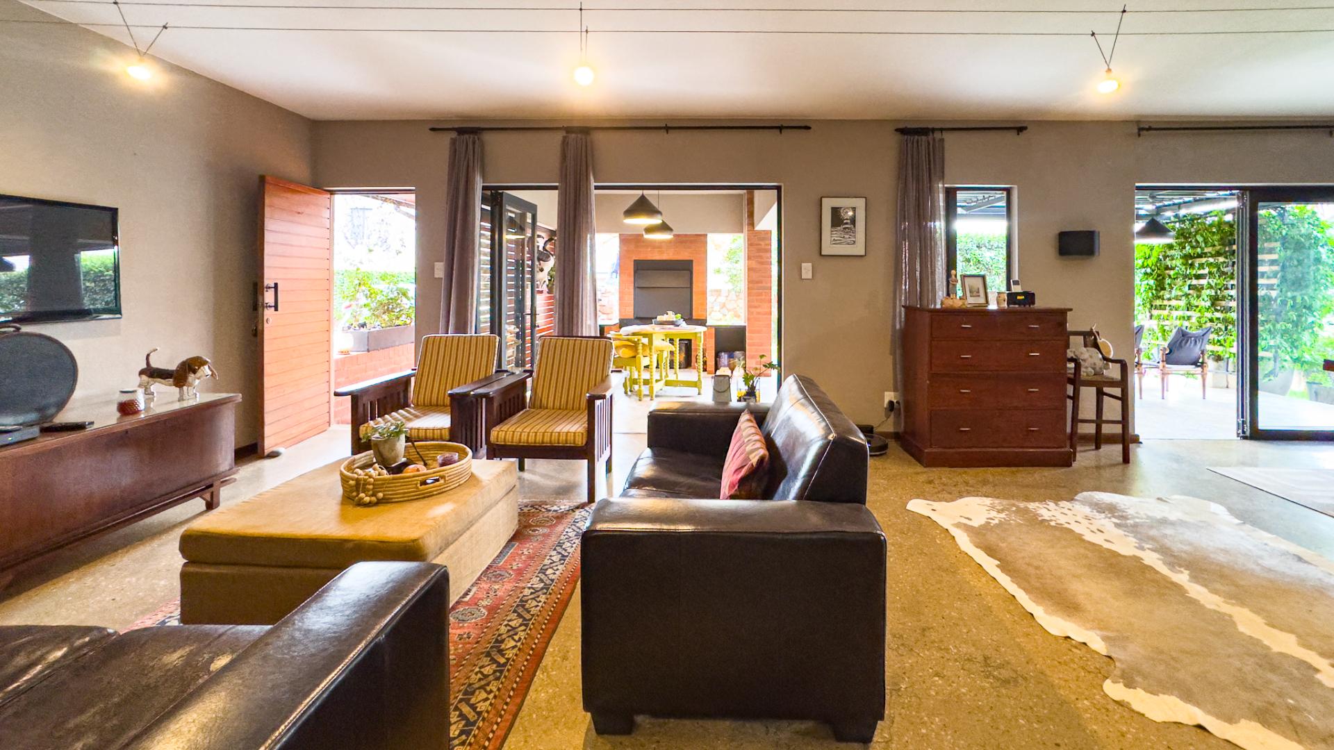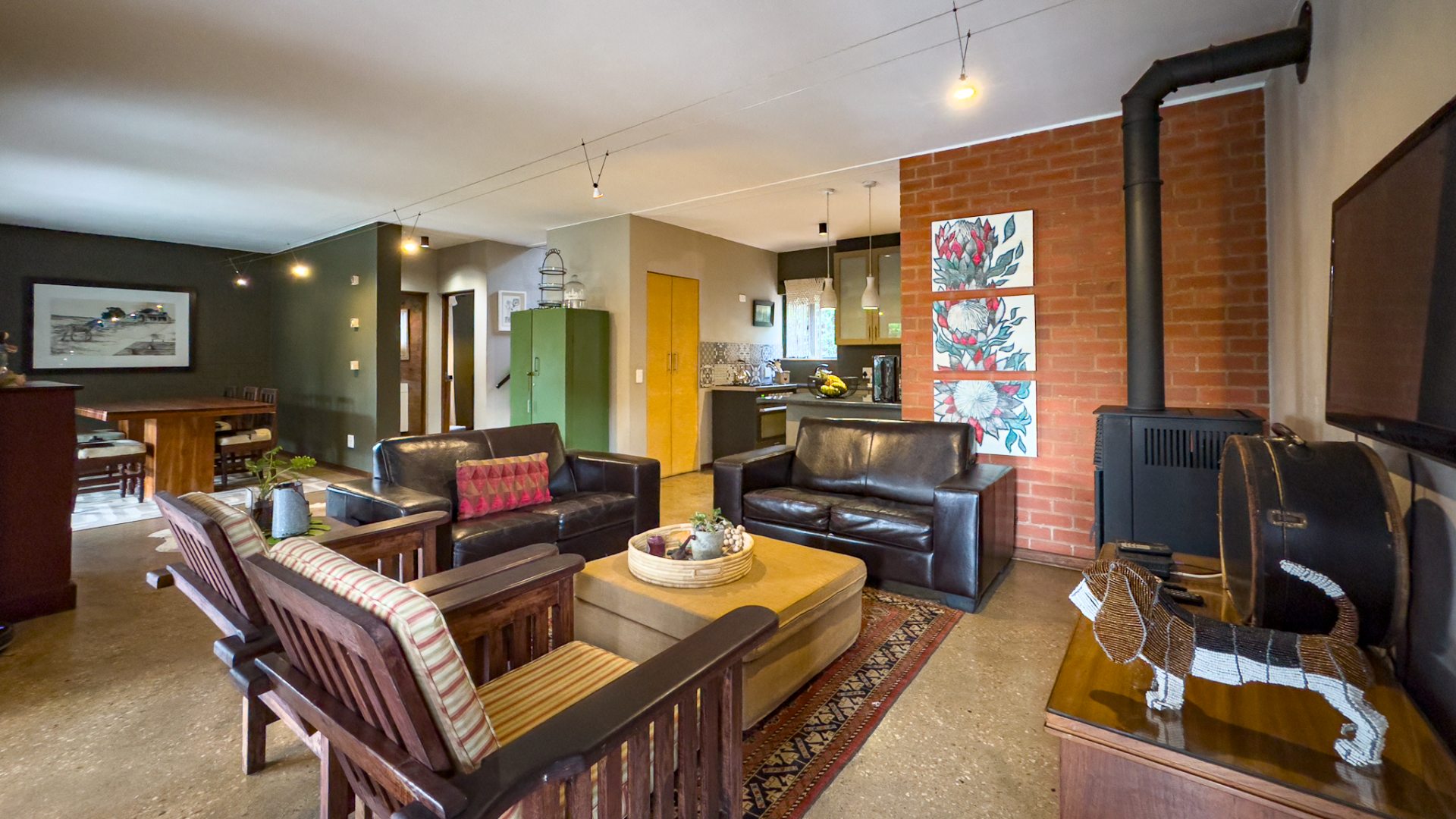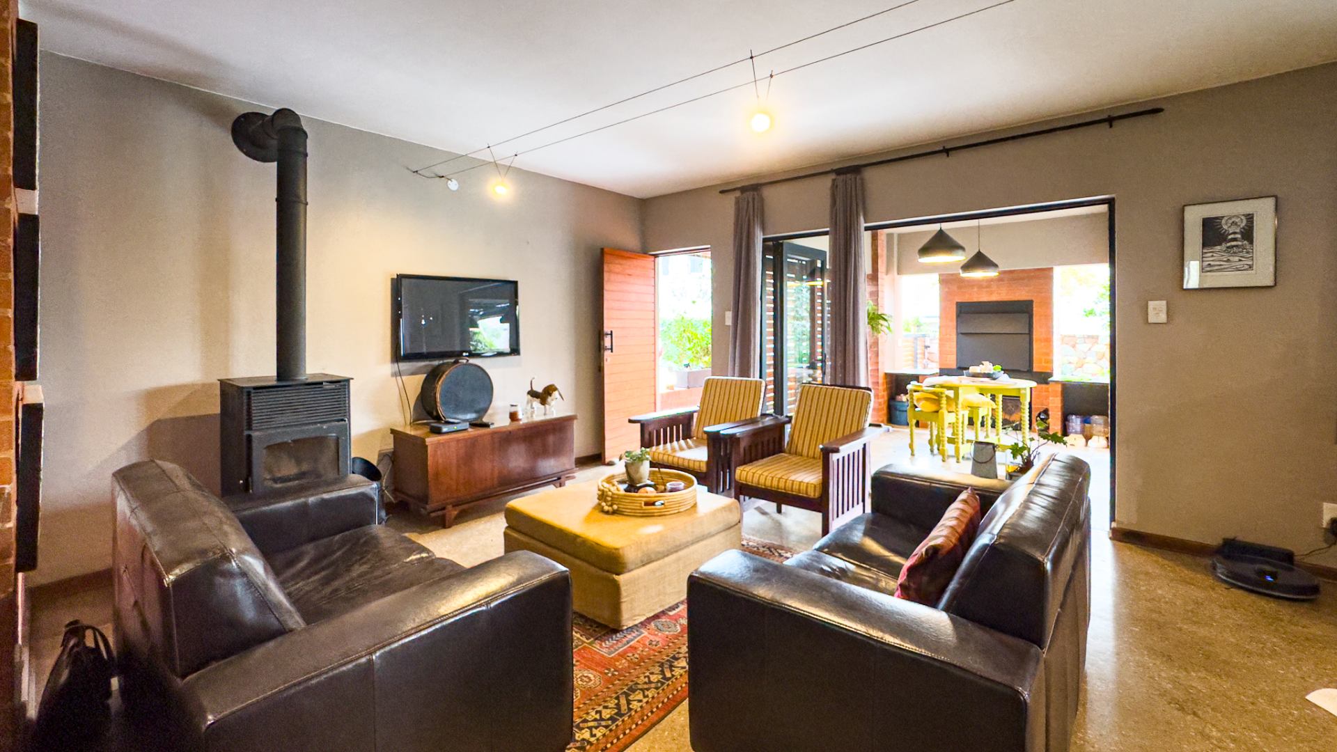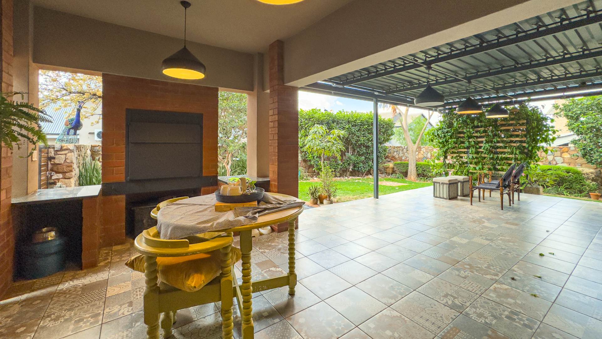 The open-plan lounge and dining area welcomes you with natural light and warmth, featuring a fireplace and seamless flow to a spacious covered entertainment patio with a built-in braai, set beneath a louvre deck and overlooking a lush, landscaped garden – ideal for hosting or relaxing year-round.