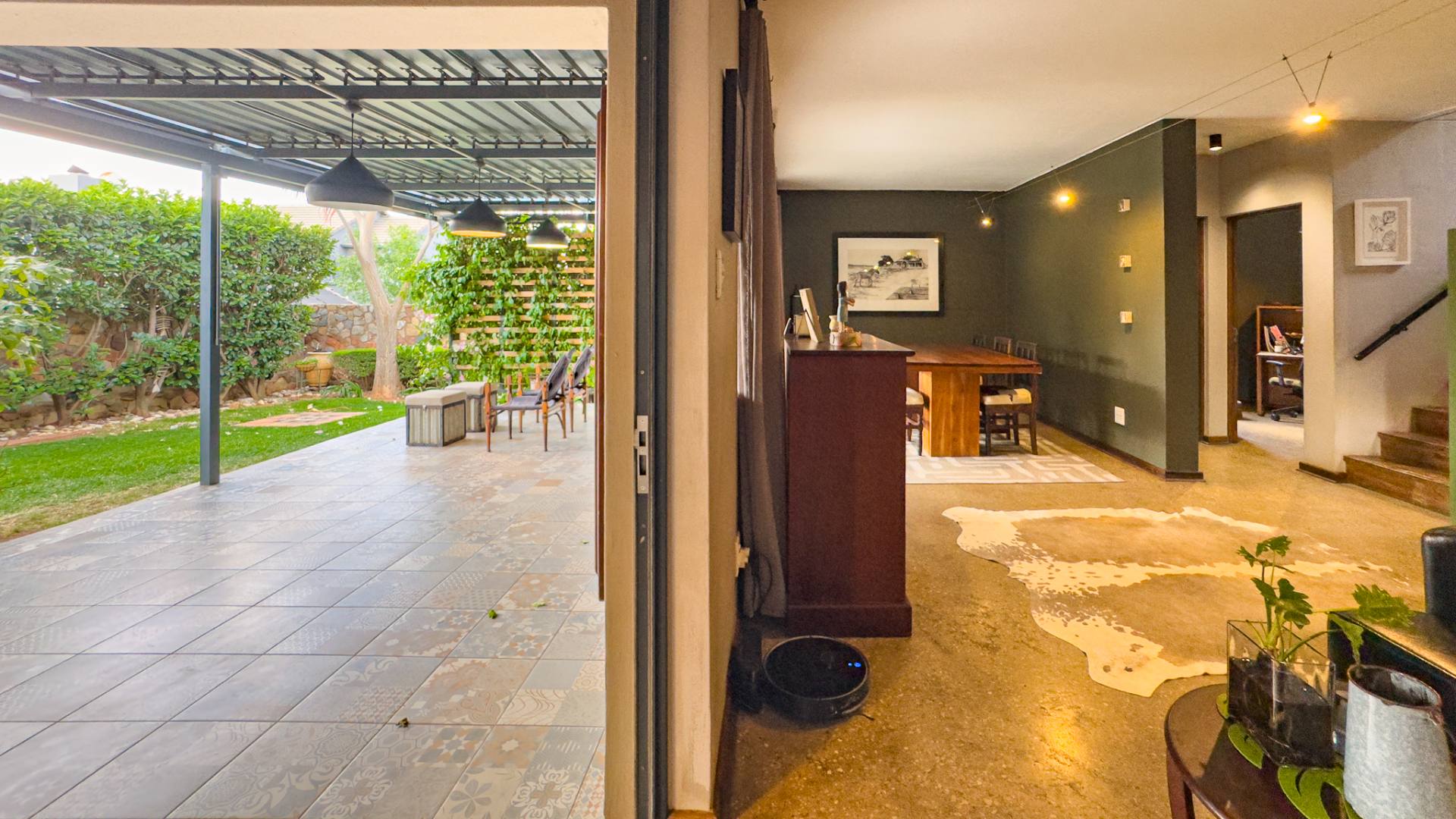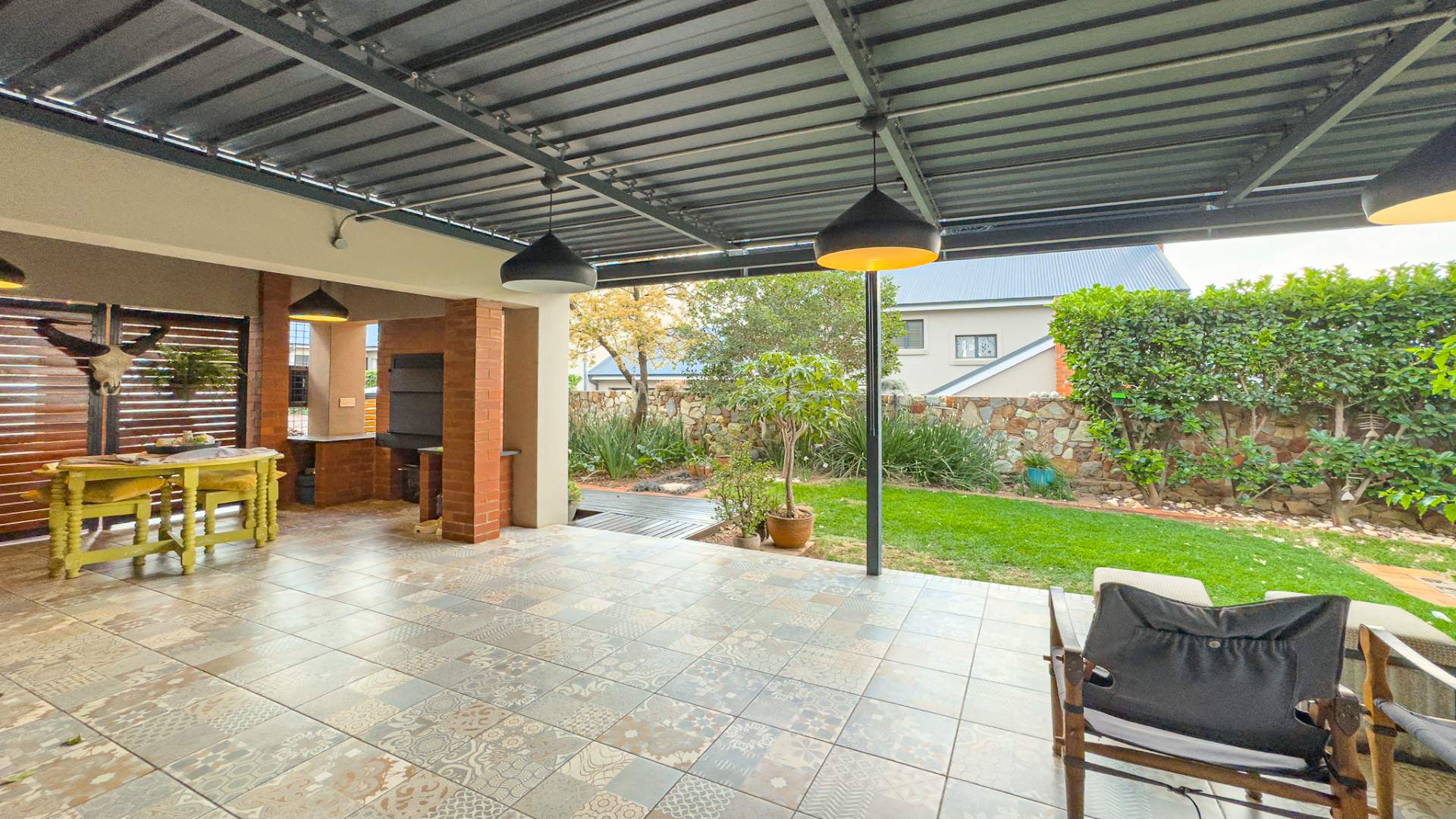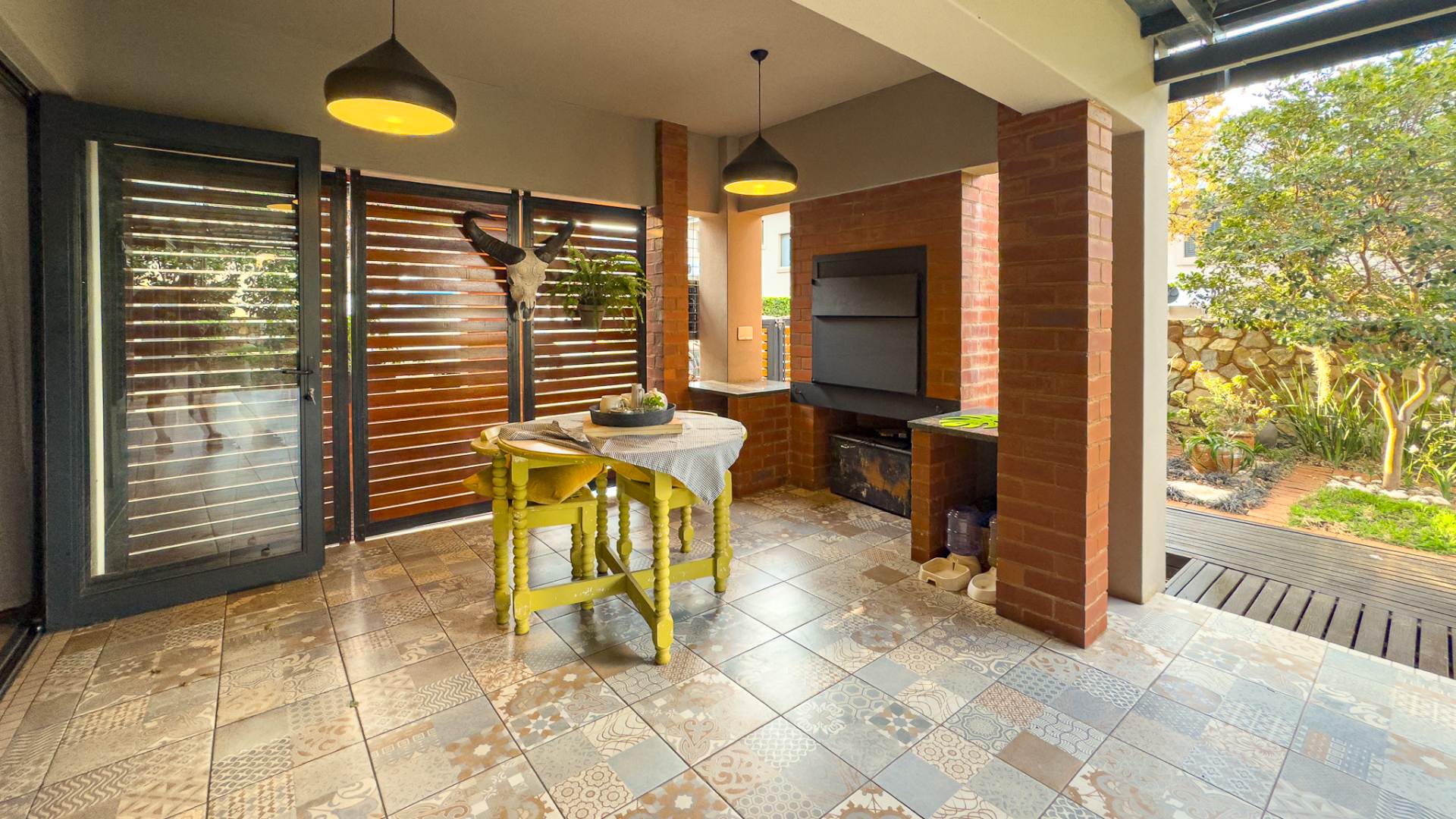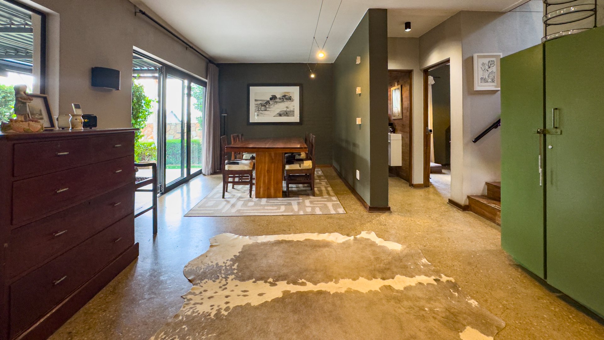 The open-plan lounge and dining area welcomes you with natural light and warmth, featuring a fireplace and seamless flow to a spacious covered entertainment patio with a built-in braai, set beneath a louvre deck and overlooking a lush, landscaped garden – ideal for hosting or relaxing year-round.