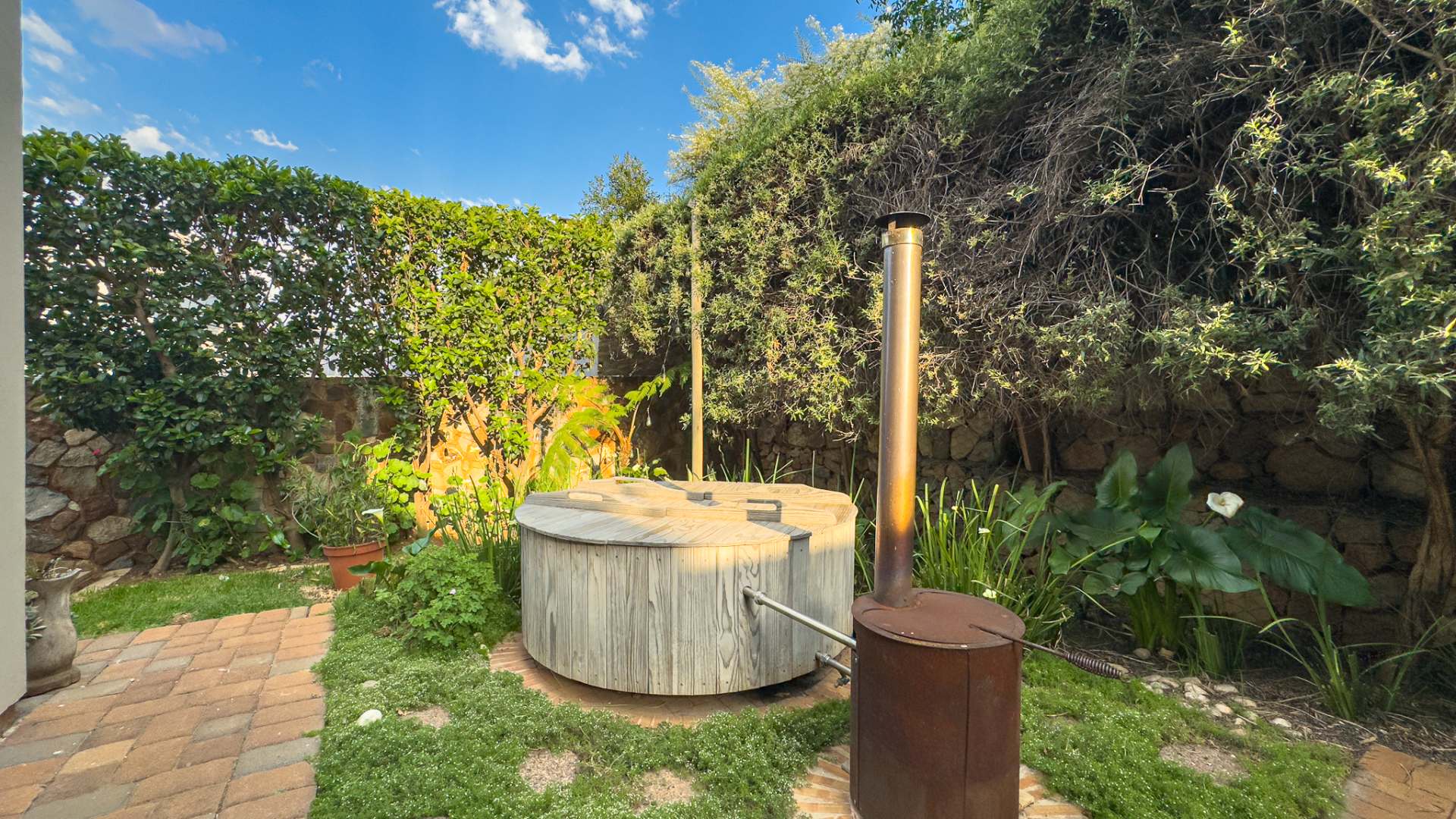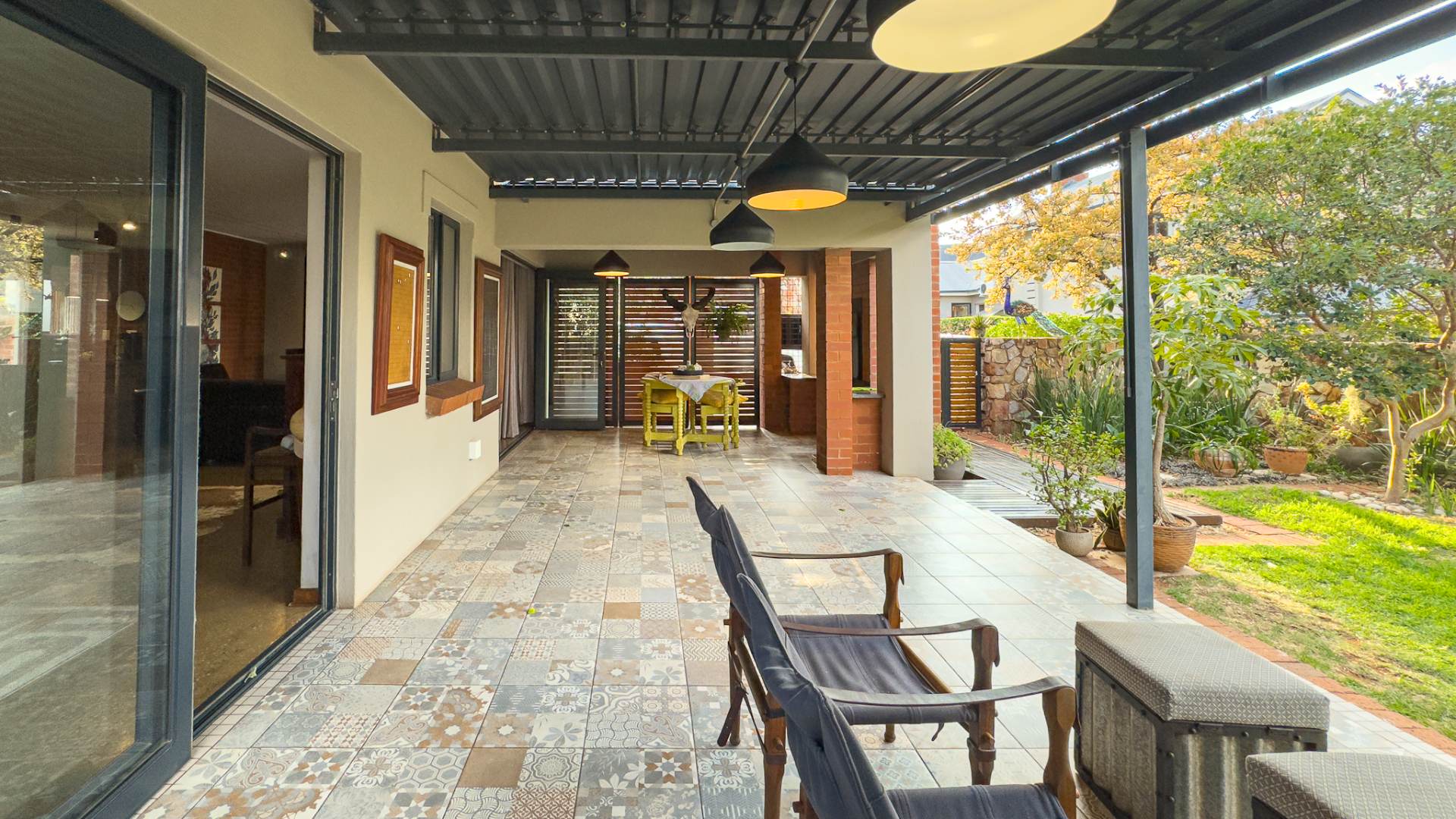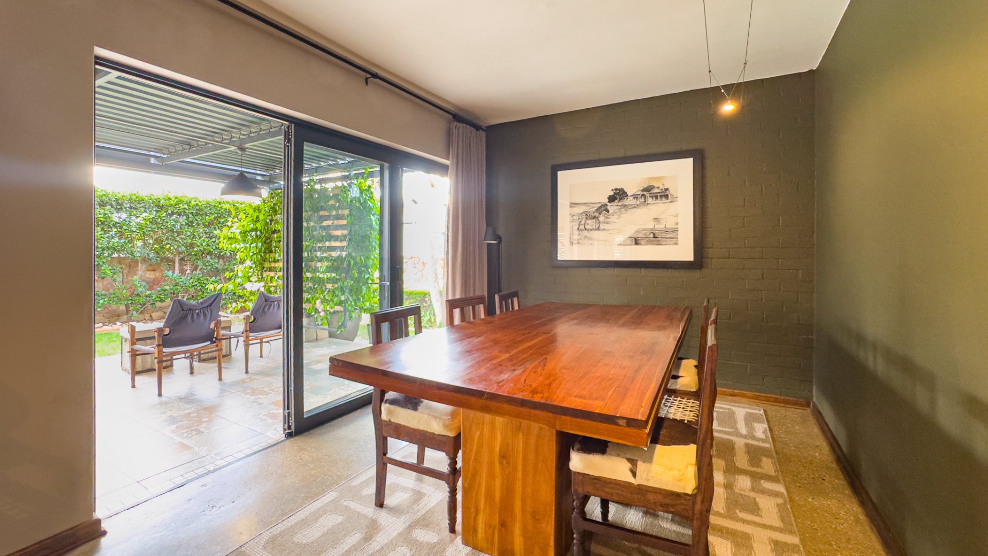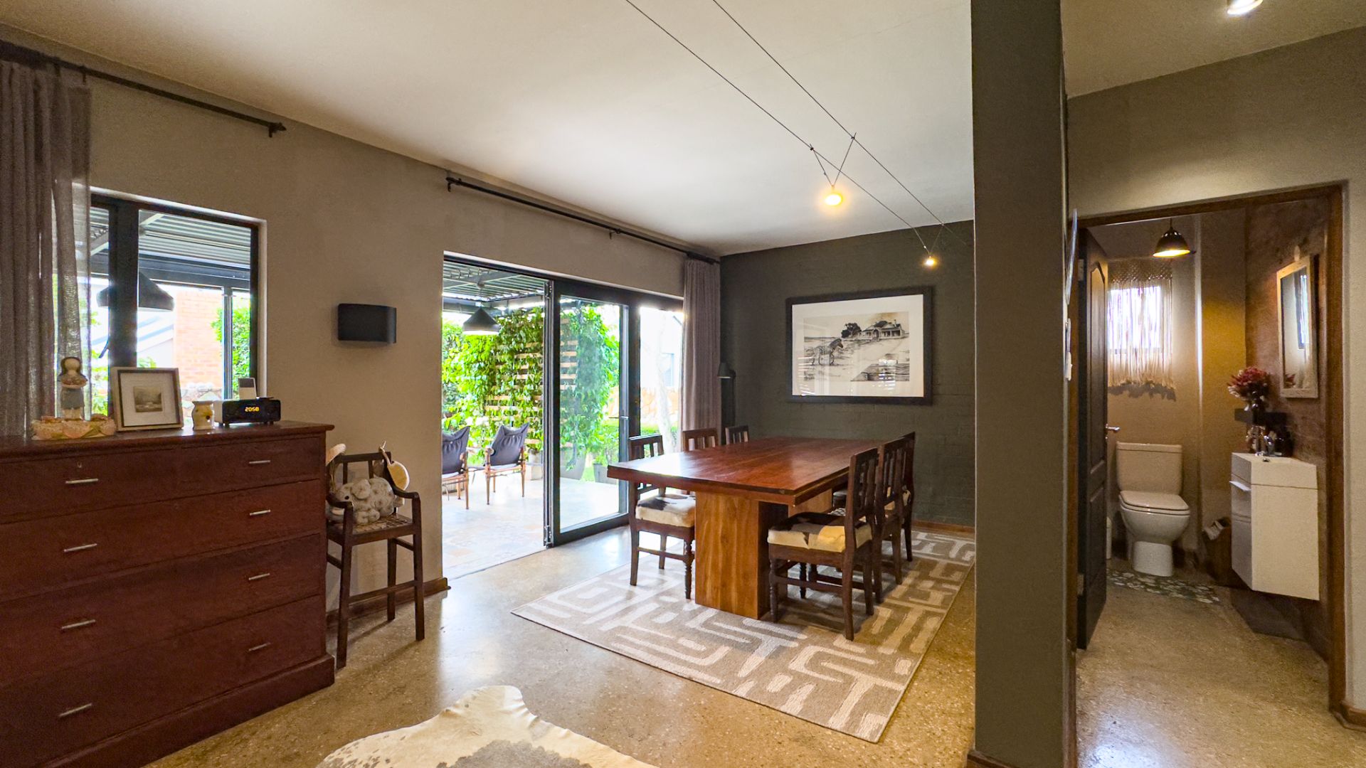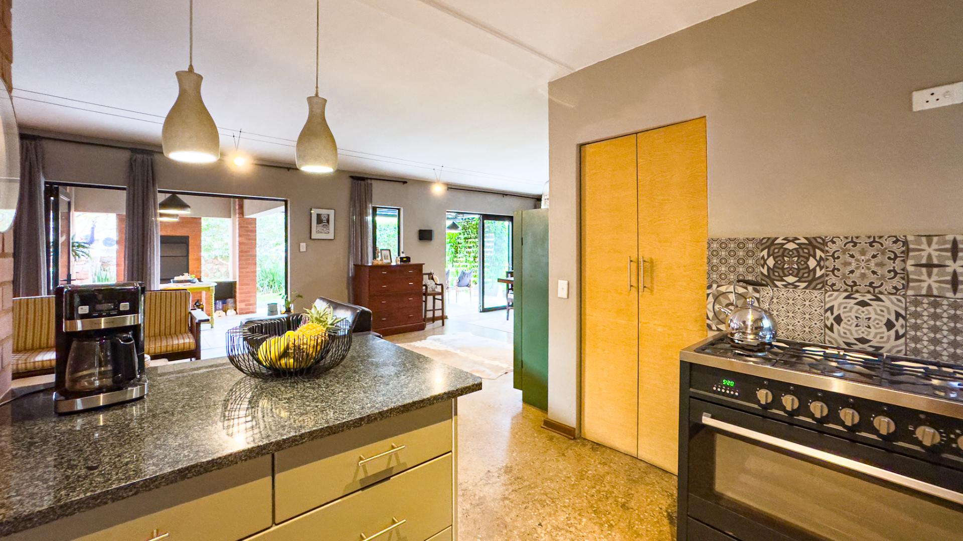 The open-plan lounge and dining area welcomes you with natural light and warmth, featuring a fireplace and seamless flow to a spacious covered entertainment patio with a built-in braai, set beneath a louvre deck and overlooking a lush, landscaped garden – ideal for hosting or relaxing year-round.