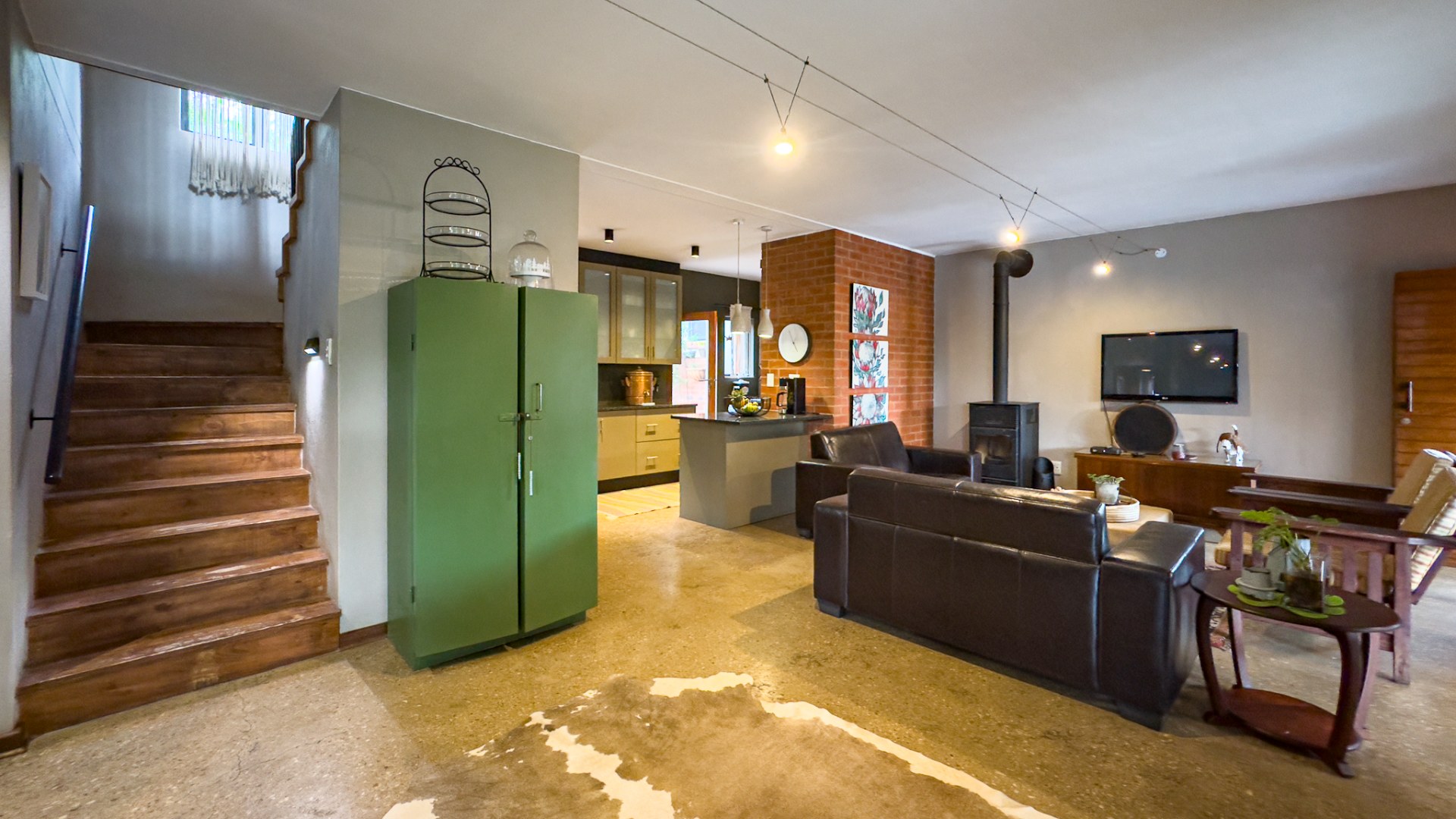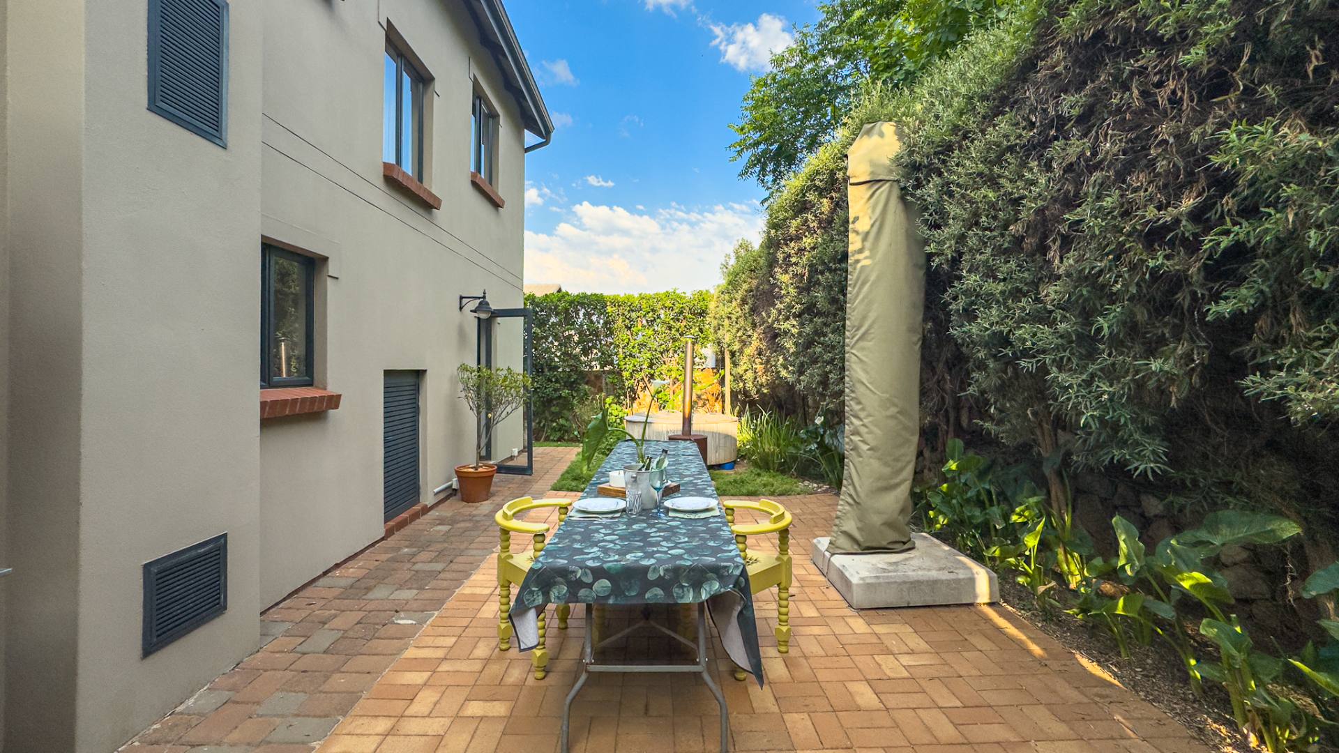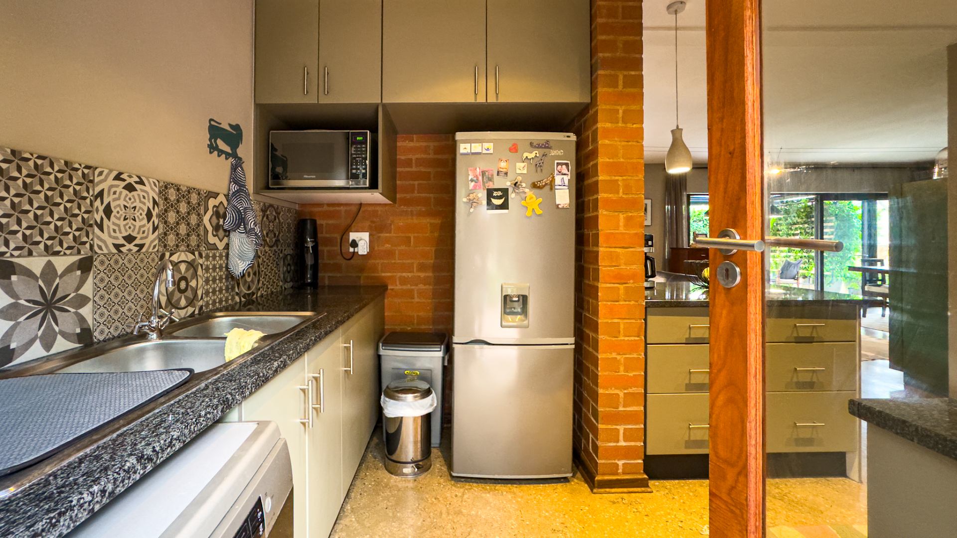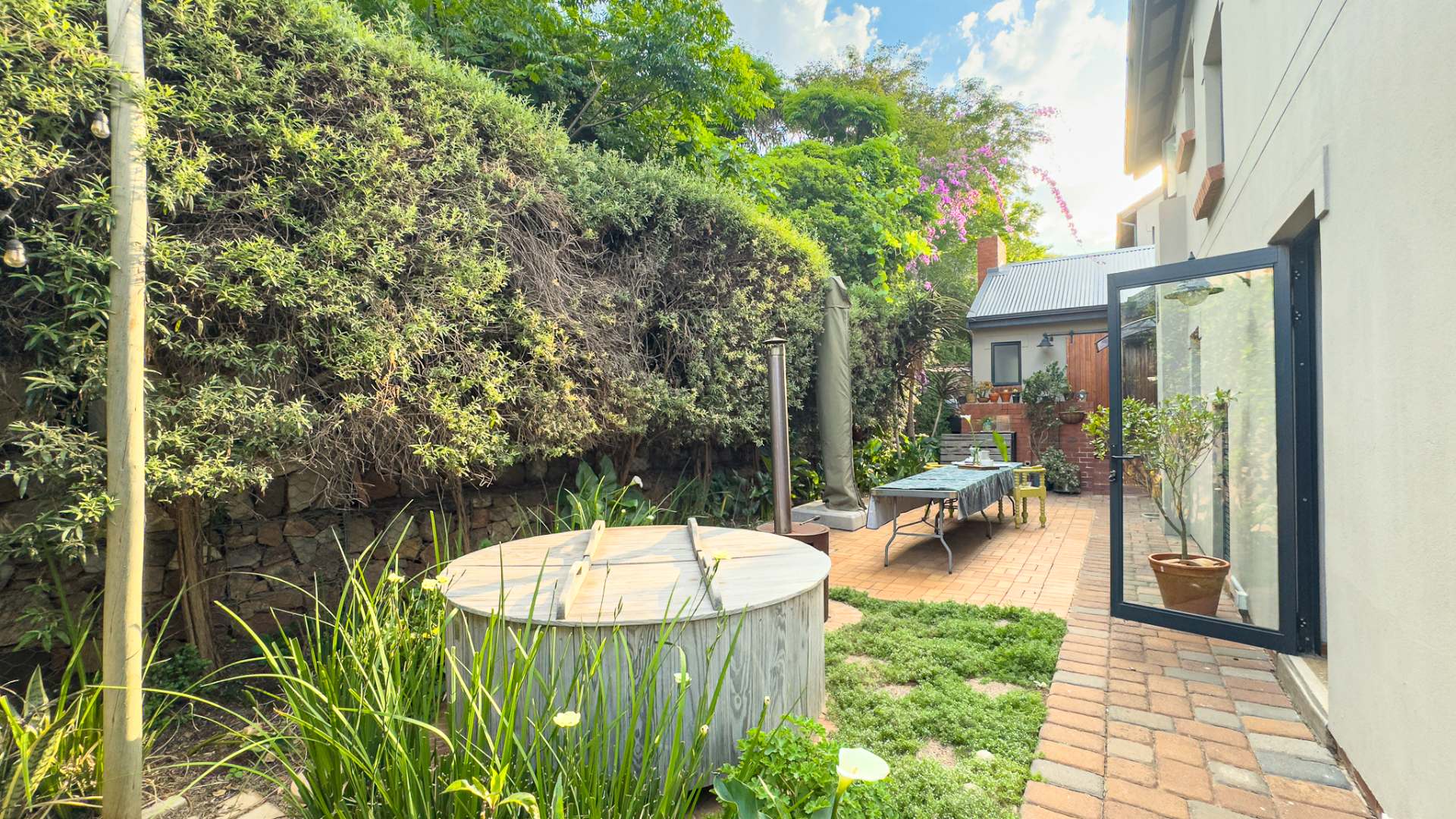The open-plan lounge and dining area welcomes you with natural light and warmth, featuring a fireplace and seamless flow to a spacious covered entertainment patio with a built-in braai, set beneath a louvre deck and overlooking a lush, landscaped garden – ideal for hosting or relaxing year-round.
